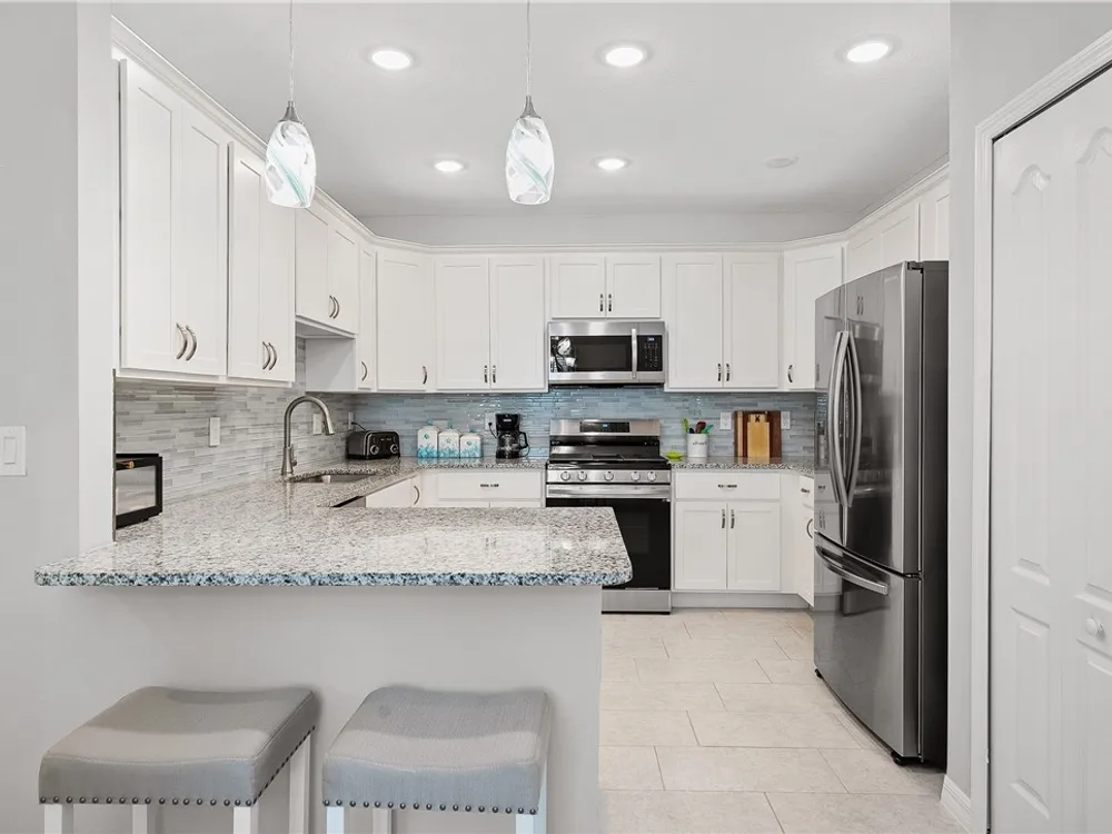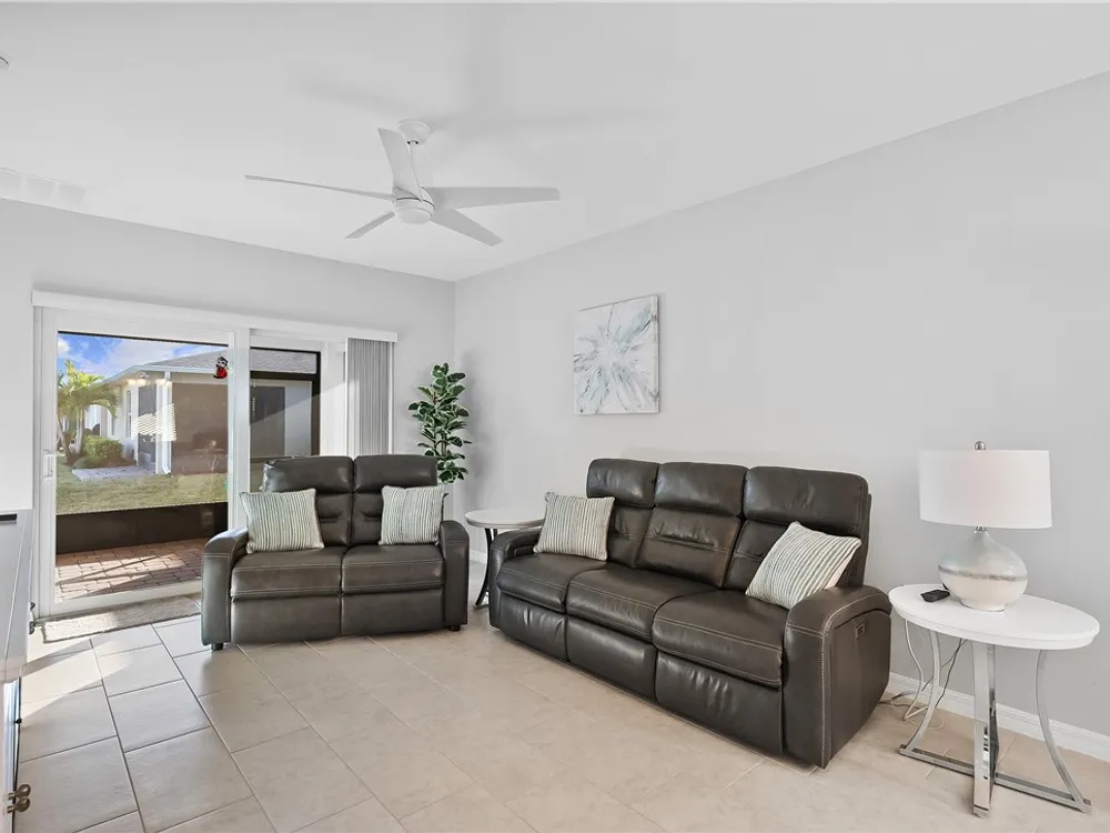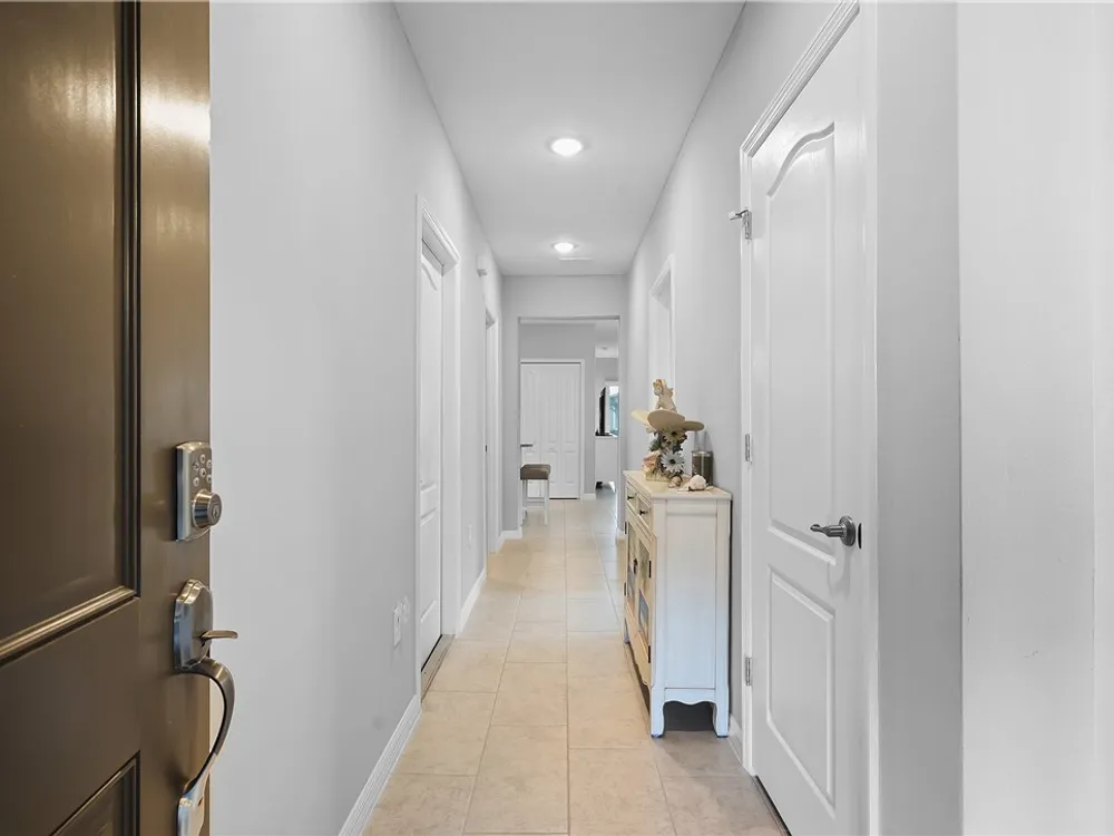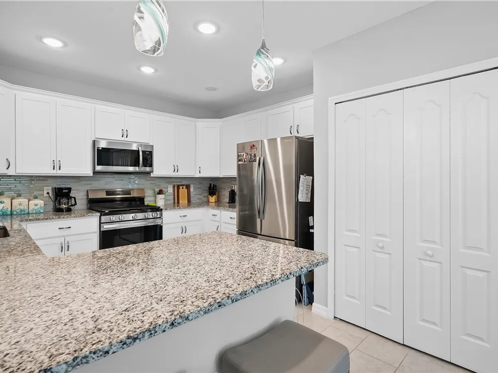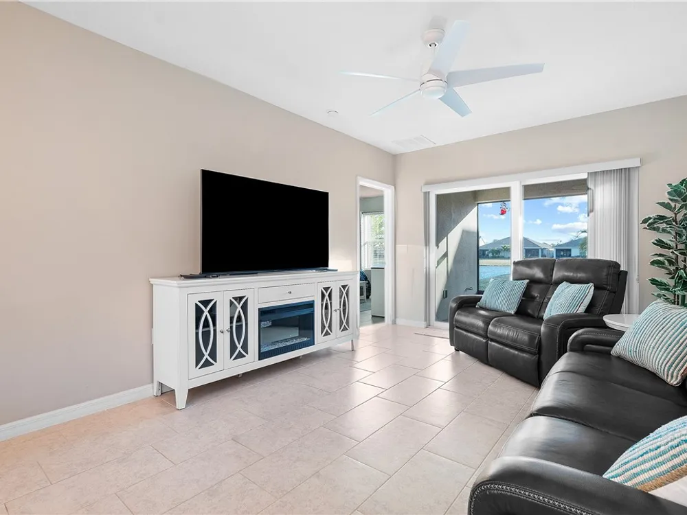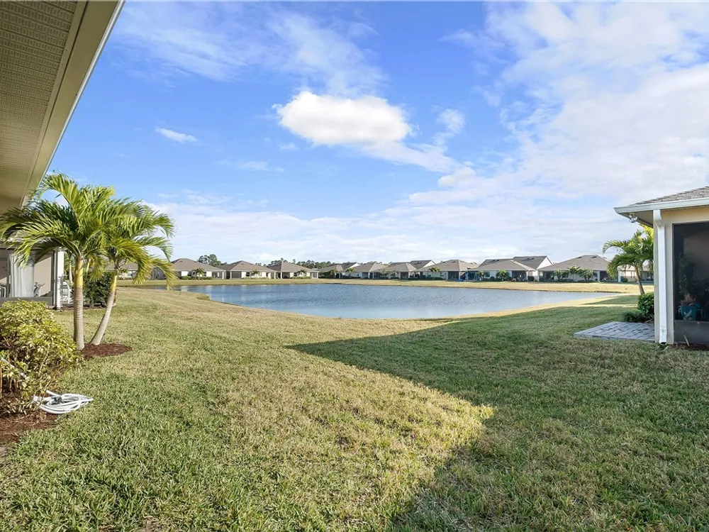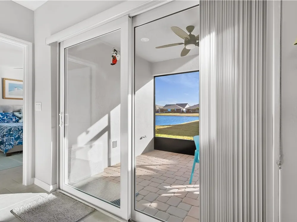 MOVE IN READY! 3/2 Villa with 1 car garage in Harmony Reserve! Active 55+ community w/low maintenance cost. IMPACT GLASS, Luxury Kitchen w/white cabinets, granite counter tops, glass tile backsplash, SS appliances & natural Gas. Plank tile throughout. Enjoy relaxing on the covered patio w/view of the lake or walk to community clubhouse with pool & pickleball. Harmony Reserve is an amenity rich lifestyle!