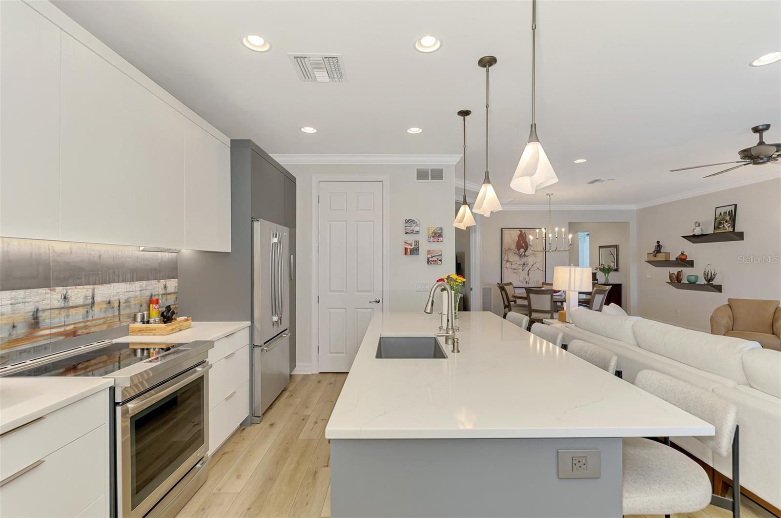 Experience luxury living in this model-like 3BR, 2B home with a den/office and sparkling, heated pool. Light-filled open floor plan with water views flows seamlessly to an outdoor entertaining area. A brand-new roof (October 2025) and high-impact windows (2024) with remote-controlled, high-impact hurricane shades for the sliders adds peace of mind. This home offers a perfect blend of style, comfort & privacy on a cul-de-sac—just 20 minutes from Sarasota’s award-winning beaches and 30 minutes to vibrant downtown Sarasota. The designer kitchen embodies elegance with crisp white and gray cabinetry, sleek quartz surfaces, and a large island with seating. Stainless steel appliances, custom tile backsplash, and pendant lighting add a touch of modern flair. The dining nook has a high-end cabinet with pullouts. High 8-foot interior doors. Detailed crown molding adorns the high ceilings enhancing the home’s airy, upscale feel. Luxury vinyl plank flooring throughout most of the home. Relax and entertain effortlessly in the light-filled great room that opens to a private pool and screened lanai—your own backyard oasis. The spacious primary suite features a walk-in closet with custom built-ins for optimal organization, including drawers, shelving, and hanging space. The newly remodeled master bathroom — a luxurious retreat designed for both comfort and style. This elegant space features an enlarged walk-in shower with frameless glass doors, accented by modern tile work and high-end fixtures while updated lighting, two separate vanities and mirrors add a touch of sophistication. Warm, neutral tones and carefully selected finishes tie the space together, creating a serene and inviting atmosphere. The guest bathroom has been remodeled as well. This amazing home features an oversized garage with additional storage space. An abundance of lush Florida landscaping surrounds the home. A preserve area to one side of the home offers additional privacy. The Isles is a maintenance-free community. Socialize & make new friends in The Isles at the many community functions. There are 4 tennis courts, 2 pickle ball courts, 2 bocce courts, basketball court, tot-lot, state of the art fitness center and resort-style swimming pool for your enjoyment. The Isles is close to the world-renowned Siesta Key Beach, fine dining, doctors, golf courses, Legacy Trail and all the cultural venues downtown Sarasota has to provide. The Isles has an active pickleball and tennis community.