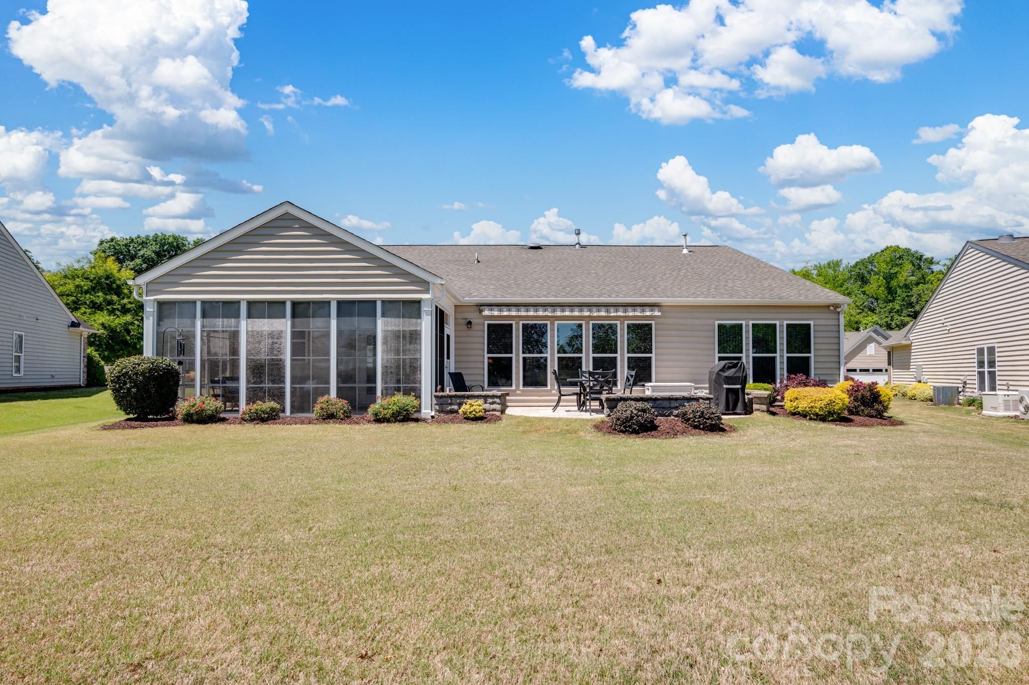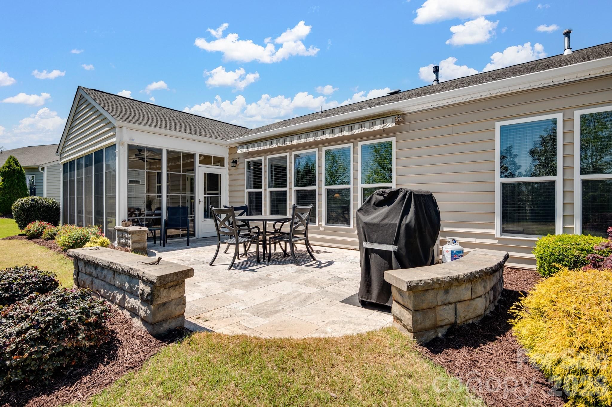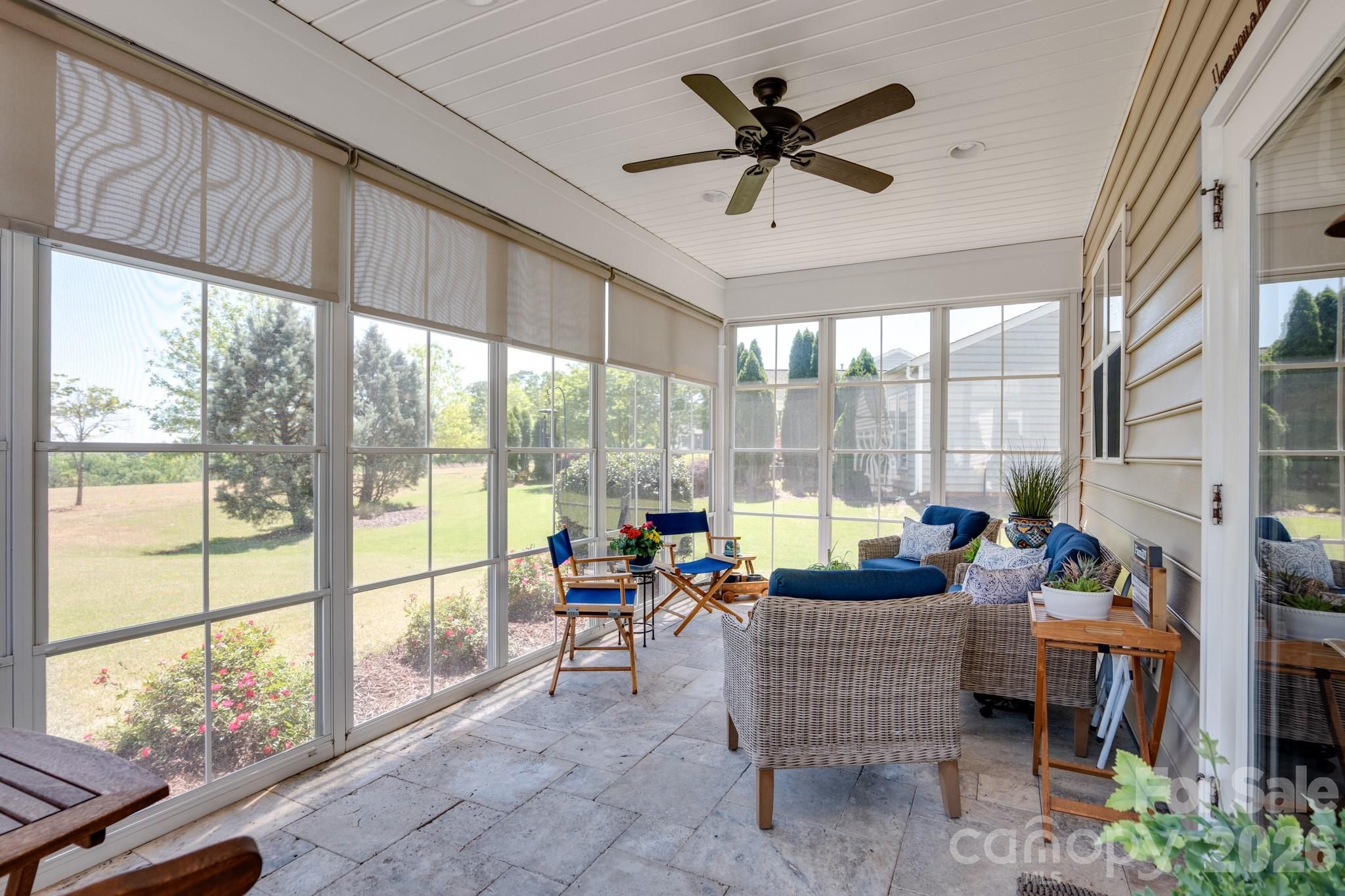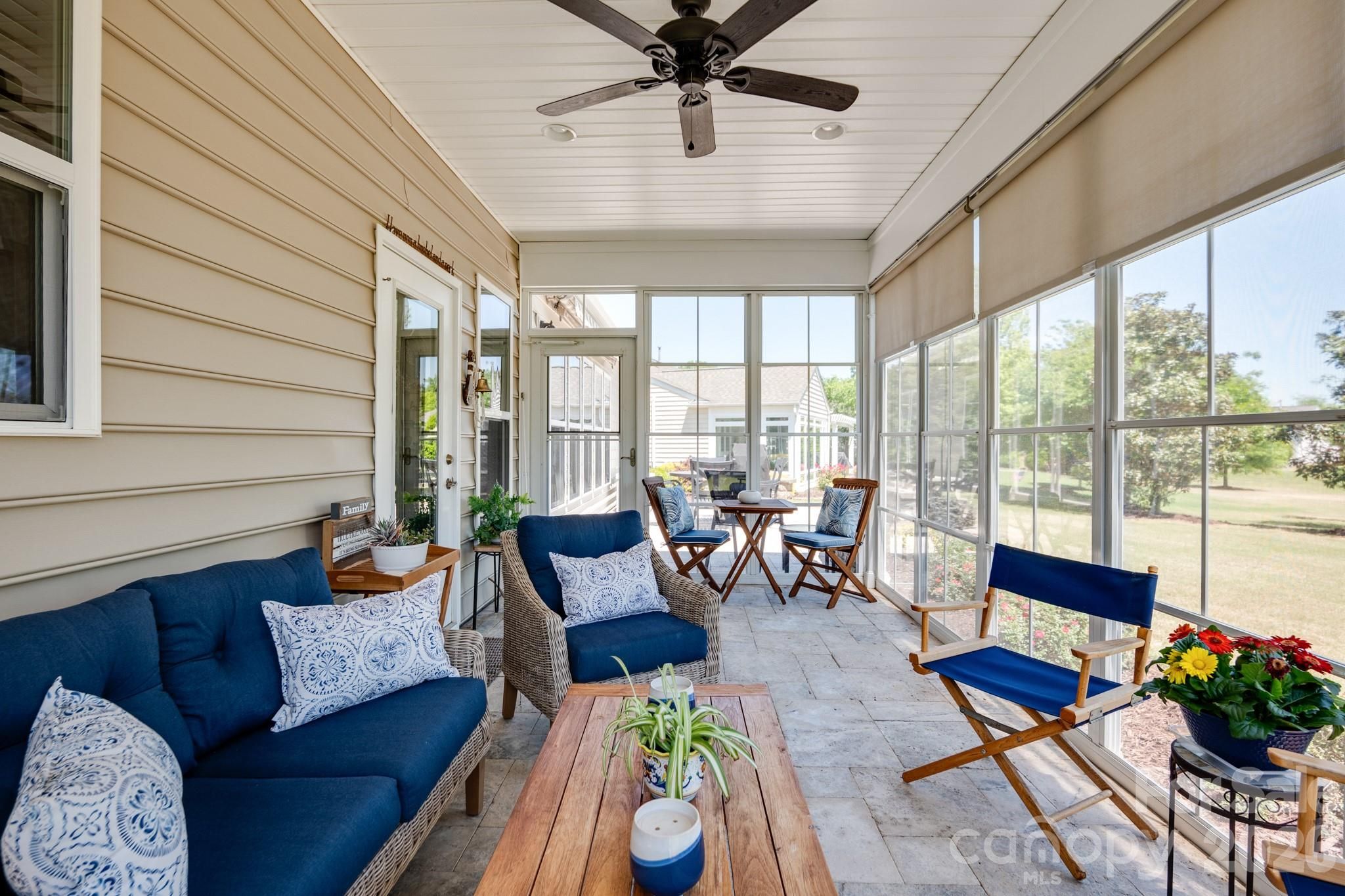Tucked within the amenity-rich community of Sun City Carolina Lakes, this beautifully maintained Crestwood Meadow model blends comfort, style, and everyday functionality. A charming paver walkway leads to a covered front entry, setting a welcoming tone. Inside, the foyer opens to a private home office framed by elegant double glass doors - an ideal space for remote work, creative pursuits, or quiet study. At the heart of the home, the open-concept great room invites gathering and relaxation, with a gas log fireplace and classic mantle. Designed for both everyday living and entertaining, the formal dining room features detailed wainscoting accents. The kitchen is thoughtfully positioned at the rear of the home and impresses with a large island, granite countertops, tile backsplash, stainless steel appliances, and a gas range, along with a sunny breakfast nook for casual meals. Just beyond, a light-filled sunroom offers peaceful backyard views and an inviting place to unwind. The primary suite, also located at the back of the home for added privacy, features a spacious ensuite bath with dual vanities, a glass-enclosed walk-in shower, dedicated vanity space, and a generous walk-in closet. Two well-sized guest bedrooms are situated at the front of the home with access to a full hall bath, providing flexibility for visitors or additional living space. Practical touches include a laundry room with built-in storage and a utility sink, as well as attic space currently used for extra storage. Outdoor living shines with a screened patio complete with a ceiling fan - perfect for enjoying warm spring days - and a custom patio that overlooks the expansive backyard. Residents enjoy access to an array of resort-style amenities, including golf, tennis, pickleball, scenic walking trails, water access, and a vibrant selection of social clubs, creating a lifestyle as exceptional as the home itself.