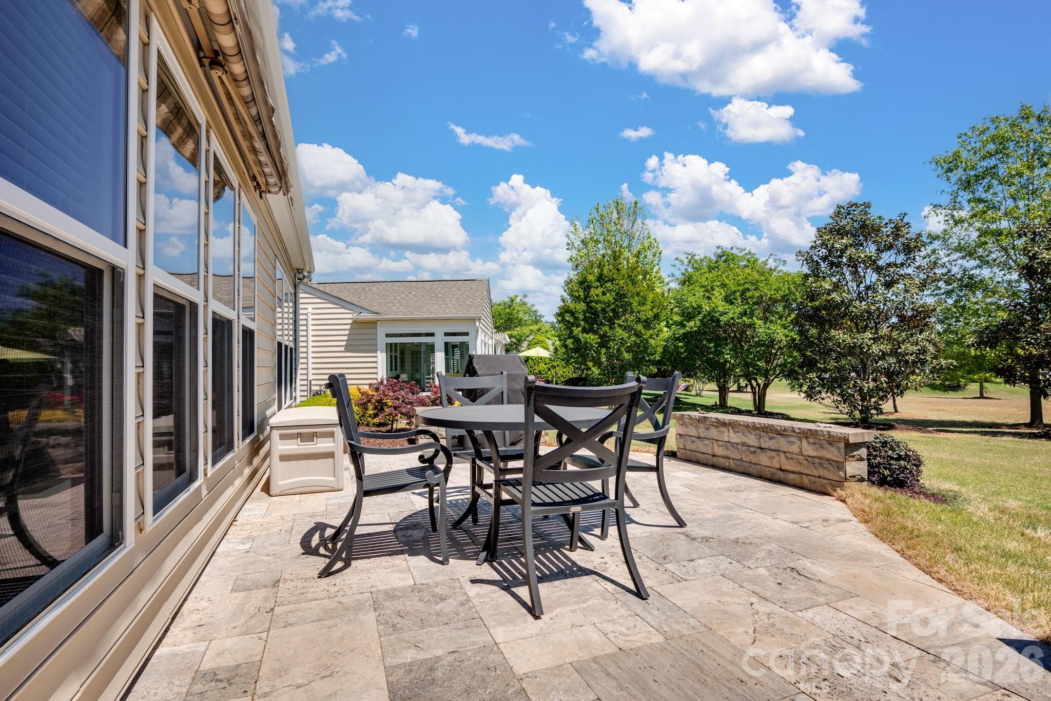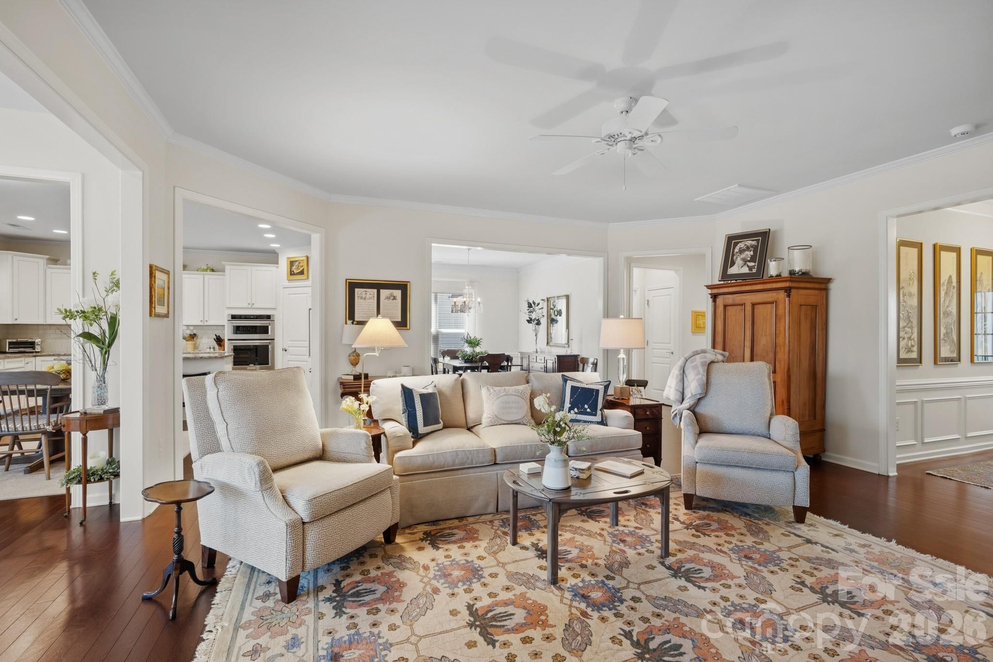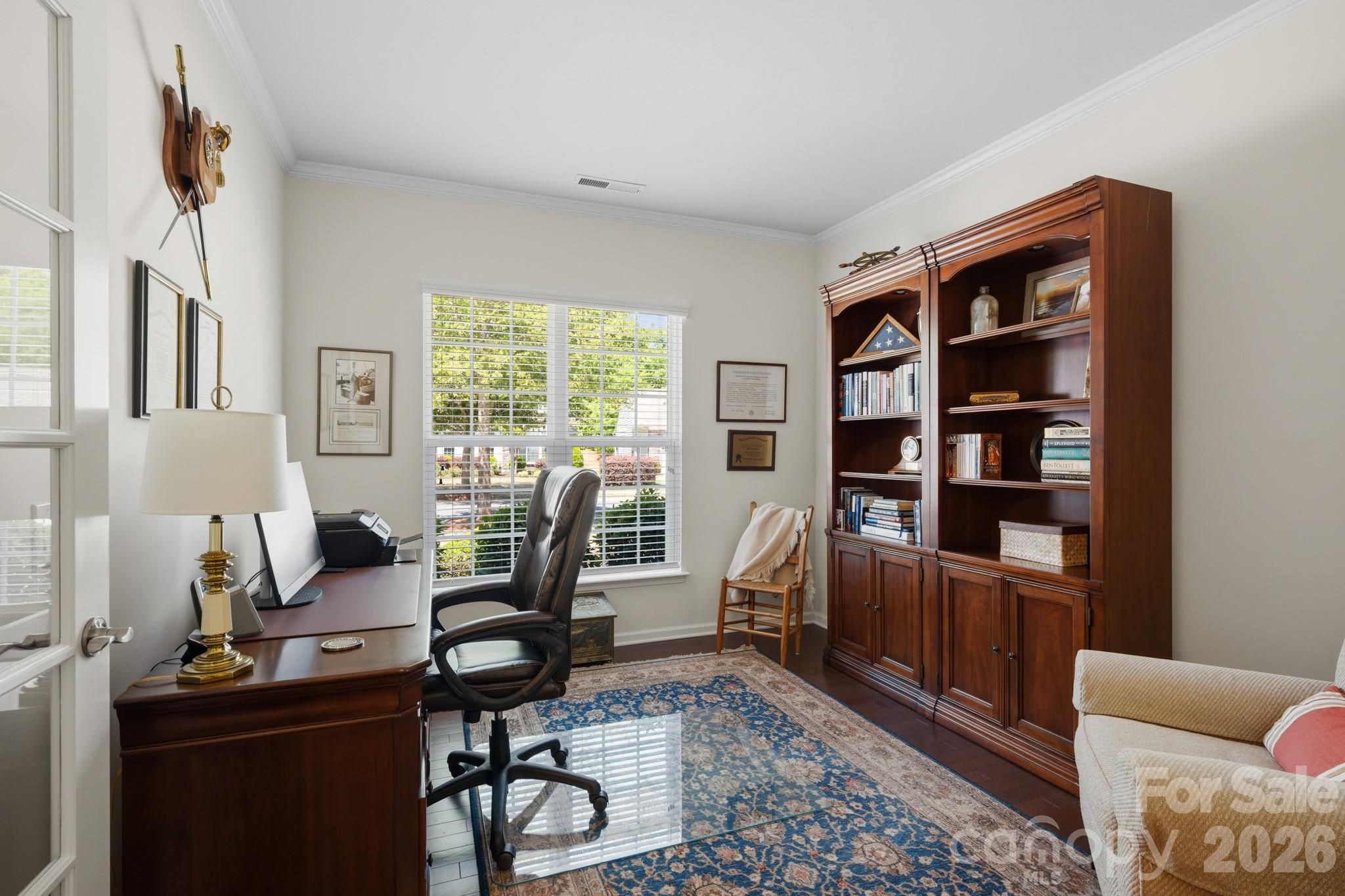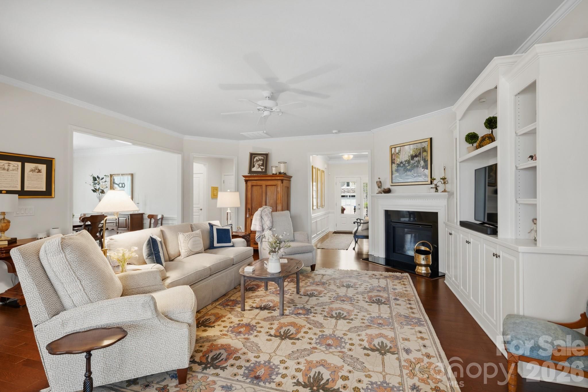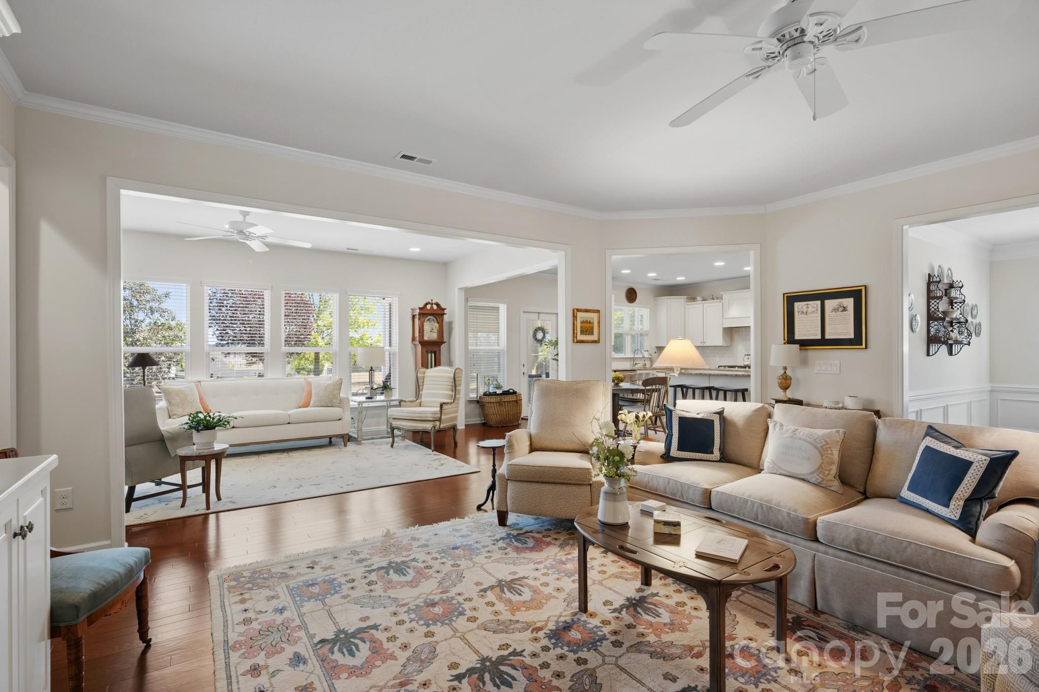 Tucked within the amenity-rich community of Sun City Carolina Lakes, this beautifully maintained Crestwood Meadow model blends comfort, style, and everyday functionality. A charming paver walkway leads to a covered front entry, setting a welcoming tone. Inside, the foyer opens to a private home office framed by elegant double glass doors - an ideal space for remote work, creative pursuits, or quiet study. At the heart of the home, the open-concept great room invites gathering and relaxation, with a gas log fireplace and classic mantle. Designed for both everyday living and entertaining, the formal dining room features detailed wainscoting accents. The kitchen is thoughtfully positioned at the rear of the home and impresses with a large island, granite countertops, tile backsplash, stainless steel appliances, and a gas range, along with a sunny breakfast nook for casual meals. Just beyond, a light-filled sunroom offers peaceful backyard views and an inviting place to unwind. The primary suite, also located at the back of the home for added privacy, features a spacious ensuite bath with dual vanities, a glass-enclosed walk-in shower, dedicated vanity space, and a generous walk-in closet. Two well-sized guest bedrooms are situated at the front of the home with access to a full hall bath, providing flexibility for visitors or additional living space. Practical touches include a laundry room with built-in storage and a utility sink, as well as attic space currently used for extra storage. Outdoor living shines with a screened patio complete with a ceiling fan - perfect for enjoying warm spring days - and a custom patio that overlooks the expansive backyard. Residents enjoy access to an array of resort-style amenities, including golf, tennis, pickleball, scenic walking trails, water access, and a vibrant selection of social clubs, creating a lifestyle as exceptional as the home itself.