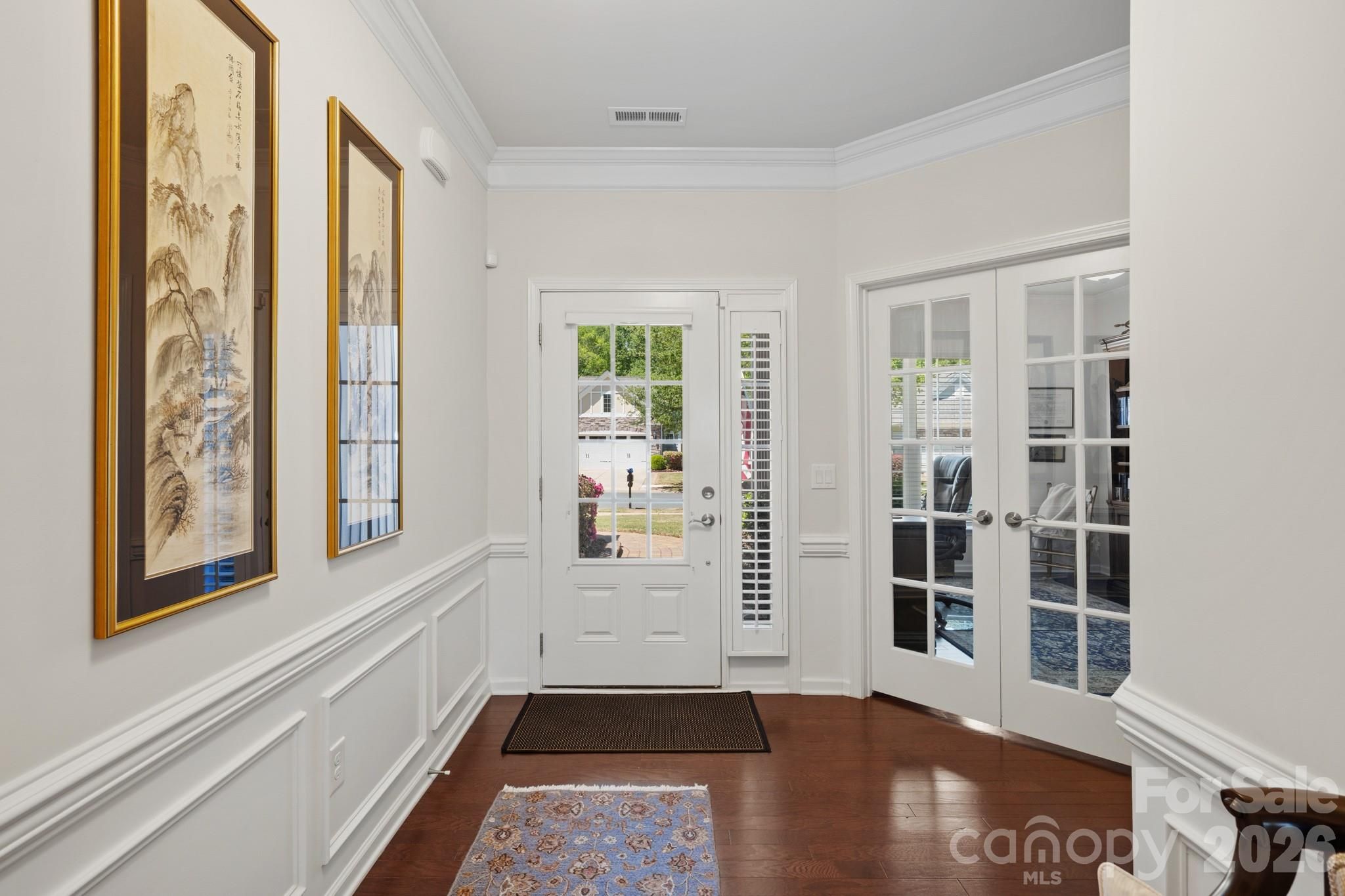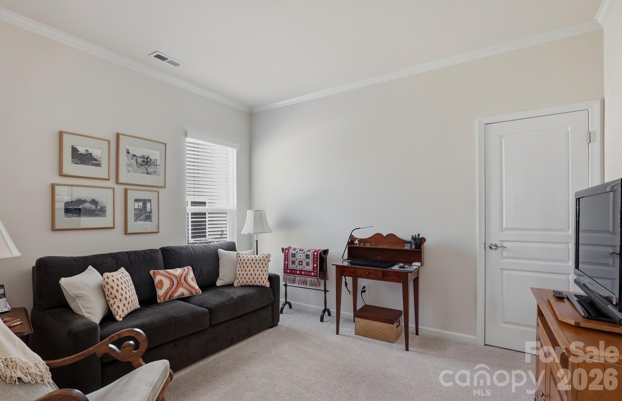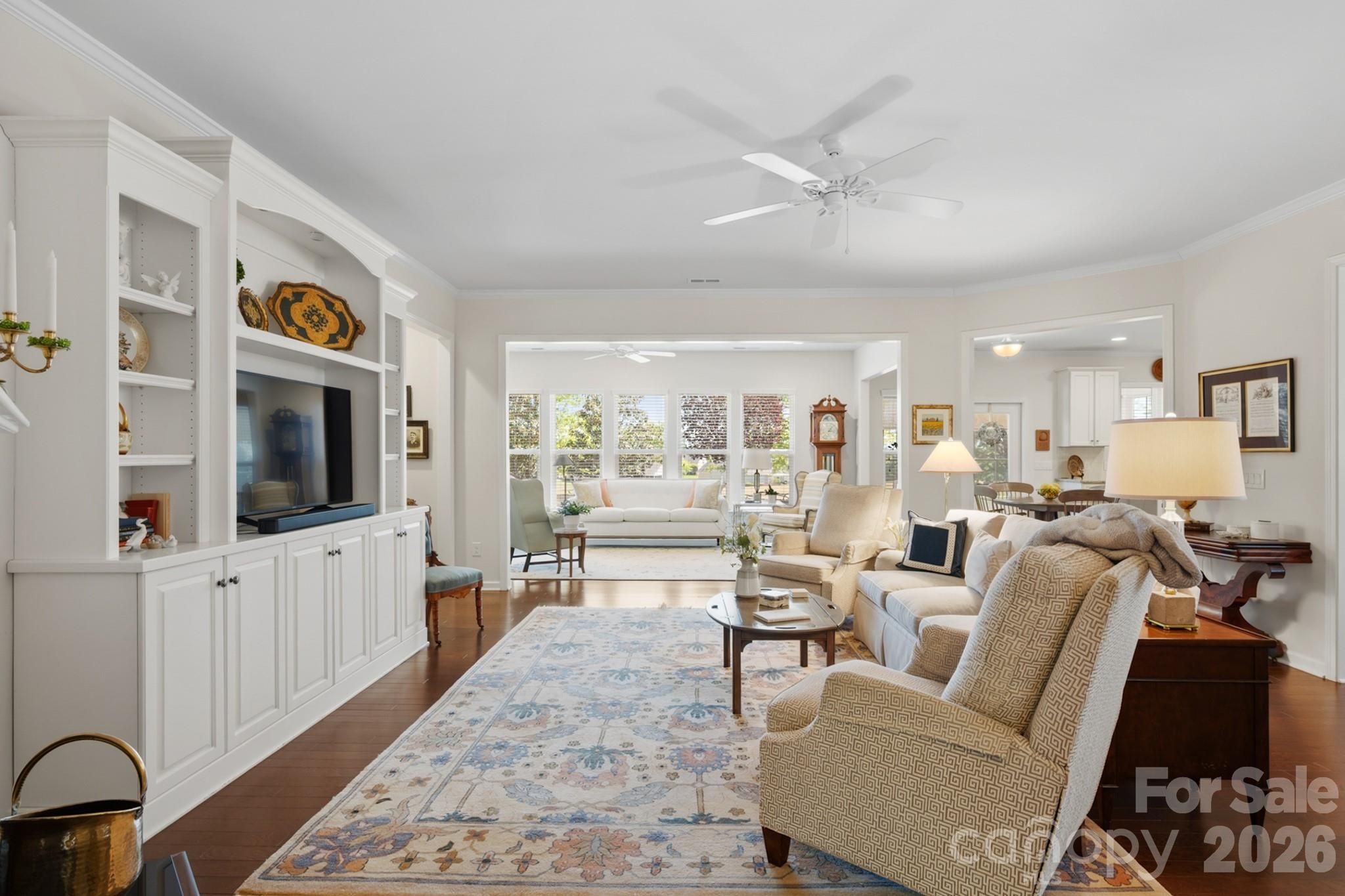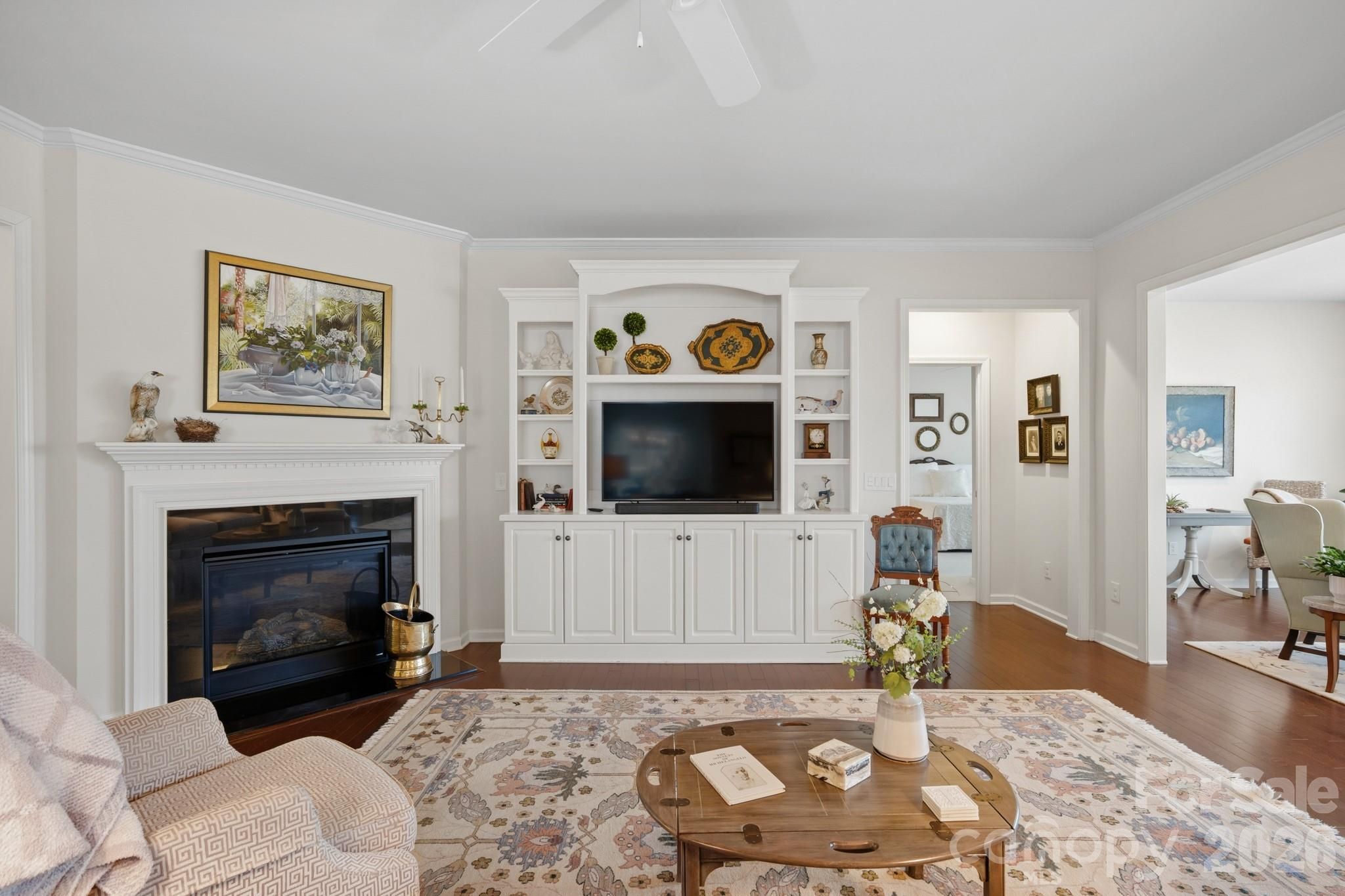 Tucked within the amenity-rich community of Sun City Carolina Lakes, this beautifully maintained Crestwood Meadow model blends comfort, style, and everyday functionality. A charming paver walkway leads to a covered front entry, setting a welcoming tone. Inside, the foyer opens to a private home office framed by elegant double glass doors - an ideal space for remote work, creative pursuits, or quiet study. At the heart of the home, the open-concept great room invites gathering and relaxation, with a gas log fireplace and classic mantle. Designed for both everyday living and entertaining, the formal dining room features detailed wainscoting accents. The kitchen is thoughtfully positioned at the rear of the home and impresses with a large island, granite countertops, tile backsplash, stainless steel appliances, and a gas range, along with a sunny breakfast nook for casual meals. Just beyond, a light-filled sunroom offers peaceful backyard views and an inviting place to unwind. The primary suite, also located at the back of the home for added privacy, features a spacious ensuite bath with dual vanities, a glass-enclosed walk-in shower, dedicated vanity space, and a generous walk-in closet. Two well-sized guest bedrooms are situated at the front of the home with access to a full hall bath, providing flexibility for visitors or additional living space. Practical touches include a laundry room with built-in storage and a utility sink, as well as attic space currently used for extra storage. Outdoor living shines with a screened patio complete with a ceiling fan - perfect for enjoying warm spring days - and a custom patio that overlooks the expansive backyard. Residents enjoy access to an array of resort-style amenities, including golf, tennis, pickleball, scenic walking trails, water access, and a vibrant selection of social clubs, creating a lifestyle as exceptional as the home itself.