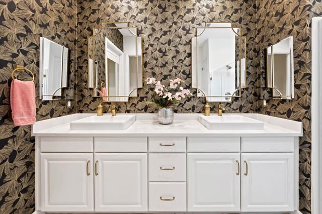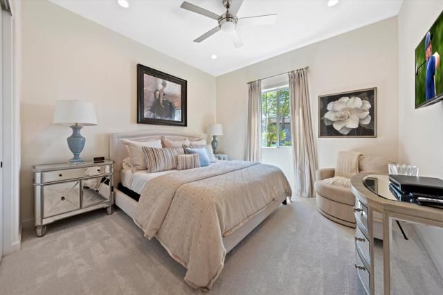 Style and sophistication describe this Plan 7 Refuge on a Premium elevated lot with city lights and mountain views. 3 bedrooms 2.5 baths including a custom powder room for guests. French doors have been added in 3rd Bdrm/office/den for privacy and it has a large closet. The open concept plan is perfect for entertaining and the center piece gourmet kitchen, has a spacious walk in pantry, stacked stone back splash, large prep island with seating, quartz counters and upgraded Kitchen Aid appliance package including refrigerator. You will notice the Kohler brushed gold fixtures throughout the kitchen and baths.The primary bath has a large walk-in shower, custom mirrors, accent wall paper, huge walk in closet with extra shelves and full size linen closet. The over sized 2 car garage has overhead storage racks, built in closets and air conditioning for year round comfort.The spacious elevated landscaped backyard hosts a resort style pool with plenty of space for guests to enjoy. The home has leased solar, 158.56/mo that must be assumed. Residence at Del Webb includes resort style amenities, state-of-the-art fitness, clubhouse, bar and lounge, sports courts, exercise and resort pools, and walking trails, within minutes of the casino, Mission Hills Hotel with golf courses, shopping and close freeway access. Owner is a CA. licensed broker acting as a principal in this transaction.