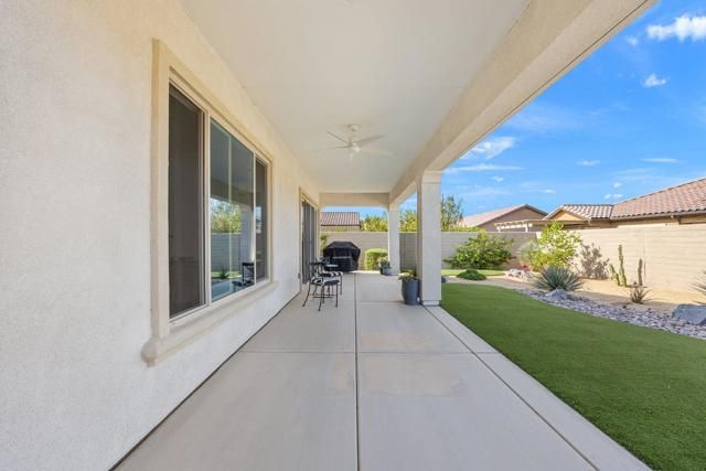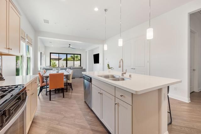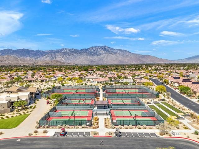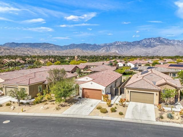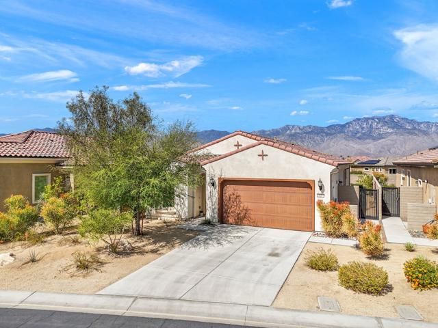 This highly sought-after Phase 1, Plan 2 Solitude residence is perfectly positioned on a generous, pool-sized lot showcasing west-facing mountain views and unforgettable desert sunsets. Thoughtfully upgraded with over $65,000 in builder enhancements, this home blends style, comfort, and indoor-outdoor living. Features include beautiful engineered wood flooring, Dove Grey cabinetry, quartz countertops, recessed lighting, and a dramatic center-opening sliding glass door that creates a seamless wall of glass--effortlessly extending your living space to the outdoors. Enjoy a full-length patio complete with remote-controlled exterior shades, ideal for relaxing or entertaining year-round. Inside, premium remote window shades enhance both the living room and primary bedroom. The spacious primary suite offers dual vanities, a walk-in shower, and abundant closet and linen storage. Energy efficiency is top of mind with a 12-panel OWNED SOLAR system--helping you say goodbye to high electricity bills. Located just a short stroll from the community's exceptional amenities, residents enjoy a clubhouse, fitness center, tennis and pickleball courts, putting green, and a stunning saltwater pool and spa maintained at 82 degrees year-round--all set against sweeping mountain views. Additional highlights include a scenic 3-mile nature path and 24/7 security for peace of mind. Furnishings available outside of escrow. Experience the best of desert living in this beautifully upgraded, move-in ready home!