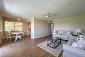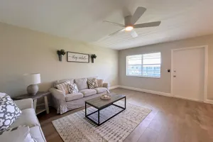 BEAUTIFUL REMODEL IN POPULAR 55+ COMMUNITY OF STERLING VILLAGE. A RARE 2 BEDROOM/1.5 BATH END UNIT ON 2ND FLOOR. PLANK STYLE LUXURY VINYL FLOORING IN ALL ROOMS. KITCHEN HAS NEWER STAINLESS-STEEL APPLIANCES, DEEP SINK W/ PULL OUT POT FAUCET, WHITE SHAKER CABINETS, WHITE SUBWAY TILE & QUARTZ COUNTERS. BATH HAS TALL VANITY/TOILET AND SUBWAY TILE TO THE CEILING. 5 MATCHING CEILING FANS & WIDE BLINDS ARE IN ALL ROOMS. STYLISH PICTURES & FURNITURE INCLUDE A QUEEN SLEEPER SOFA. NEW AC & UPGRADED ELECTRIC BOX ADDED FOR SAFETY. NEW THIS YEAR & INCLUDED IN HOA DUES ARE INTERNET IN ALL CONDOS, CAR WASH AREA, GATED & FENCED PERIMETER, PICKEBALL & FITNESS CENTER IN RENOVATED CLUBHOUSE. VILLAGE IS WALKING DISTANCE TO BOYNTON MARINA W/ WATERFRONT RESTAURANTS, BOAT CHARTERS & TIKI TAXI FOR (Pg 2 More)