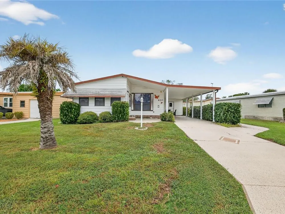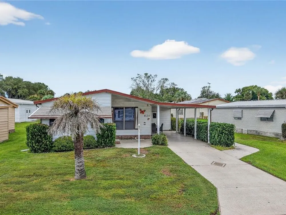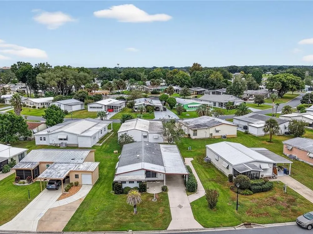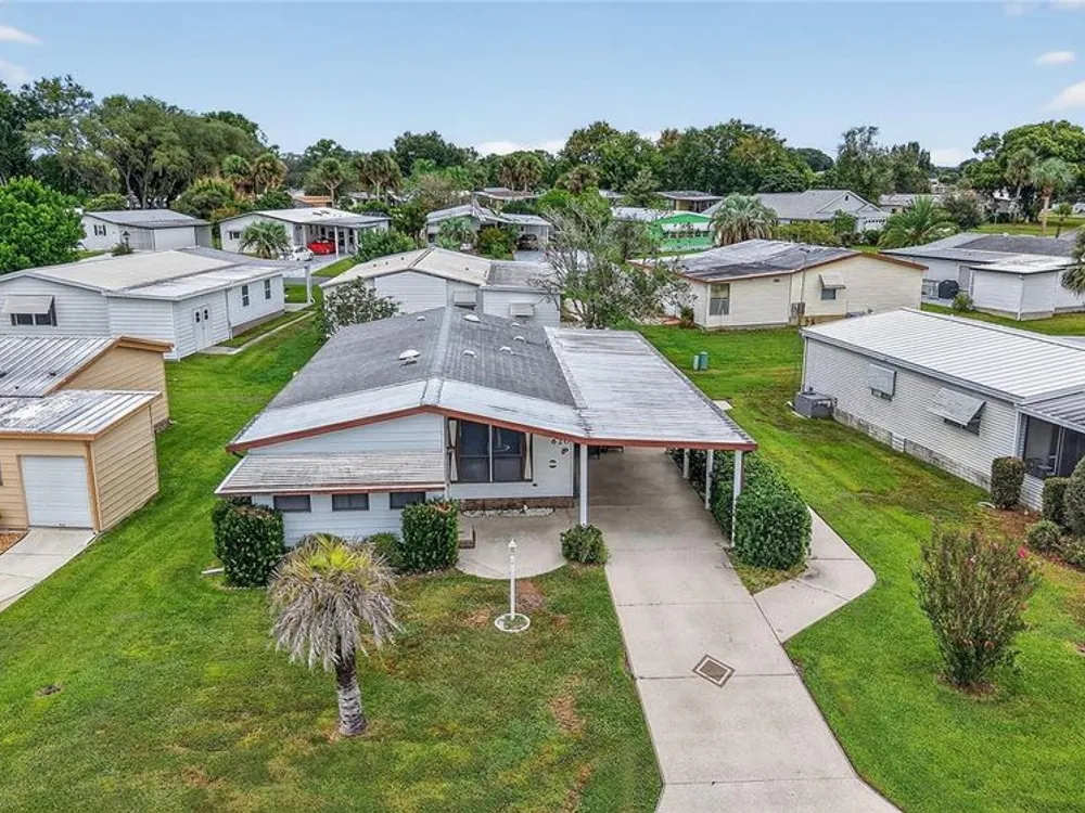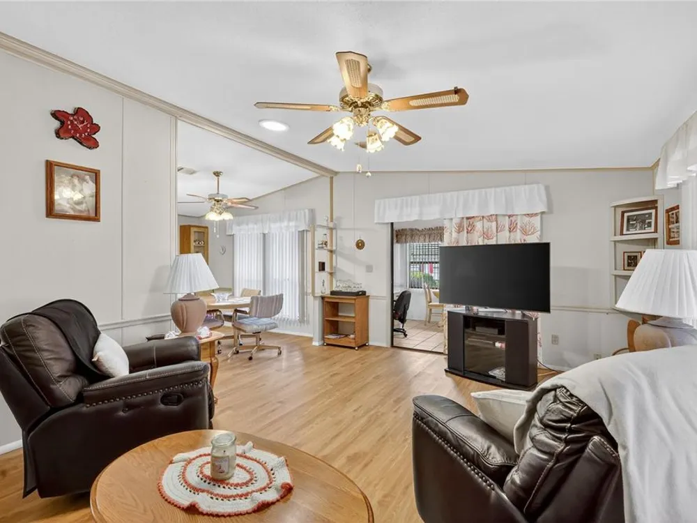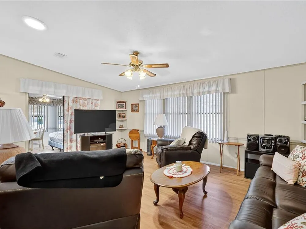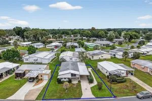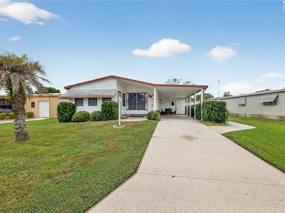 Come take a look at this well maintained home in The Villages at Orange Blossom Gardens! This Doublewide boasts a new roof in 2019, new HVAC in 2018, new engineered laminate wood throughout in 2019 and a golf cart garage with Golf Cart Included (2012 Yamaha Drive - gas powered)!! The home is sold furnished and features a spacious primary bedroom with full bedset, guest bedroom with walk in closet-furnished, and a bonus Florida room that is fully enclosed and has an optional third bedroom set up. Kitchen is fully stocked and features a great layout with a breakfast bar / prep area leading into your dining area that hosts a large built in bar / hutch. This home has everything and comes with everything while being in a perfect location in the Villages! Your moments from Pools and Parks, restaurants and shopping and all the amenities the Villages has to offer! Come take a look today!