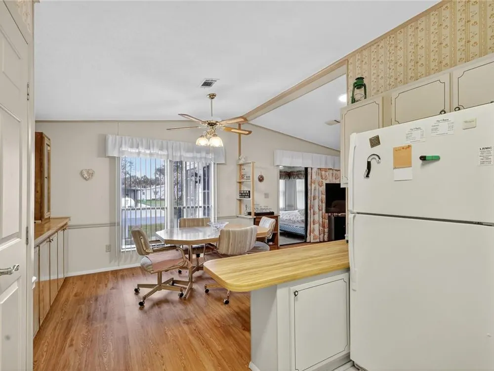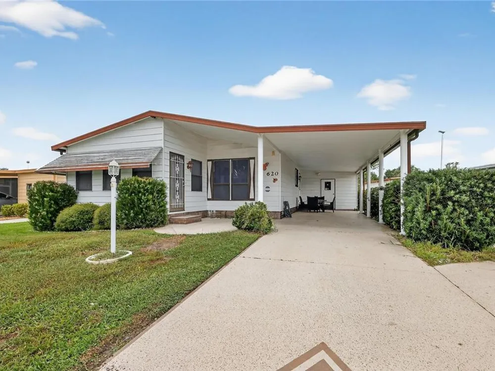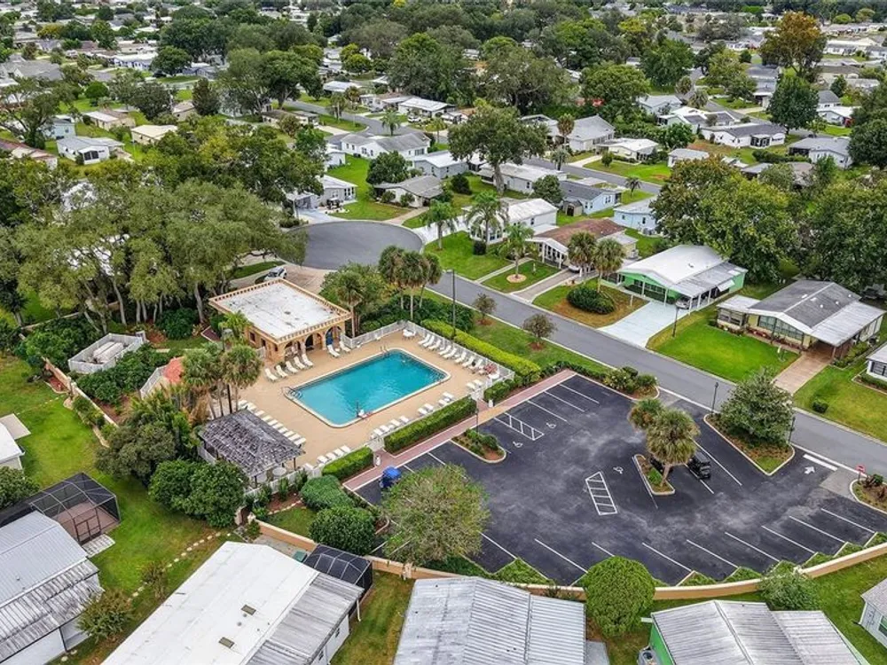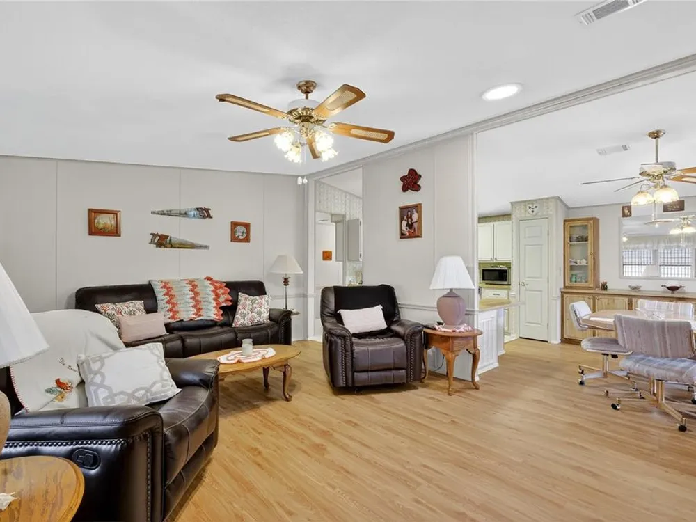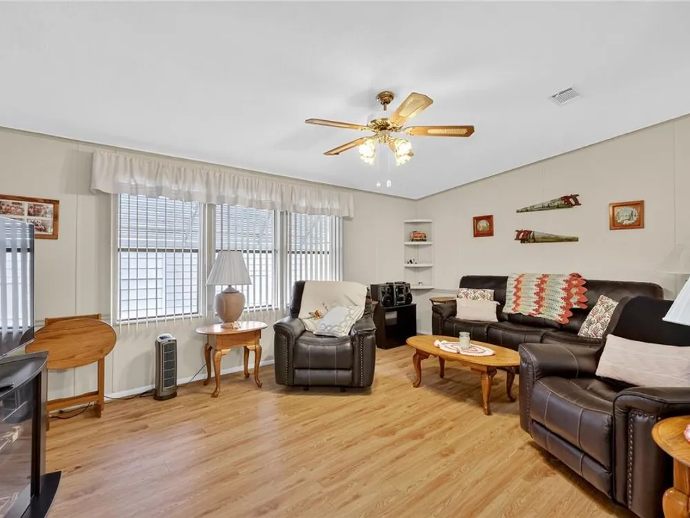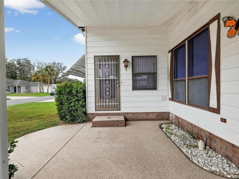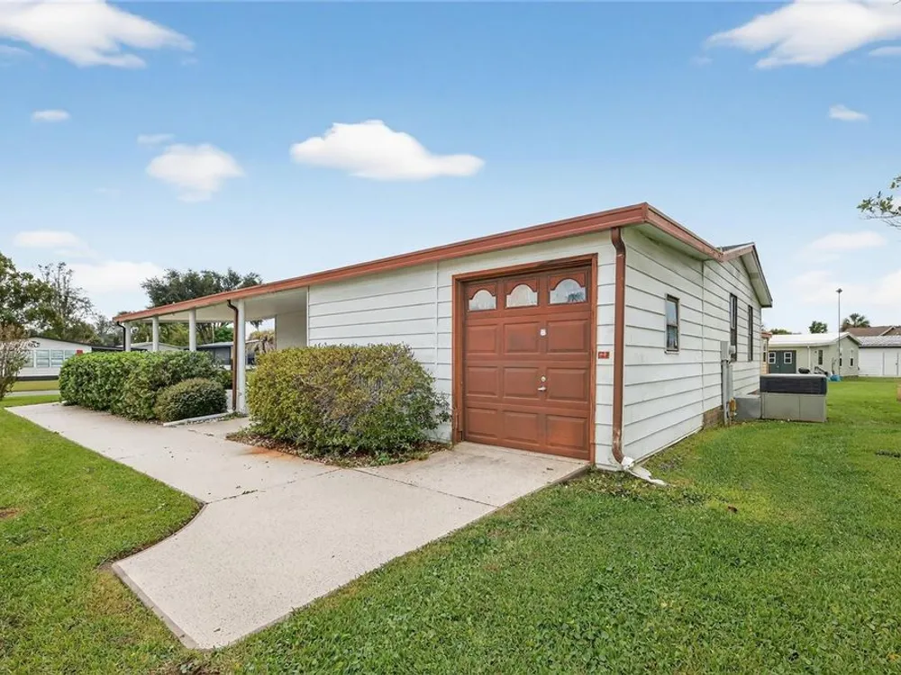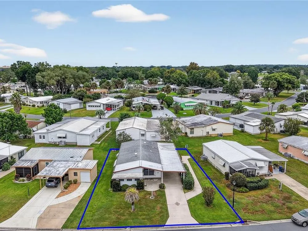 Come take a look at this well maintained home in The Villages at Orange Blossom Gardens! This Doublewide boasts a new roof in 2019, new HVAC in 2018, new engineered laminate wood throughout in 2019 and a golf cart garage with Golf Cart Included (2012 Yamaha Drive - gas powered)!! The home is sold furnished and features a spacious primary bedroom with full bedset, guest bedroom with walk in closet-furnished, and a bonus Florida room that is fully enclosed and has an optional third bedroom set up. Kitchen is fully stocked and features a great layout with a breakfast bar / prep area leading into your dining area that hosts a large built in bar / hutch. This home has everything and comes with everything while being in a perfect location in the Villages! Your moments from Pools and Parks, restaurants and shopping and all the amenities the Villages has to offer! Come take a look today!