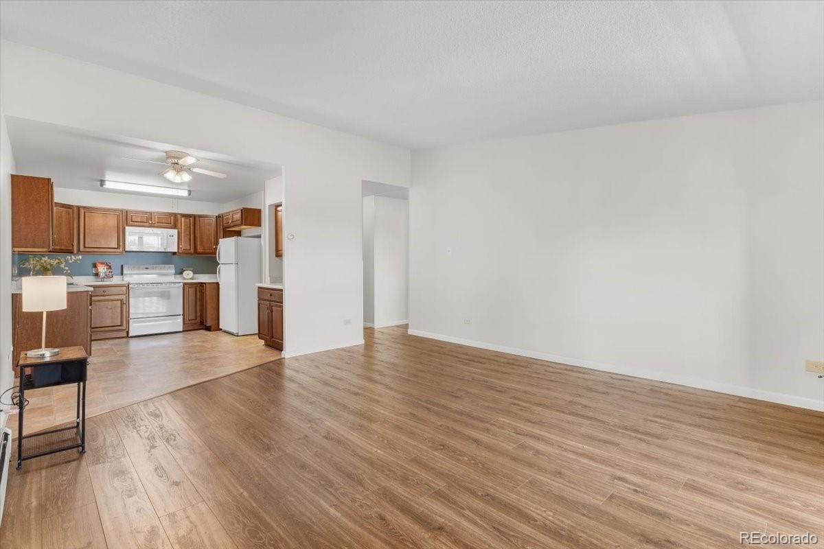 Welcome to Windsor Gardens — Colorado's largest 55+ active adult community! This stunning top-floor end unit offers breathtaking golf course views, abundant natural light, and a thoughtfully updated interior featuring a refreshed kitchen, new laminate flooring, updated doors, and fresh paint throughout. With 2 bedrooms and 1 bath, this home is move-in ready and waiting for you. Here's what makes Windsor Gardens truly special — your HOA dues cover your heat, water, sewer, trash, building maintenance, and 24/7 community responders. Enjoy resort-style amenities including indoor/outdoor pools, hot tub, sauna, fitness center, billiards, library, craft rooms, and a 9-hole par 3 golf course. Dine at the onsite restaurant, explore the private walking trail along the Highline Canal, or join one of the many clubs and events offered every month. RTD bus stops throughout the community make getting around effortless. This is more than a condo — it's a lifestyle."