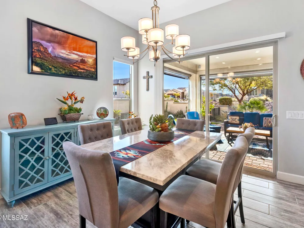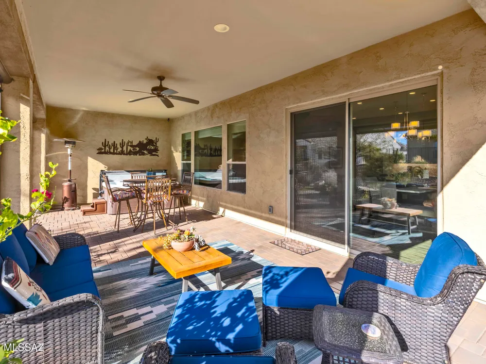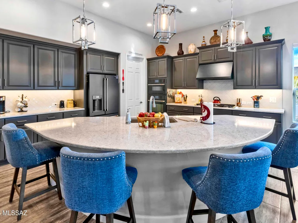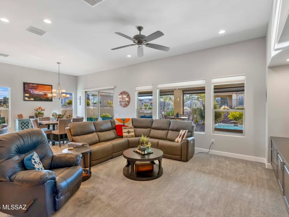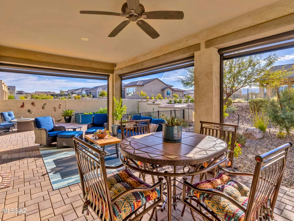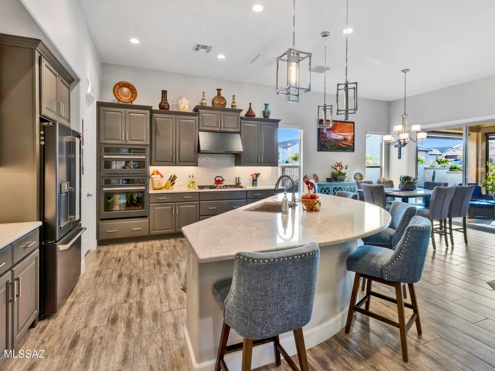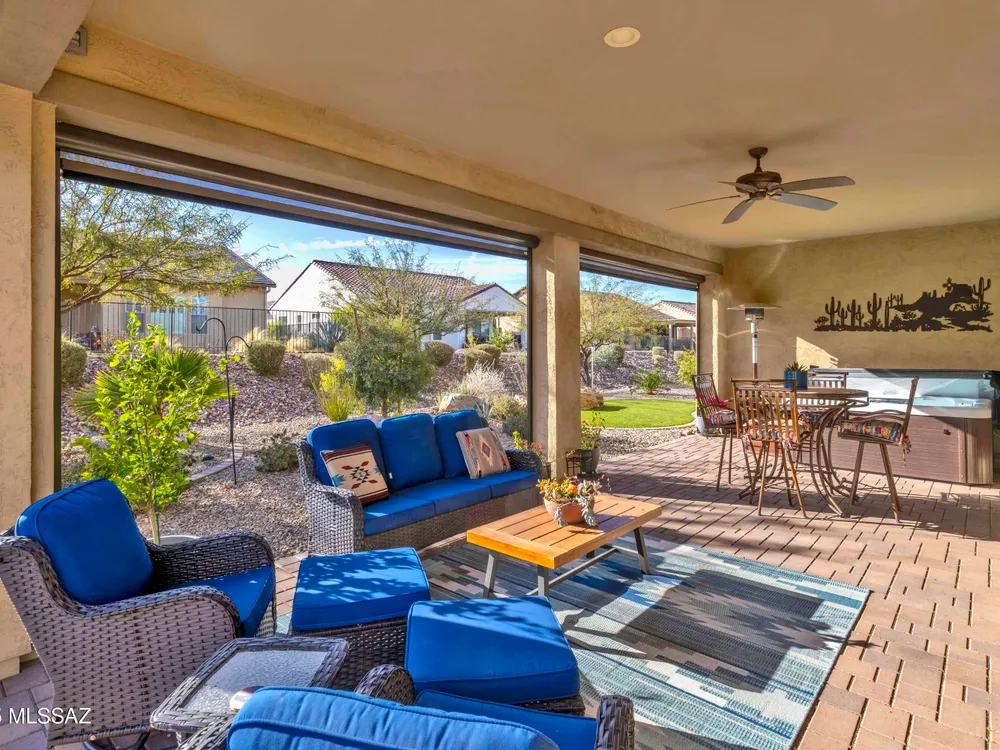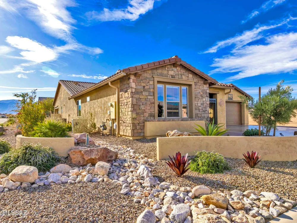 Welcome home to this stunning Vienta model with a detached Casita, nestled in the heart of SaddleBrooke Ranch. Thoughtfully designed with elegance and comfort in mind, this home boasts an inviting open floor plan adorned with designer touches, including upgraded cabinetry, ceramic tile flooring, stylish light fixtures, and ceiling fans throughout.The chef's dream kitchen is a showstopper, featuring a spacious center island illuminated by custom pendant lights, quartz countertops, a designer backsplash, and upgraded GE Advantium black stainless-steel appliances, including a five-burner gas cooktop. Ample storage options, including a generous walk-in pantry, make this space as functional as it is beautiful.