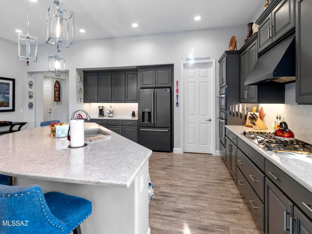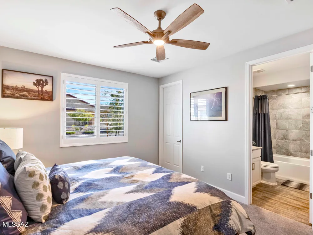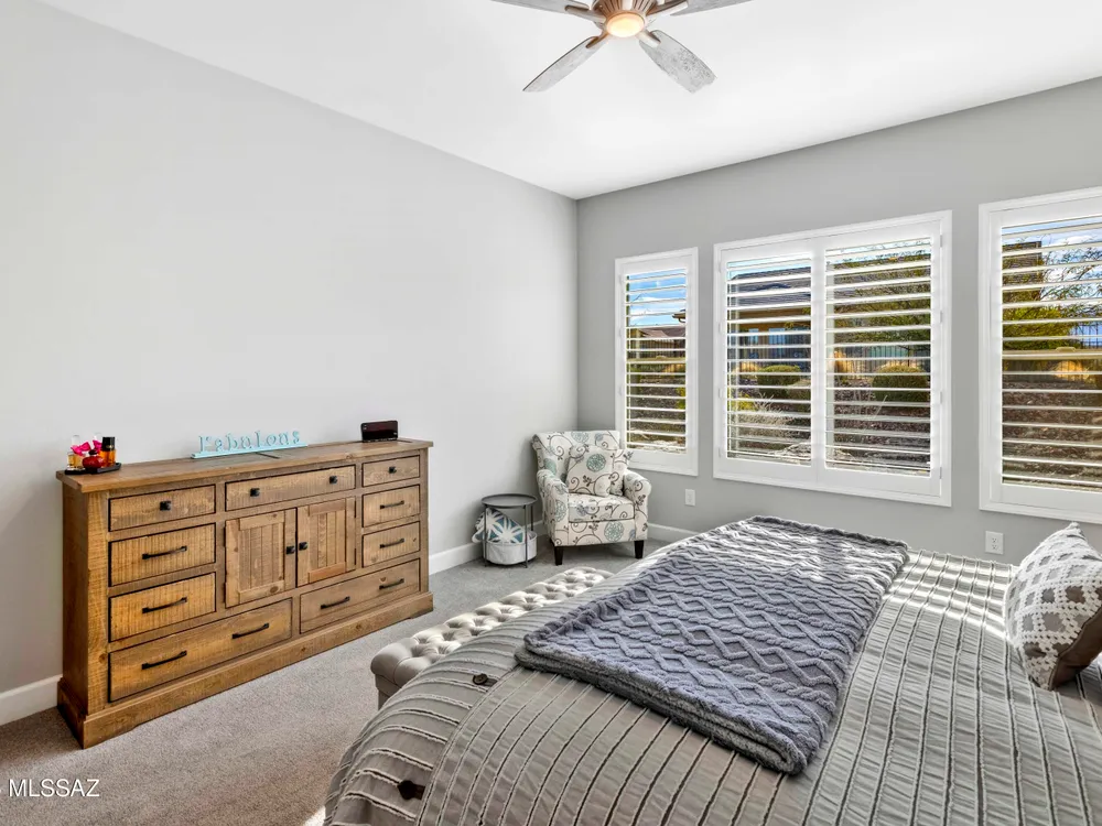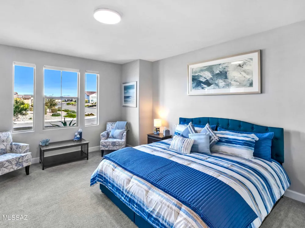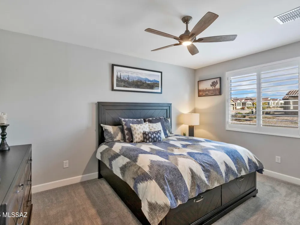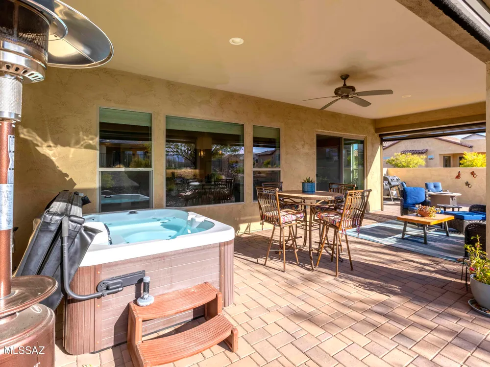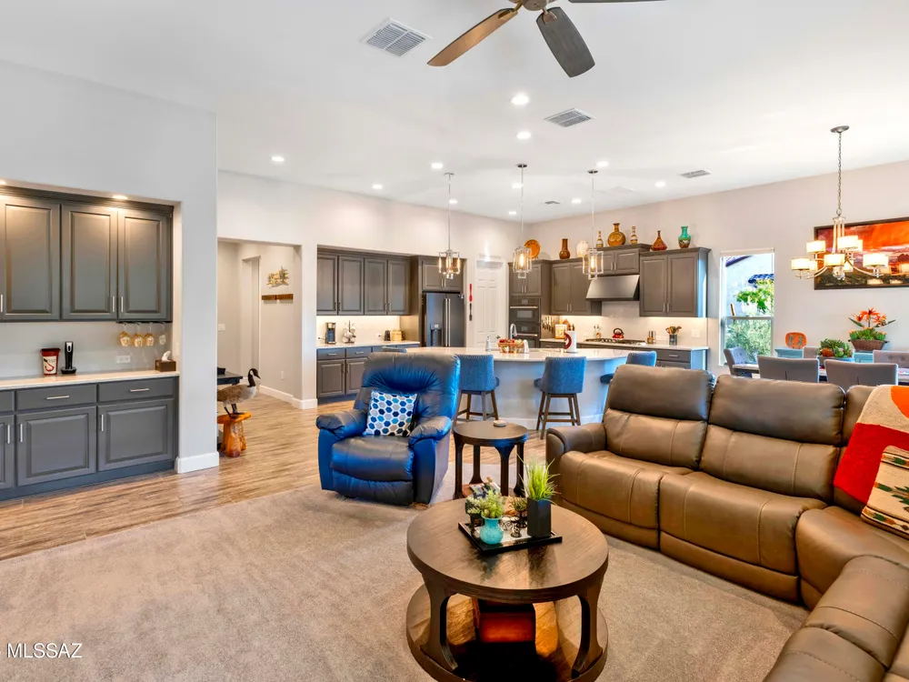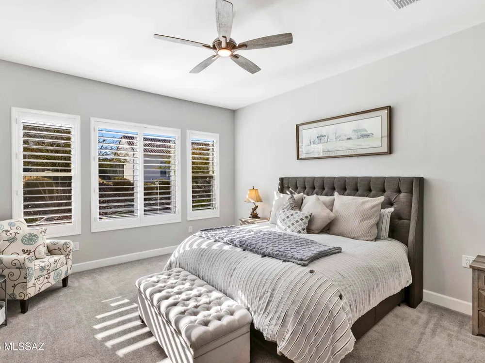 Welcome home to this stunning Vienta model with a detached Casita, nestled in the heart of SaddleBrooke Ranch. Thoughtfully designed with elegance and comfort in mind, this home boasts an inviting open floor plan adorned with designer touches, including upgraded cabinetry, ceramic tile flooring, stylish light fixtures, and ceiling fans throughout.The chef's dream kitchen is a showstopper, featuring a spacious center island illuminated by custom pendant lights, quartz countertops, a designer backsplash, and upgraded GE Advantium black stainless-steel appliances, including a five-burner gas cooktop. Ample storage options, including a generous walk-in pantry, make this space as functional as it is beautiful.
