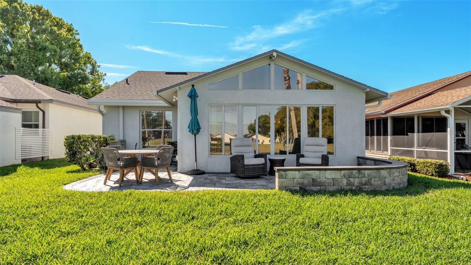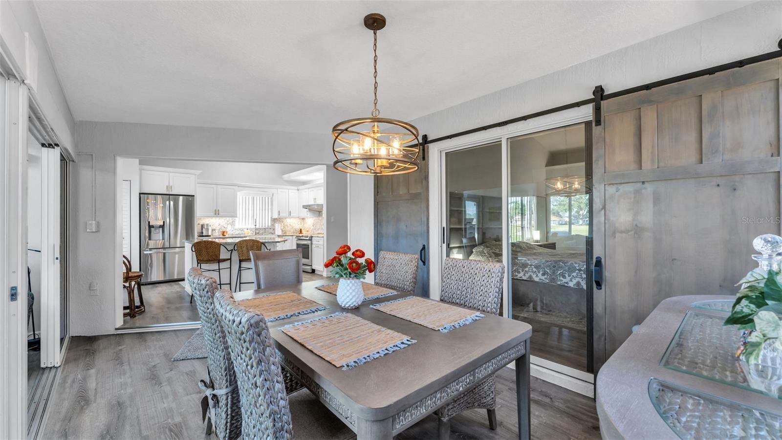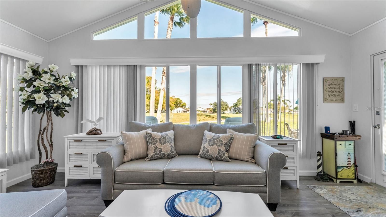 Sandpiper Golf & Country Club. Located directly on the golf course in the highly sought-after 55+ community. This beautiful, recently updated 2-bedroom, 2-bath home offers 1,484 square feet of stylish living space, NEW ROOF 2023, low HOA fees, and a lifestyle of comfort and convenience. Featuring luxury vinyl flooring throughout and a bright, open floor plan, the home is filled with natural light from enormous windows in the dining area and Florida sunroom, where soaring ceilings create an airy, inviting space, further enhanced by elegant granite window sills. The modern kitchen showcases high-end LG stainless steel appliances, farm sink, granite countertops, a stylish matching backsplash, soft-close cabinetry, and a charming island with drawers, cubbies and a built in microwave. Granite countertops continue into both bathrooms, adding a cohesive, upscale touch throughout the home. A contemporary chandelier enhances the dining space, while sliding doors with a decorative barn door add character between the dining area and primary suite. Both bedrooms include ensuite bathrooms with walk-in showers, tiled backsplashes, built-in benches, and thoughtful upgrades; the primary bath also features a rain shower head, built-in shelving, and the second bath includes grab bars for added accessibility. Additional highlights include ceiling fans throughout, an attached garage with extra space, ample cabinetry, shelving, and laundry. Outside, the property showcases extensive coordinated concrete paver hardscaping across the driveway, front walkways, and rear patio, complemented by a low stone garden wall and a patterned paver patio overlooking the course. A charming front sitting area is shaded by a dome awning, perfect for relaxing outdoors. The living room at the front of the home provides additional flexible space, and all furniture, as well as the golf cart, are negotiable. Residents enjoy access to a clubhouse, fitness center, community pools, tennis, pickleball, and shuffleboard courts, with HOA fees including cable and internet. Ideally situated in Lakeland, just under six miles from downtown and with easy access to I-4 for travel to Tampa and Orlando, this home combines modern style with an unbeatable location.