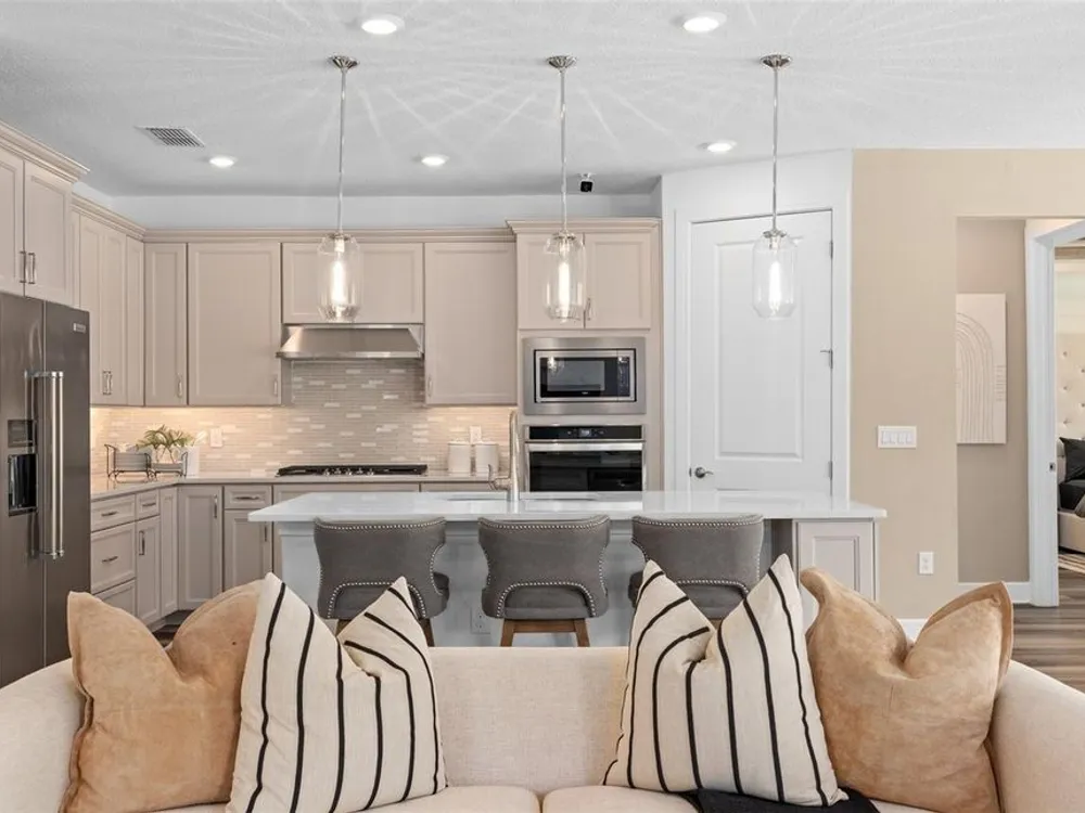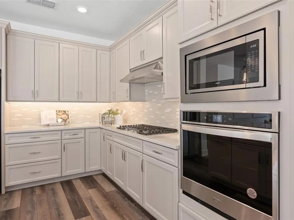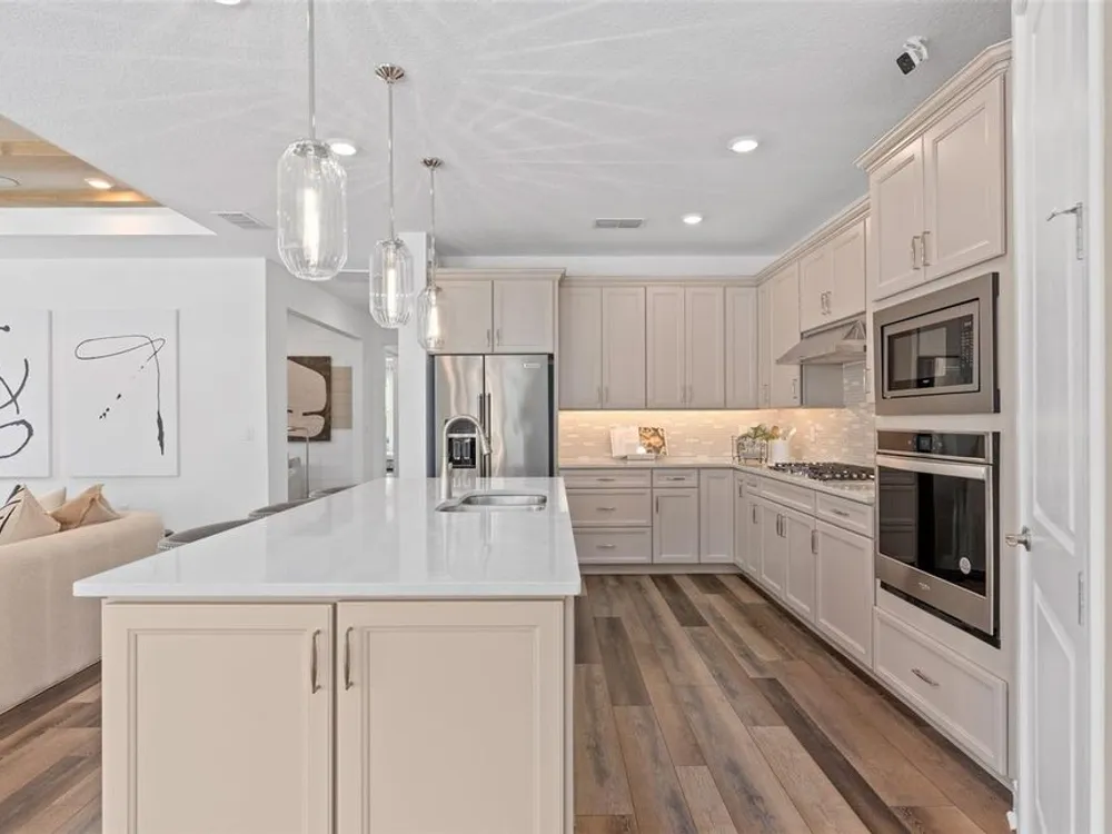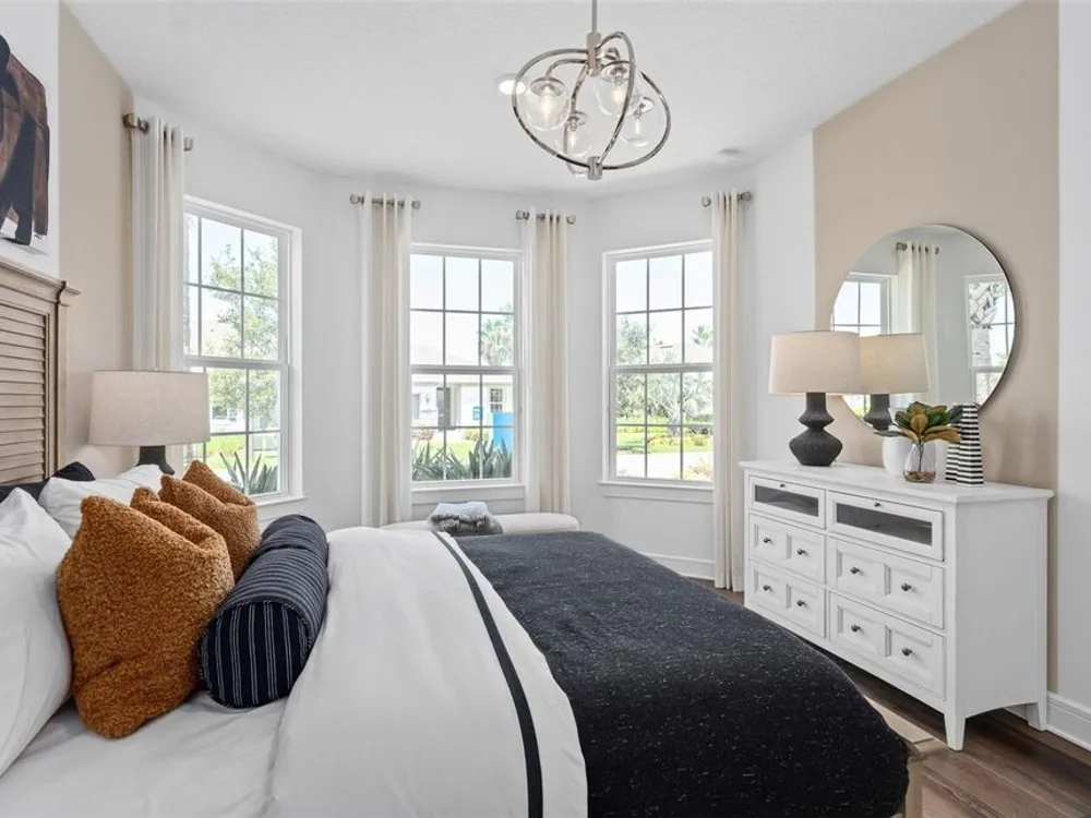 Under Construction. Del Webb Sunbridge is a gated 55+ active adult natural gas community offering new construction single family and villa homes with a low-maintenance lifestyle – and a Central Florida location in the center of it all. Del Webb Sunbridge offers an abundance of resort-style amenities with social events and activities centered in the 27,000-square foot clubhouse and planned by a full-time Lifestyle Director. With a zero-entry pool with lap lanes, resistance pool, poolside hammocks, and heated spa, sports courts, a movement studio, walking trails and more. Meet new friends at a resident club, take a painting class at one of the many art studios, attend a concert or show at the amphitheater, grab a bite at the on-site tavern & grille, or chat at the fire pits and grille pavilion. Get spoiled at Del Webb Sunbridge - after all, this is your time! Your home's exterior and yard maintenance are included, and fiber network provides up to gigabit internet speed. Del Webb Sunbridge’s resort amenities, sports courts, and Lifestyle Director with nearby Lake Nona truly make this the ideal neighborhood and a perfect location to call home. Step into the Mystique Model Home by Pulte! Originally a model home, this stunning one-story 3 bedroom, 2 bathroom, open flex room, and 2-car garage masterpiece boasts a pool situated on a homesite with no rear neighbors, a privacy wall at the rear of the home, and black aluminum fencing–offering both privacy and beauty. The open-concept layout seamlessly connects the gourmet kitchen, café, and gathering room, creating an airy atmosphere. The many windows bathe the entire space in natural light, while the tray ceiling in the gathering room adds an extra touch of sophistication, elevating the overall feeling of openness. The gourmet kitchen is a true focal point, featuring Whirlpool appliances, including a natural gas cooktop and French door refrigerator. Soft-close cabinetry, a range hood, mosaic tile backsplash, quartz countertops, and under-cabinet lighting add the perfect blend of style and convenience. The kitchen flows effortlessly into the café and gathering room, where a zero-corner sliding glass door leads to the extended covered lanai and pool, making this home ideal for seamless indoor-outdoor living. Retreat to the luxurious owner’s suite, a serene sanctuary with a spacious walk-in closet and a spa-like en suite bathroom. Dual vanity sinks, a walk-in shower, an enclosed toilet, and a linen closet complete the tranquil space. The two additional spare bedrooms and bathroom, along with the open flex room, provide ample space for family and guests. The upgraded laundry room with built-in cabinetry, quartz countertops, utility sink, and Whirlpool washer and dryer make daily tasks a breeze. Every detail of this home has been carefully curated, from the Shaw wood-look luxury vinyl plank flooring throughout to the tile flooring in the bathrooms and laundry. Designer-curated finishes elevate every corner of this home, including brushed nickel hardware and plumbing fixtures, 8’ interior doors, comfort-height toilets, and epoxy finish on the garage floor. With its stunning design and thoughtful touches, the Mystique home provides the perfect blend of luxury and functionality for today’s lifestyle. Don't miss out on your chance to own one of the best homes in the neighborhood! Schedule a tour today!