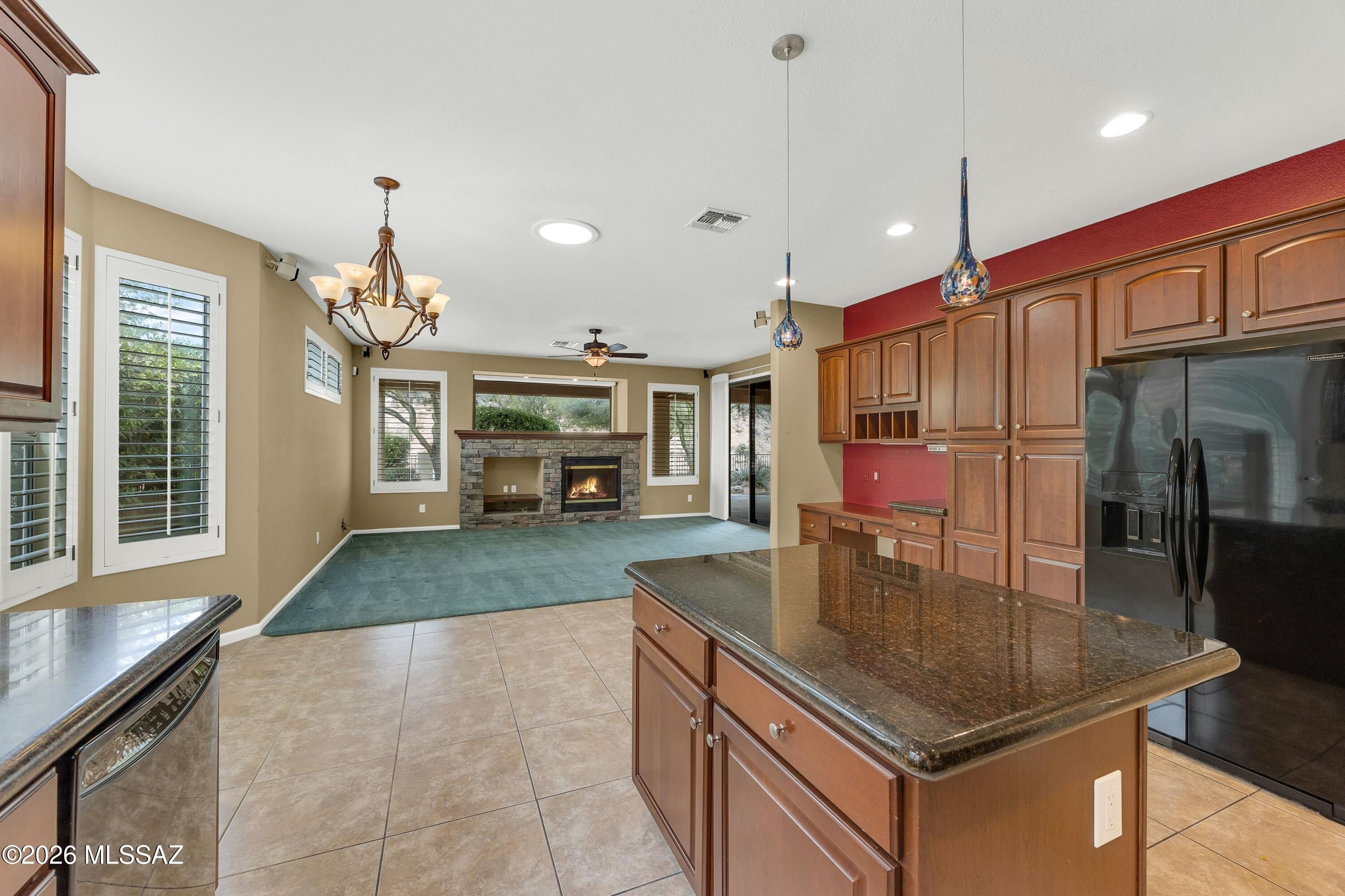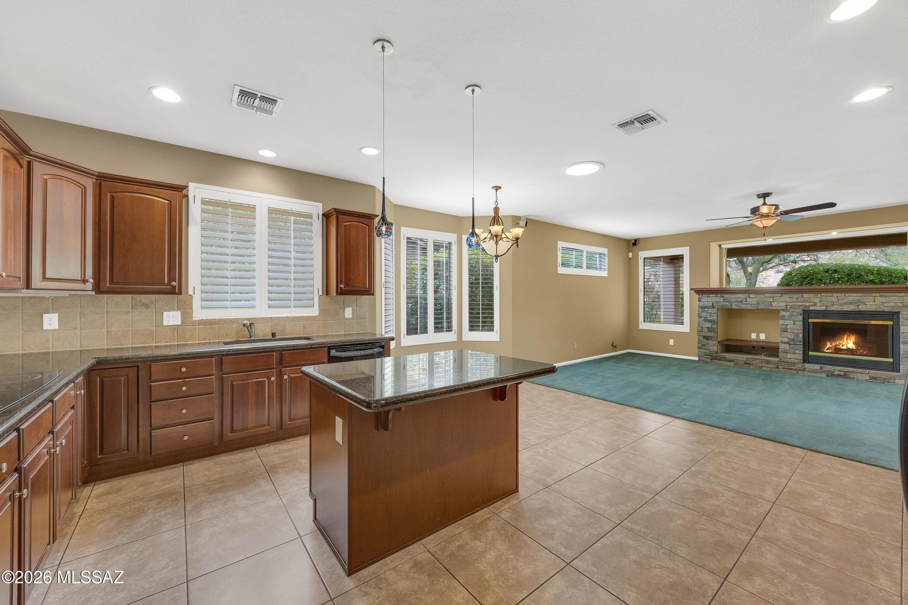 Lovely Dakota with nature behind & mountain views on side. Wrought iron security door leads you into spacious Great Room with Dining Room. Kitchen features granite counters, black appliances, cherry cabinets, island, & breakfast nook with bay window. Family Room offers stacked stone media center, gas fireplace, & slider to patio. Owner's Suite has bay window, patio access, & EnSuite with quartz dual vanity, soaking tub, tiled walk-in shower & walk-in closet. 2 guest bedrooms with closets & nearby guest bath. Plantation shutters throughout & 2 solar tubes. Laundry Room includes W/D, sink, & cabinets. Two-car garage with storage cabinets plus separate one-car garage. Enjoy private gated yard with mature trees, covered patio, extended flagstone patio, & raised patio area-perfect for relaxing!