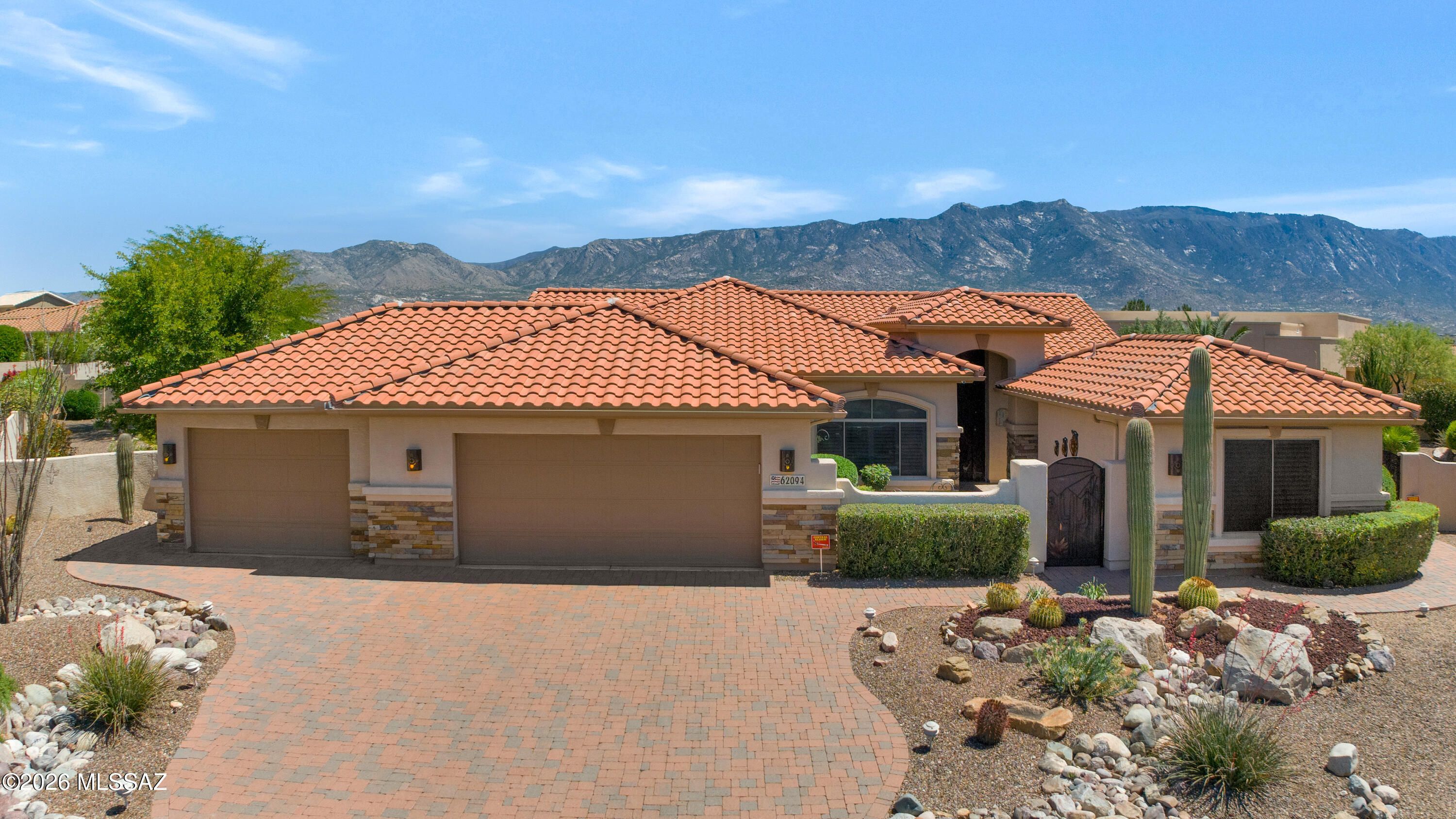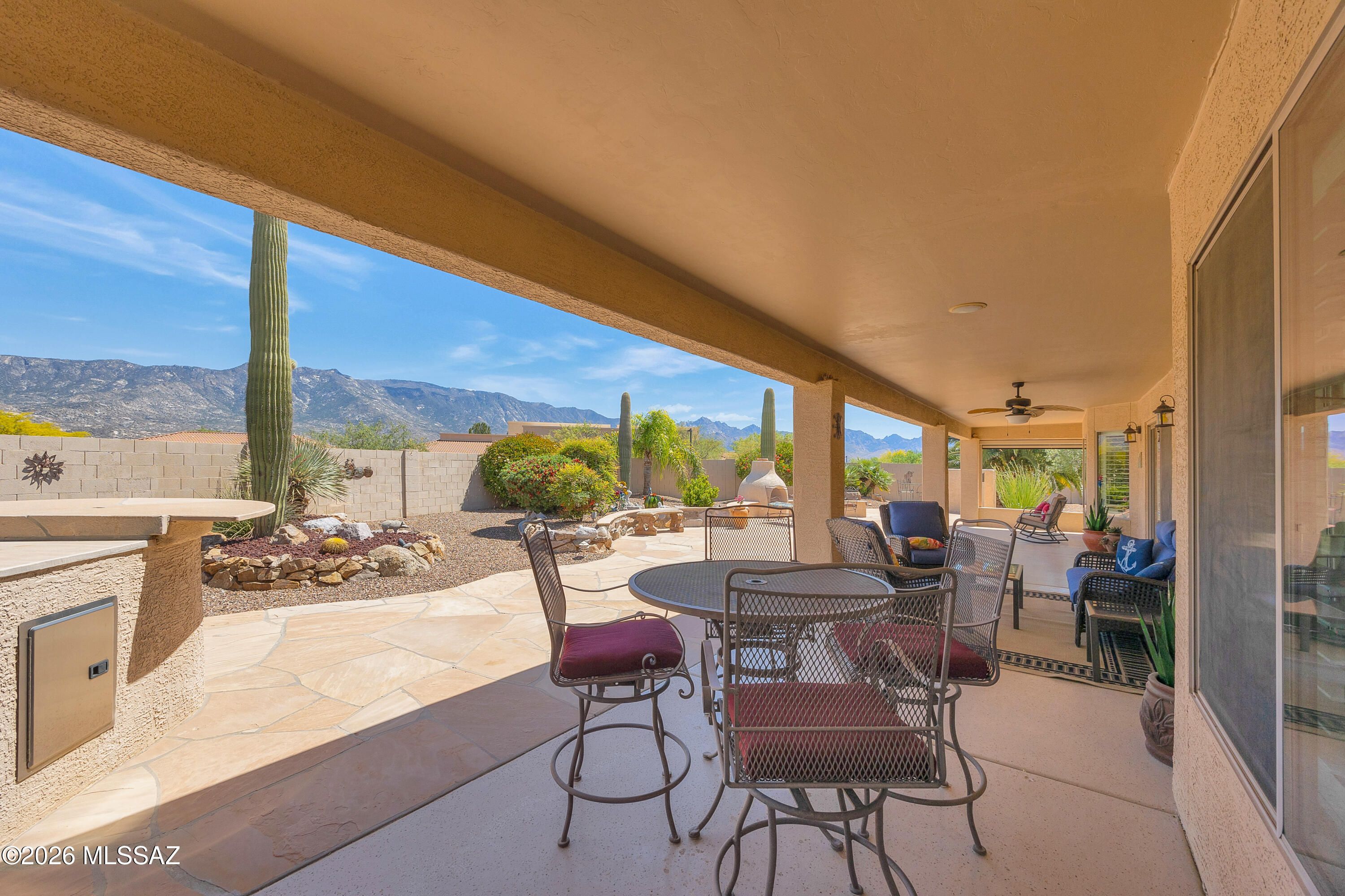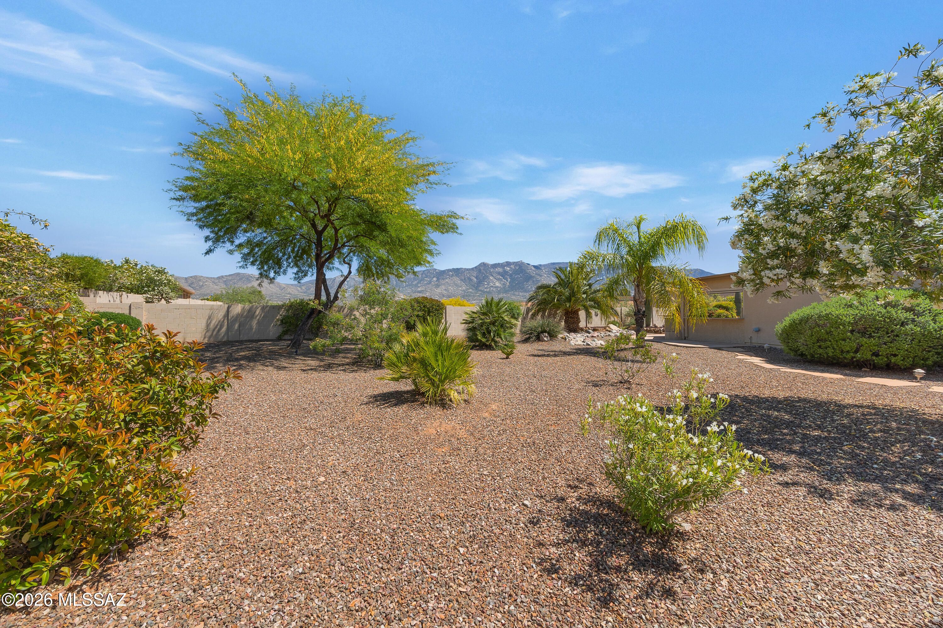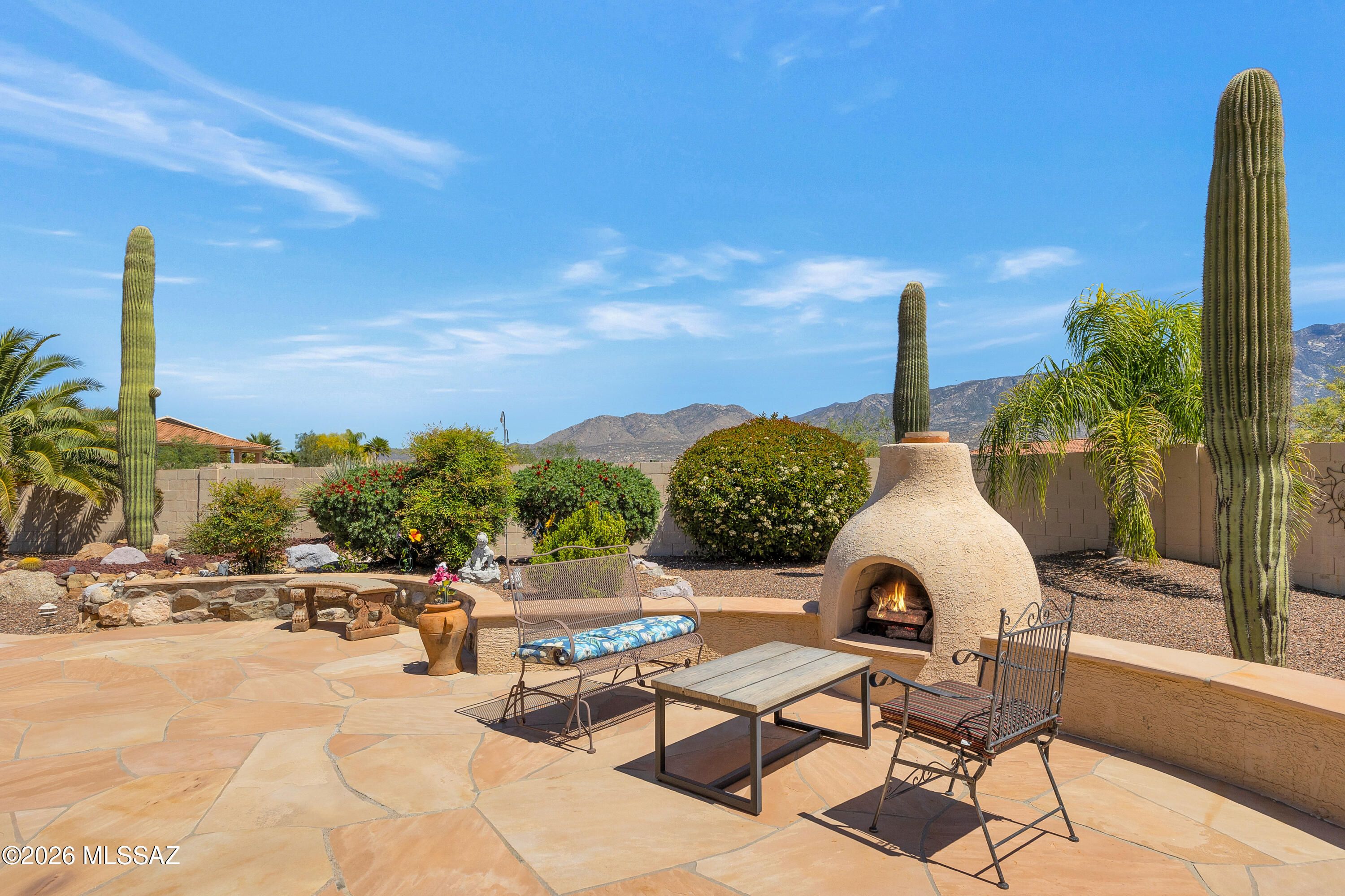 Stunning 3BD/3BA home with private casita situated on a large lot in SaddleBrooke featuring fabulous mountain views! This beautifully maintained property offers a desirable open layout with 42'' kitchen cabinetry, granite countertops, and a cozy gas fireplace perfect for cool desert evenings. Enjoy seamless indoor-outdoor living with auto patio screens, rolling screens on the front door and casita, and a spacious outdoor setting ideal for relaxing or entertaining.Car enthusiasts and hobbyists will appreciate the extended 3-car garage with epoxy floor coating and paver driveway. Additional upgrades include an owned water softener, new water heater (2018), and new irrigation system (2025). A rare opportunity to enjoy privacy, views, and comfort in SaddleBrooke.