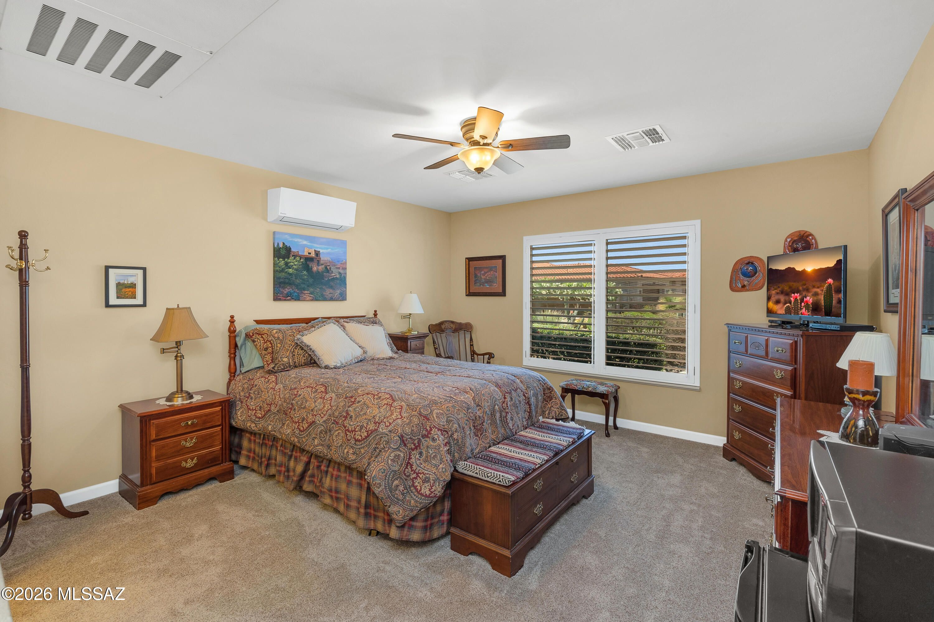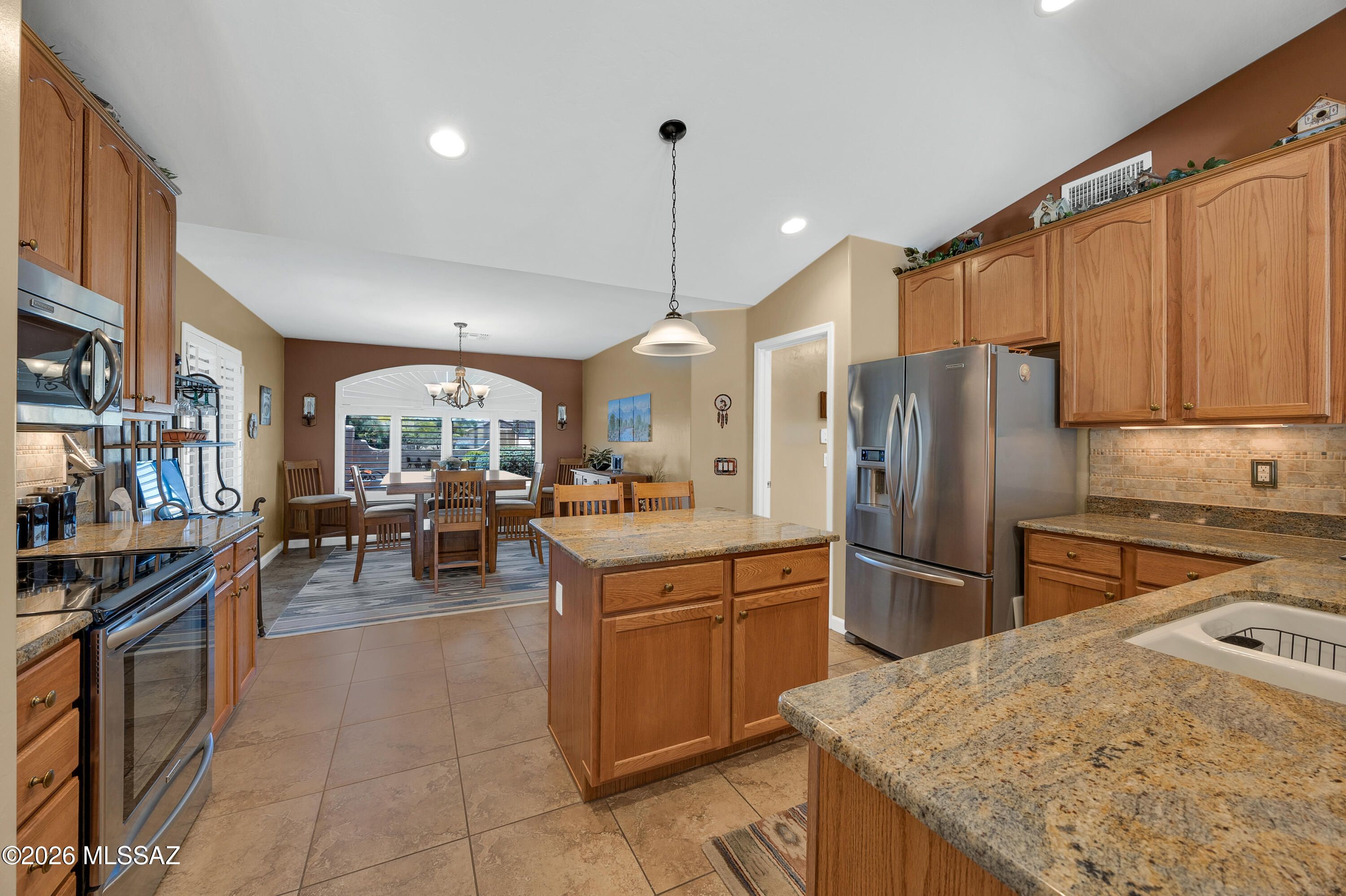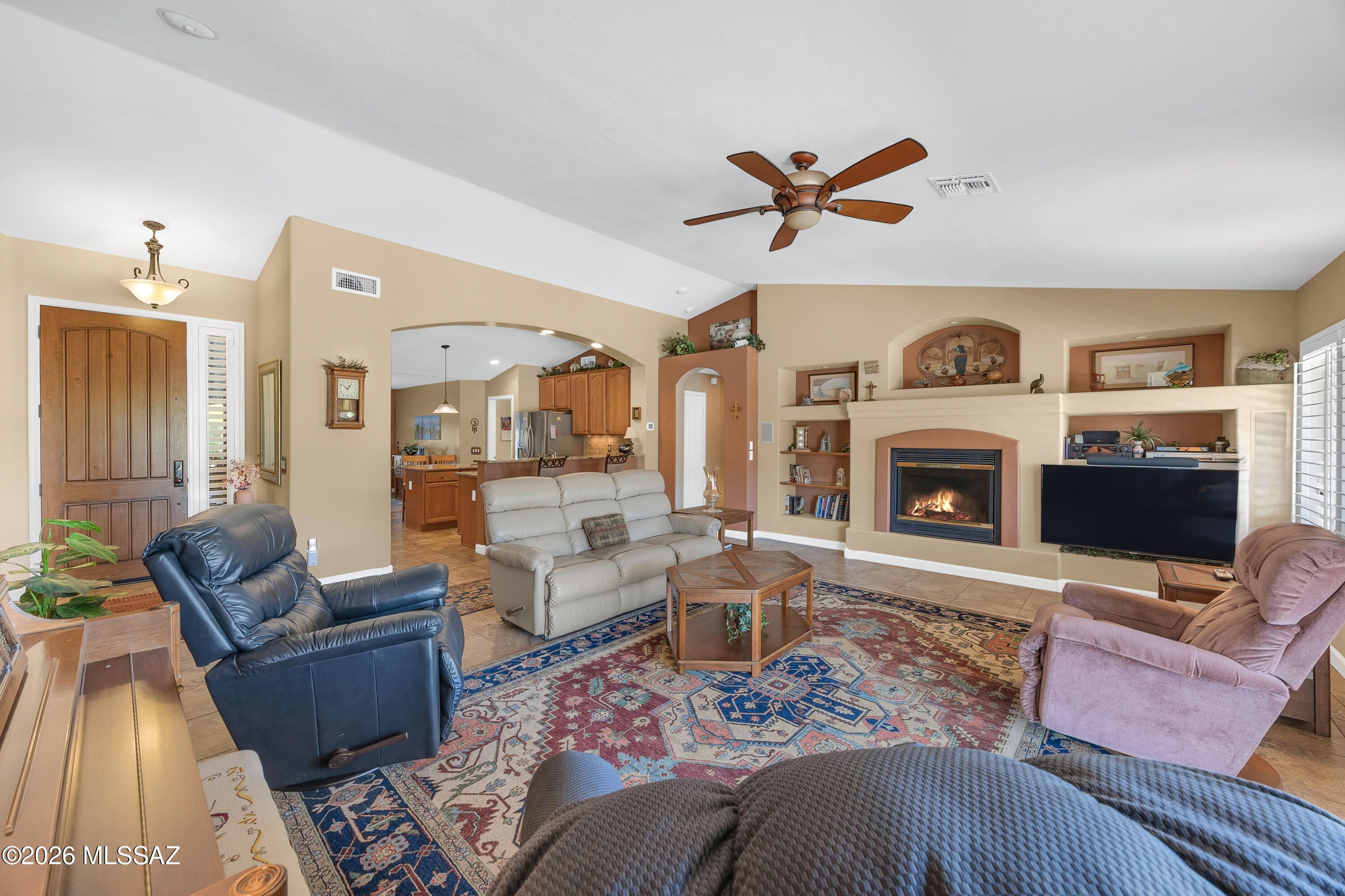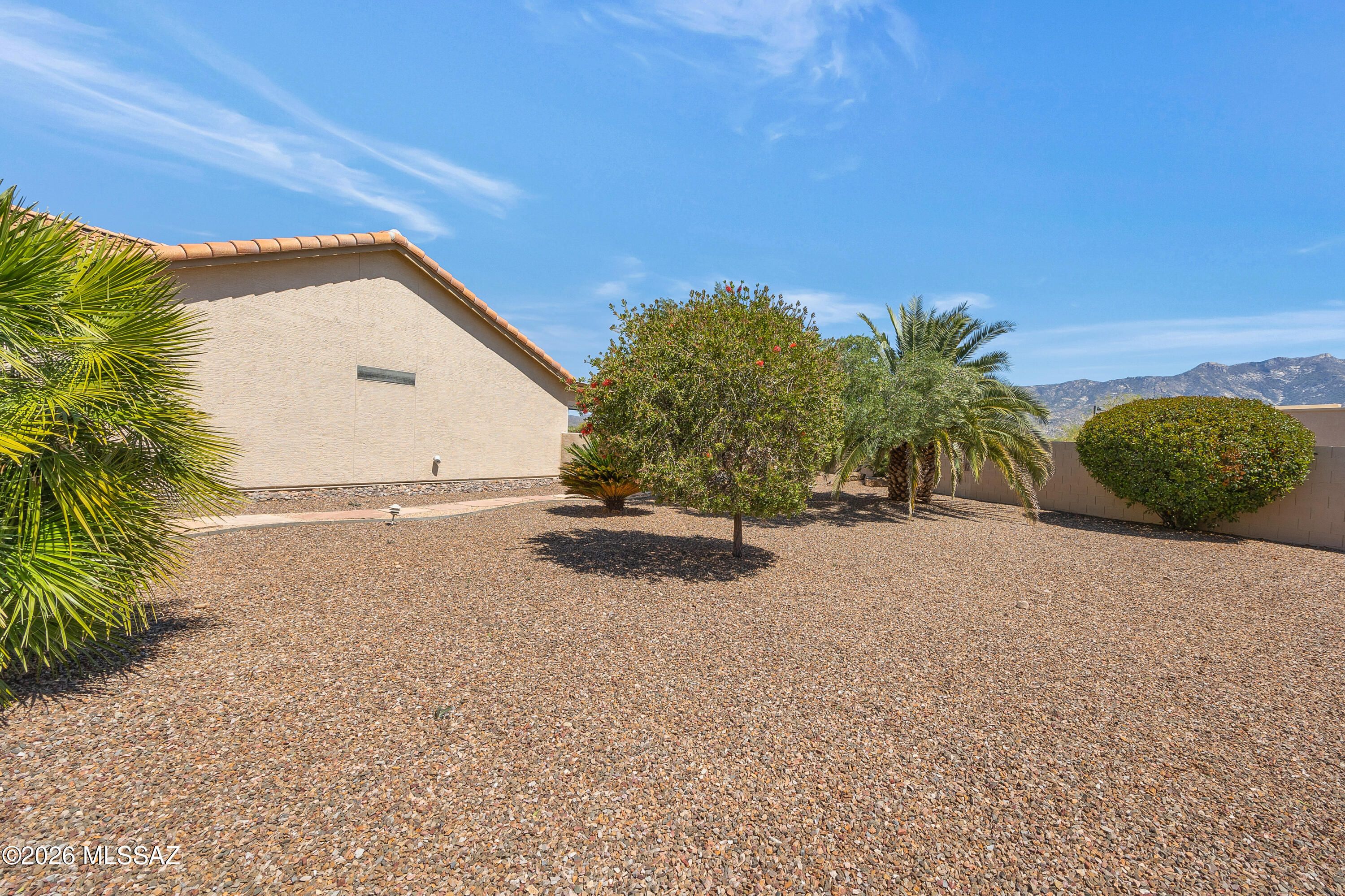 Stunning 3BD/3BA home with private casita situated on a large lot in SaddleBrooke featuring fabulous mountain views! This beautifully maintained property offers a desirable open layout with 42'' kitchen cabinetry, granite countertops, and a cozy gas fireplace perfect for cool desert evenings. Enjoy seamless indoor-outdoor living with auto patio screens, rolling screens on the front door and casita, and a spacious outdoor setting ideal for relaxing or entertaining.Car enthusiasts and hobbyists will appreciate the extended 3-car garage with epoxy floor coating and paver driveway. Additional upgrades include an owned water softener, new water heater (2018), and new irrigation system (2025). A rare opportunity to enjoy privacy, views, and comfort in SaddleBrooke.