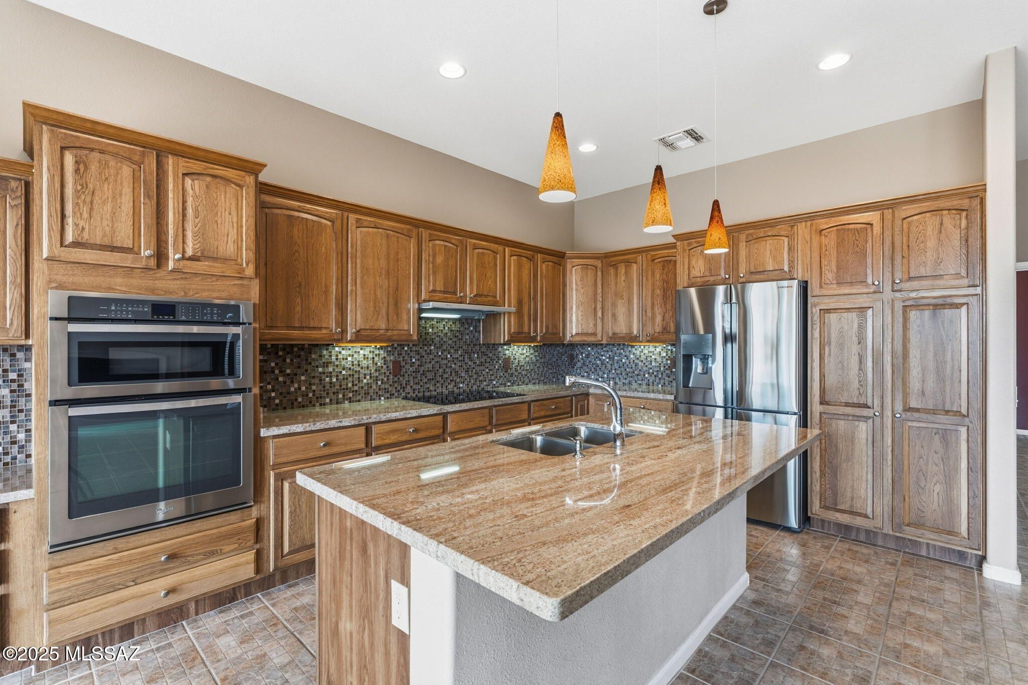 Spectacular 3BD/2.5BA (2,835 sq ft) updated Cheyenne model affords spacious living, front & rear mountain views, plus peeks of the golf course within SaddleBrooke's premier Active Adult community. Brick paver drive and front courtyard with views flow to an elegant foyer and expansive formal living space with soaring, vaulted ceilings. Beyond lies an open concept Great room hosting walk-in wet bar, media wall with fireplace and dual rolling sunscreens. Updated gourmet kitchen hosts granite countertops with decorative glass backsplash, SS appliances including induction cooktop, plus large center island and built-in workstation. Split bedroom plan hosts private Owner's Suite offering dual split vanities with quartz countertops, glass encased shower w/ pebble tiled floor, dual walk-in closets