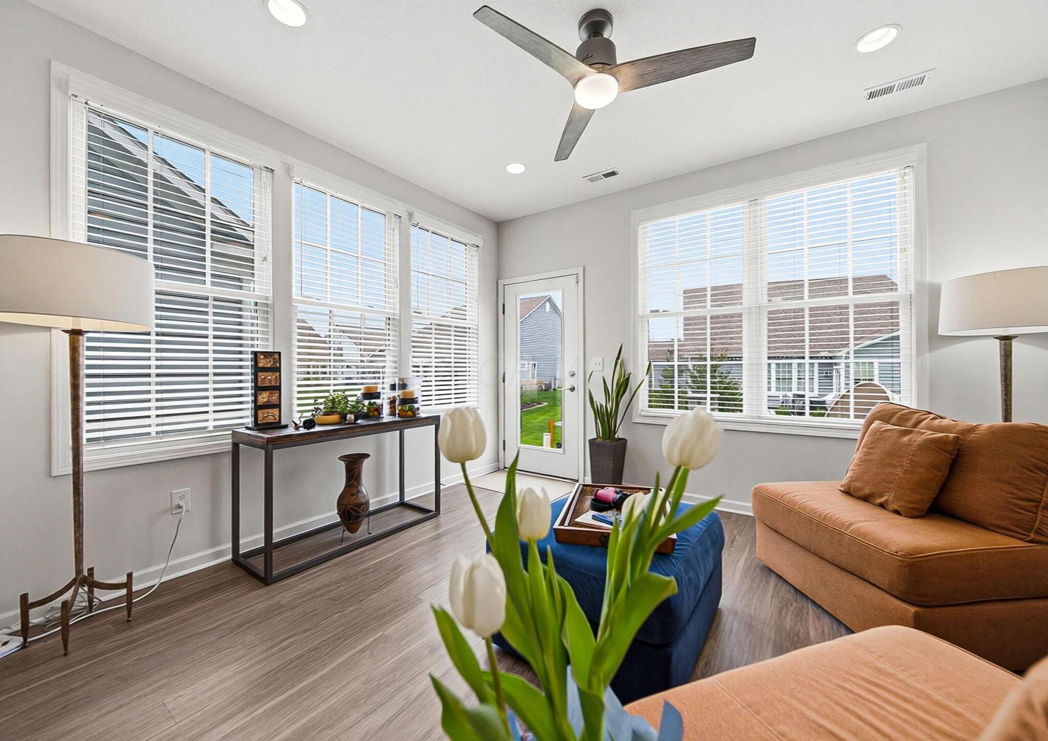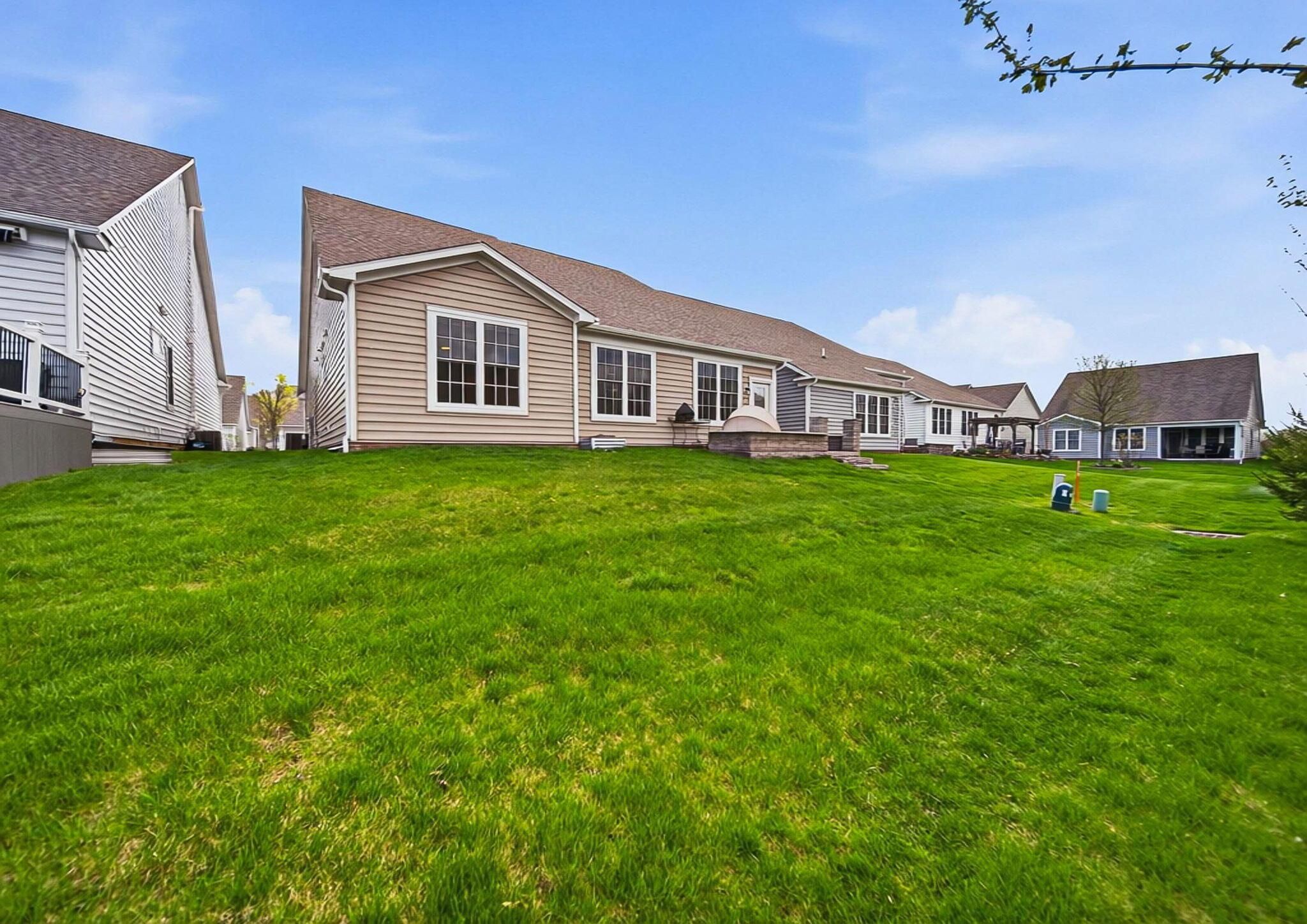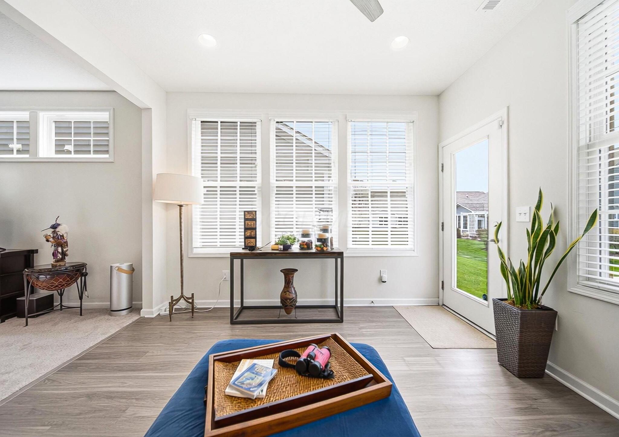 Where low maintenance living meets an active, connected lifestyle, this Ascend model in Nottingham Trace offers thoughtful design and effortless living. From morning walks and pickleball matches to evenings with neighbors at the clubhouse, this is a community designed to bring people together. Inside, this 2 bedroom, 2 bath ranch with 2 additional flexible bonus rooms and a sunroom offers tall ceilings, light filled spaces, and a layout that feels both open and intentional. At the center of the home, the kitchen is designed for everyday living and entertaining, featuring stainless steel appliances, quartz countertops, designer cabinetry, and a generous island that opens seamlessly to the main living areas. The private owner's suite provides a quiet retreat with a custom walk-in closet and an en suite bath complete with double vanity, soaking tub, and tiled walk-in shower. A secondary bedroom, full bath, and two versatile flex spaces offer flexibility for guests, work, or hobbies. A bright sunroom extends the living space and opens to a stamped concrete patio and welcoming front porch, creating an easy flow for indoor outdoor living. Additional highlights include upgraded lighting, custom window coverings, a dedicated laundry room with utility sink, smart home features, and an extended two car garage for added storage. Residents of Nottingham Trace enjoy access to a clubhouse with fitness center, pickleball and bocce courts, scenic walking and biking paths, and a stocked fishing pond. Lawn care and snow removal are included, offering a low maintenance lifestyle with added ease. A home that supports the way you want to live, every day.