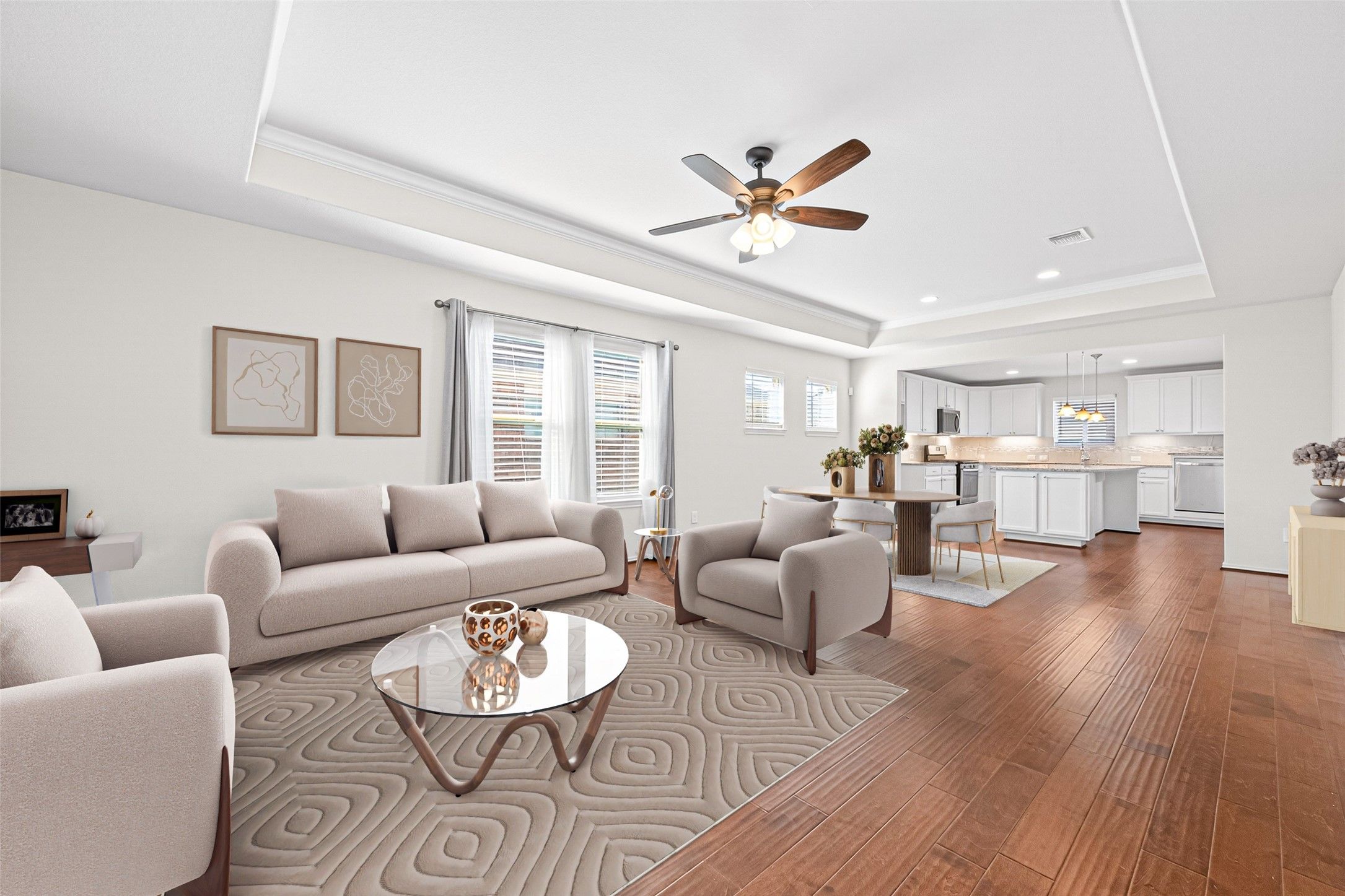 - Crown Molding, Double Vanity, Granite Counters, Kitchen Island, Kitchen/Family Room Combo, Pantry, Tub Shower, Makeup/Vanity Space, Window Treatments, Ceiling Fan(s), Programmable Thermostat