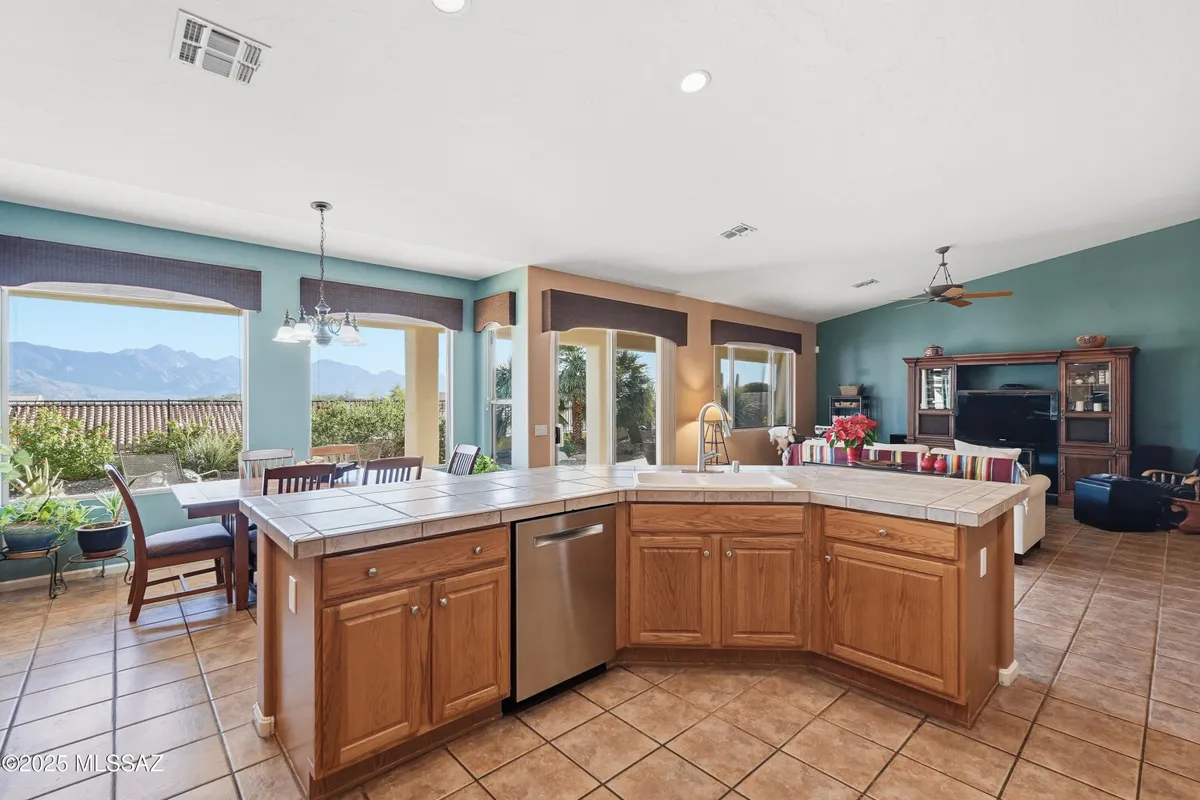 EXPERIENCE LIFE ABOVE THE CROWD! Sweeping Catalina Mountain views from beautifully upgraded home. Enjoy the enchanting desert beauty throughout this home, from a peaceful designer paint palette to adobe-inspired flooring decor. Take pleasure preparing meals in the oversized kitchen, complete with gorgeous tile counters, large island for coffee and entertaining, staggered cabinets, pantry, and handy cabinet rollouts. Magical southeast views fromthe kitchen, nook, and family room. Den/library has abundant built-ins and desk. The main bedroom features stunning mountain views, luxurious bath, and a huge walk-in closet. Upstairs is a large private guest suite, or the grandkids' retreat. Fully extended brick patio with VIEWS! Three car garage with workbench and storage. Sensational!