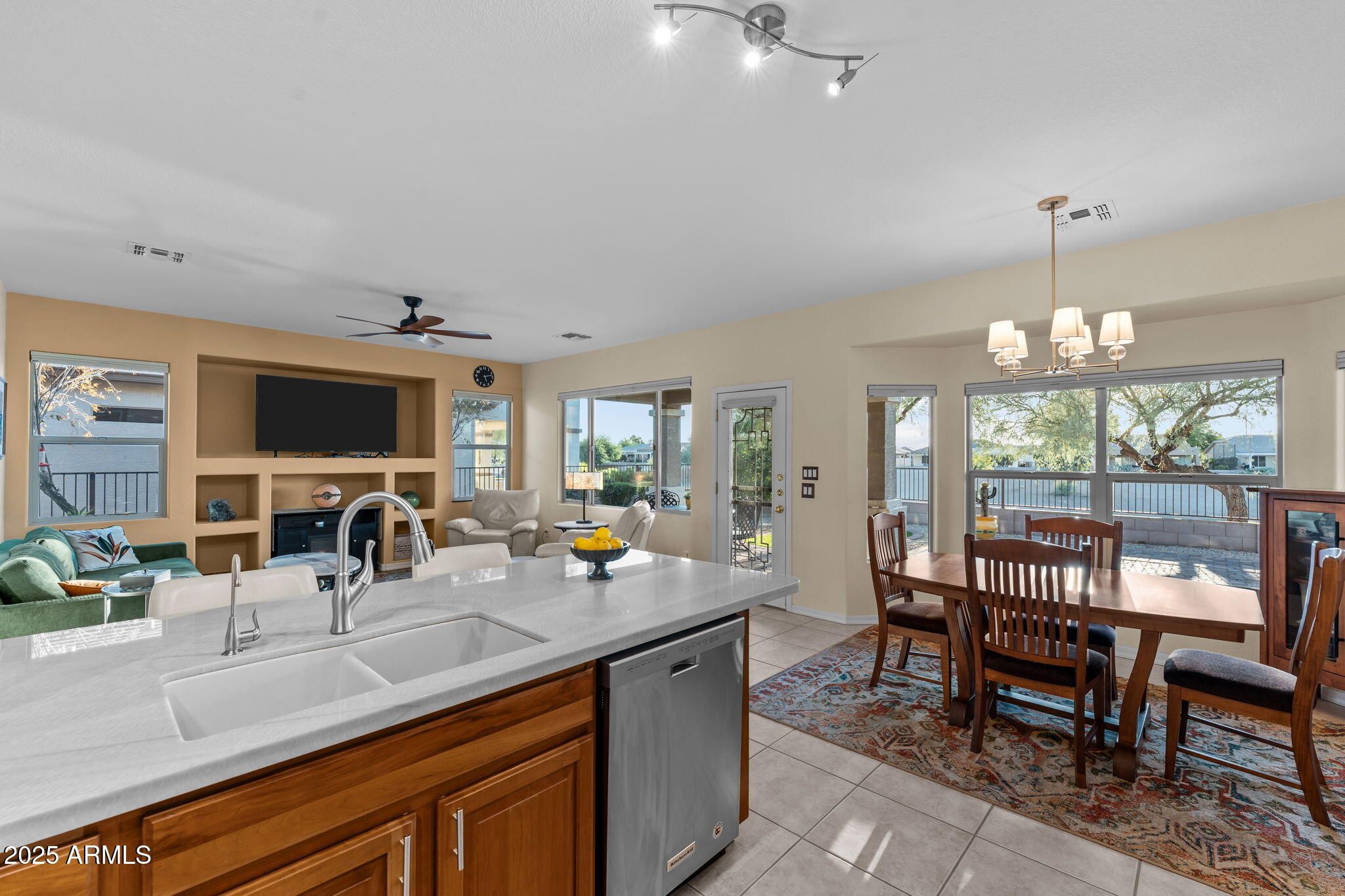 Situated on the 16th hole of Lone Tree Golf Course in the highly sought-after 55+ gated community of Solera Springfield Lakes, this beautifully maintained single-family home offers 1,516 sq.ft. of living space with 2 bedrooms (split), 2 bathrooms, & a den. The bright & open layout features a spacious great room & a dining area that flows seamlessly off the kitchen. The kitchen has been updated with new quartz counters, stunning cabinetry, backsplash, pull-out shelves, & a new sink with RO system. The primary suite includes two closets, a new walk-in shower, granite countertops, & a private toilet room. Step outside to the full-length covered patio overlooking a newly refreshed veranda & west-facing backyard, perfect for sunsets & golf course views. Recent updates include: new HVAC, garage door, front door, soft water system, RO system, 4 ceiling fans, light fixtures, toilets, & more, making this home move-in ready. Community amenities include lighted pickleball/tennis courts, two heated pools & spa, two fitness rooms, billiards, crafts, ballroom, & an active calendar of social events. Conveniently close to Chandler's best shopping, dining, & entertainment. Experience the best of Arizona living in this welcoming, amenity-rich community.