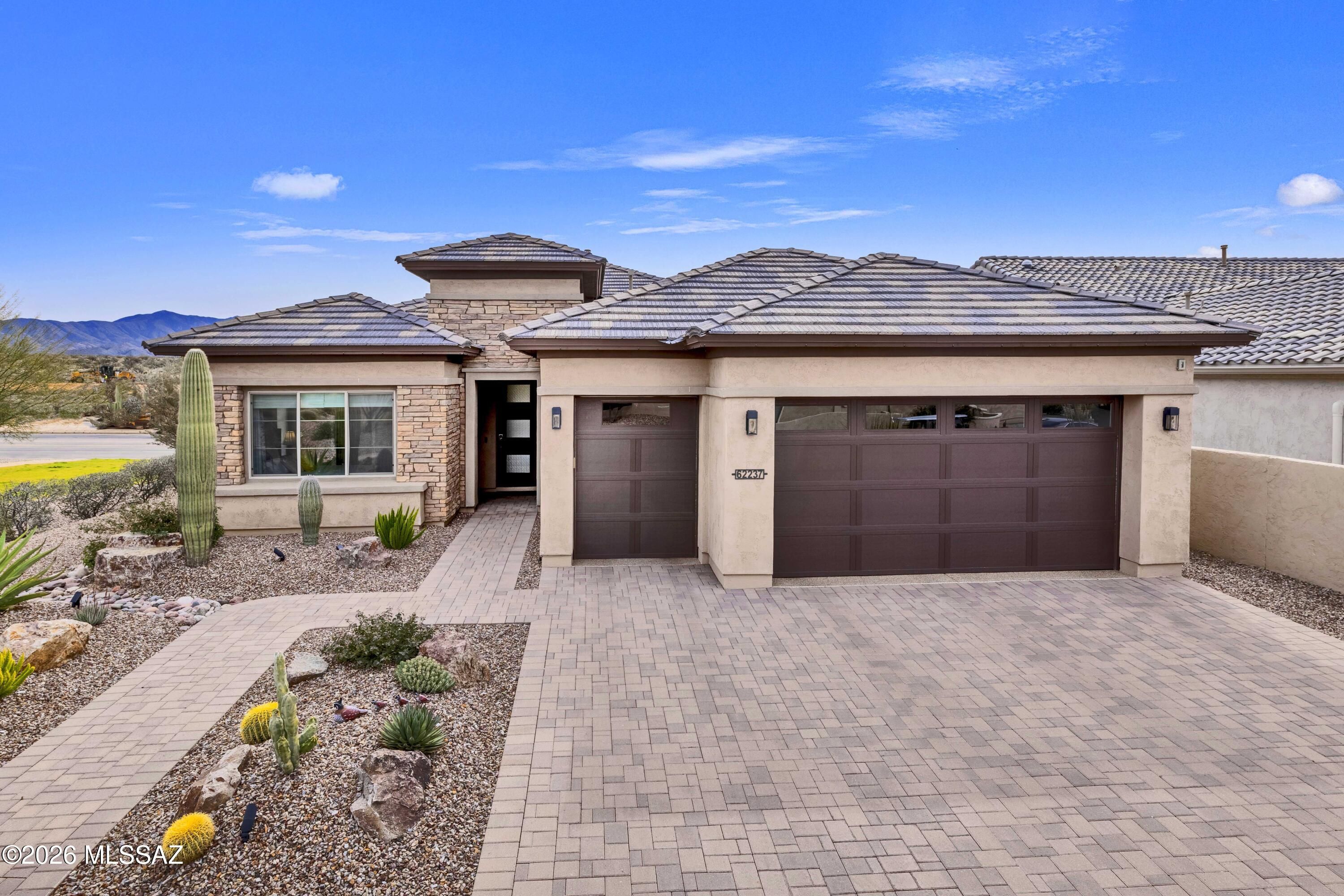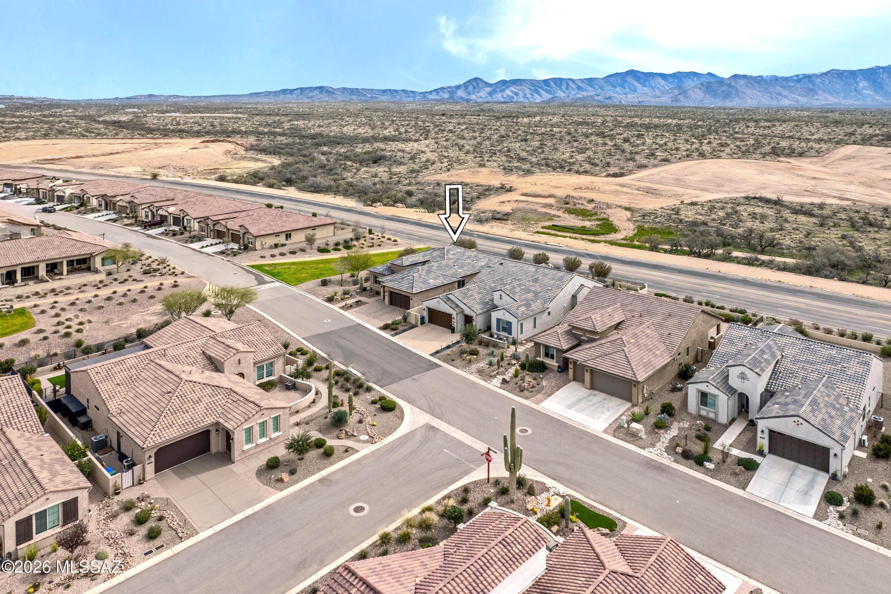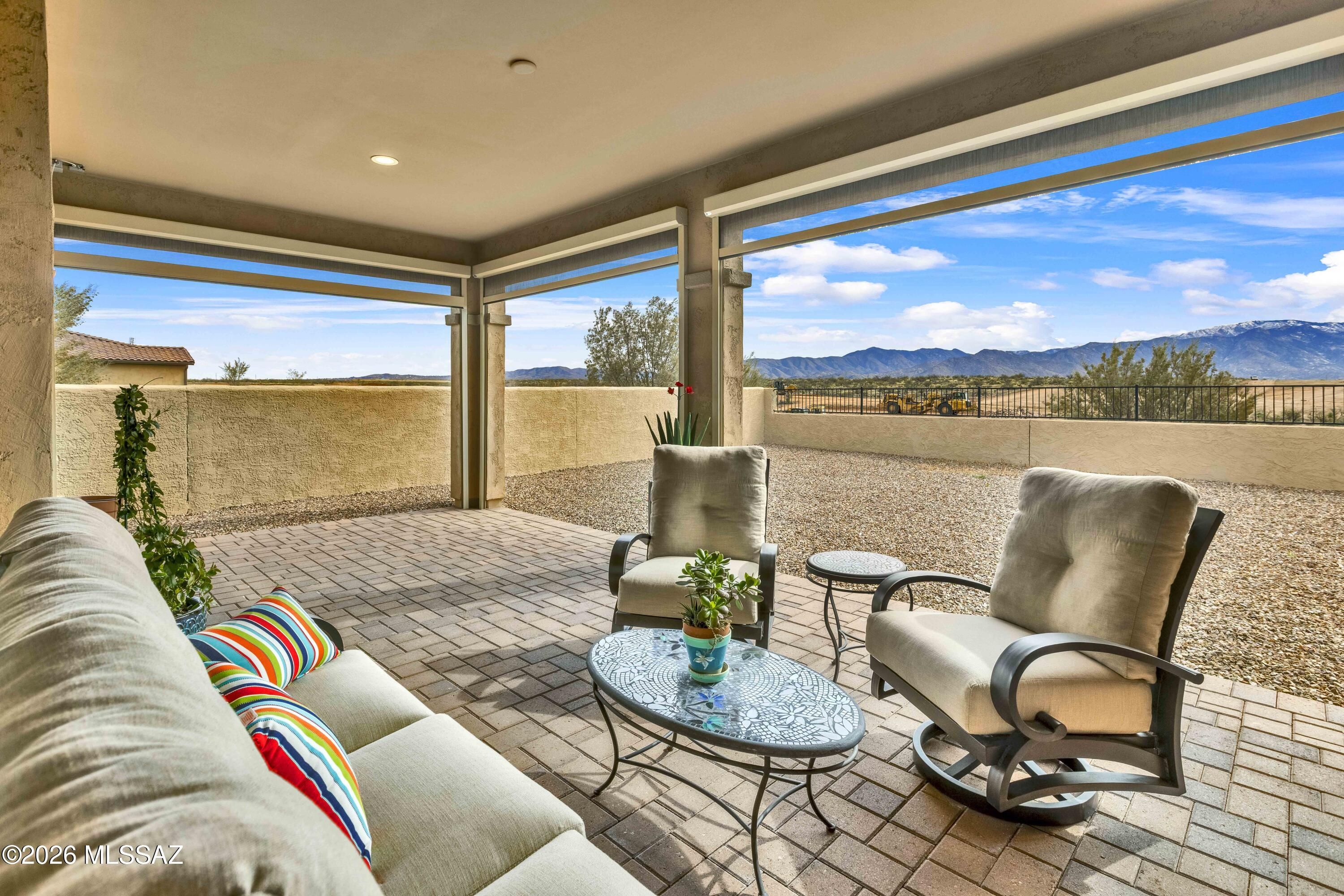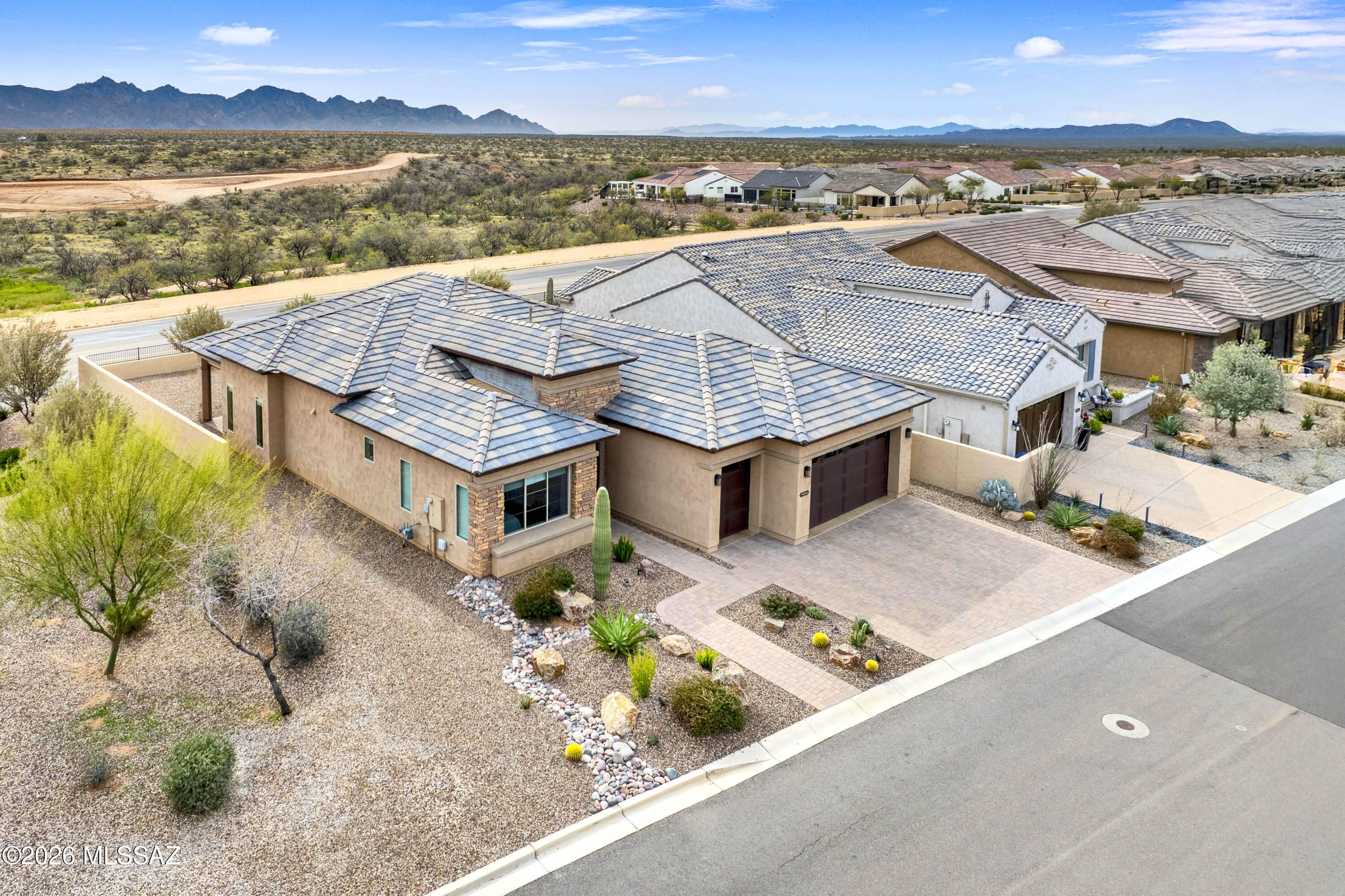 Immaculate one-owner Alora model with stunning mountain views! 2BR/2.5BA features open-concept living with upgraded trim. The gourmet kitchen showcases ceiling-height soft-close cabinets, quartz countertops, an island & walk-in pantry. Primary suite boasts upgraded tile shower, dual vanities & custom built-ins in walk-in closet. Office/den with barn door & Murphy bed, perfect guest space! Fenced yard, Resort-style patio features brick pavers, gas fireplace & electric shades for entertaining. Ext 3-car garage offers epoxy floors, custom cabinets, wall organization, and a tankless water heater. Premium lot with stunning mountain Views! Home is next to community green space in SaddleBrooke Ranch. Call to schedule a showing!