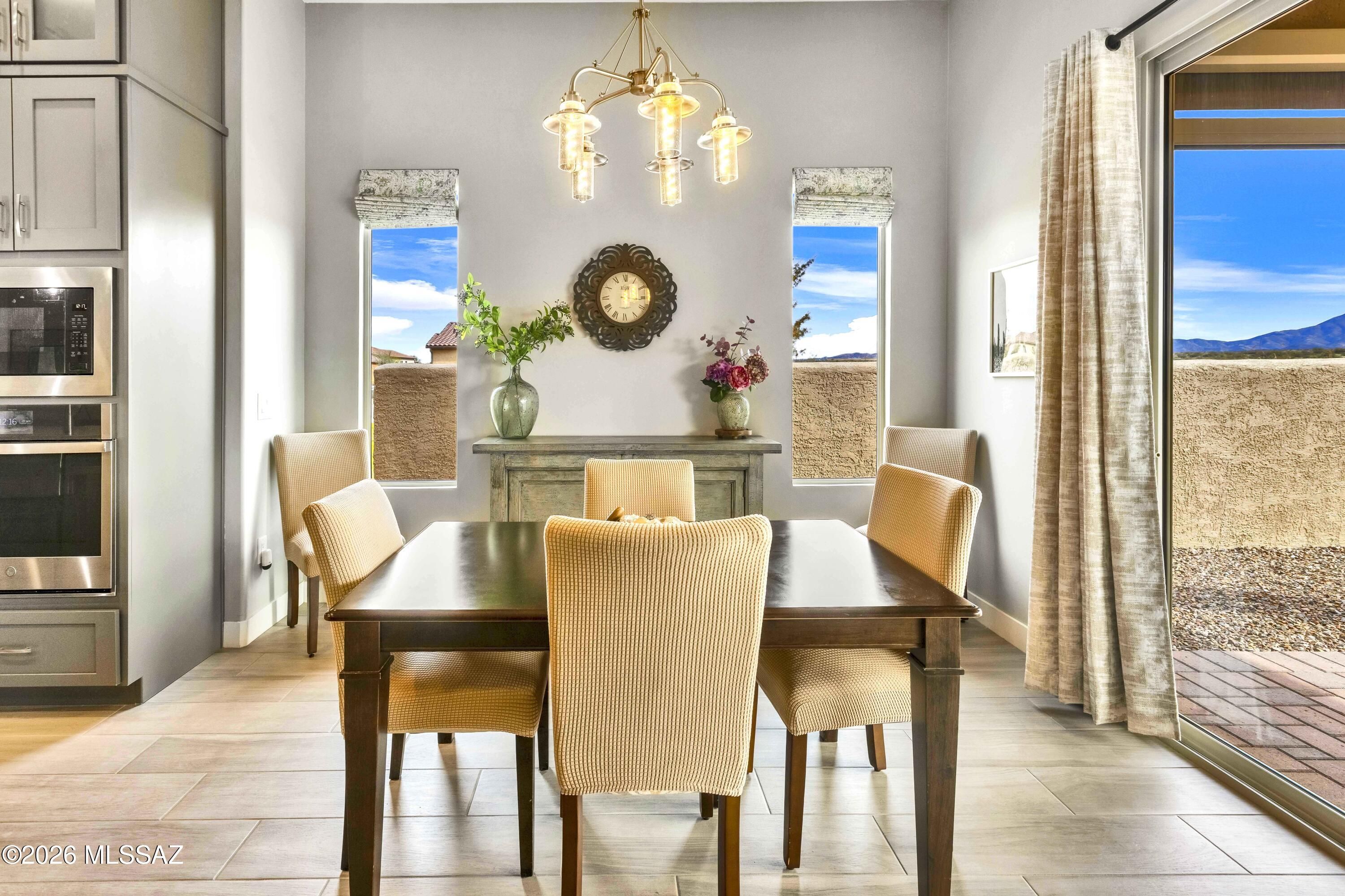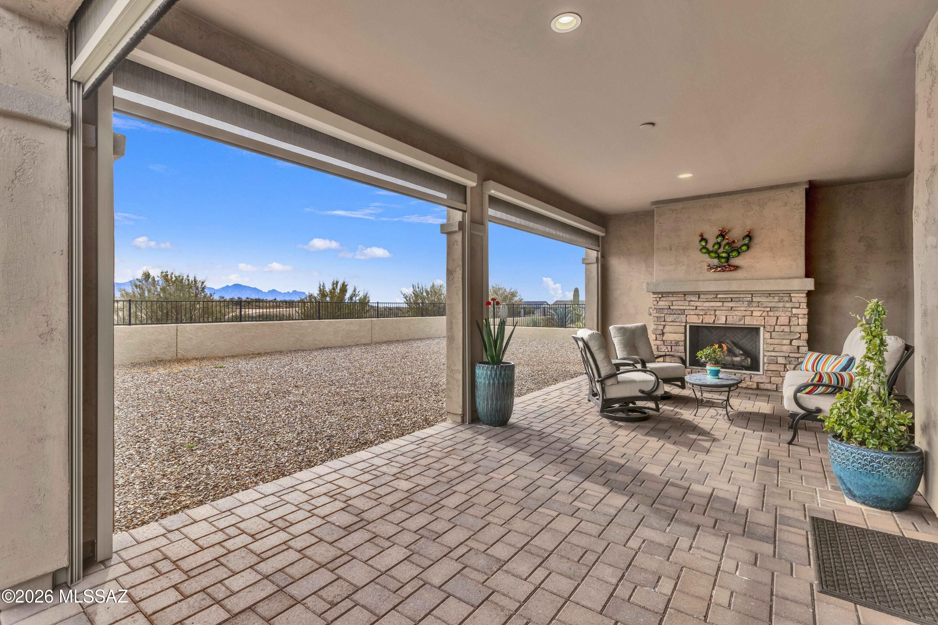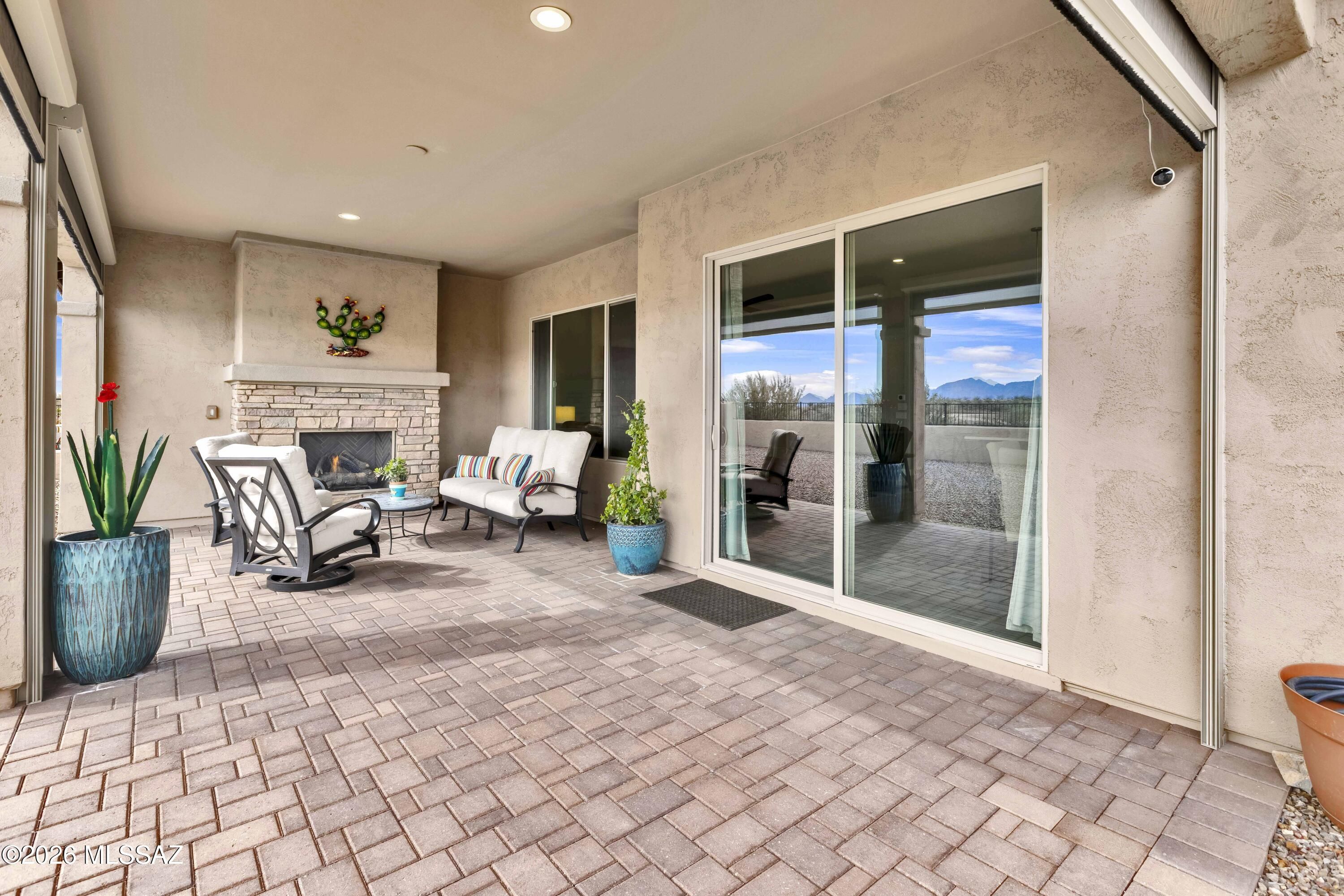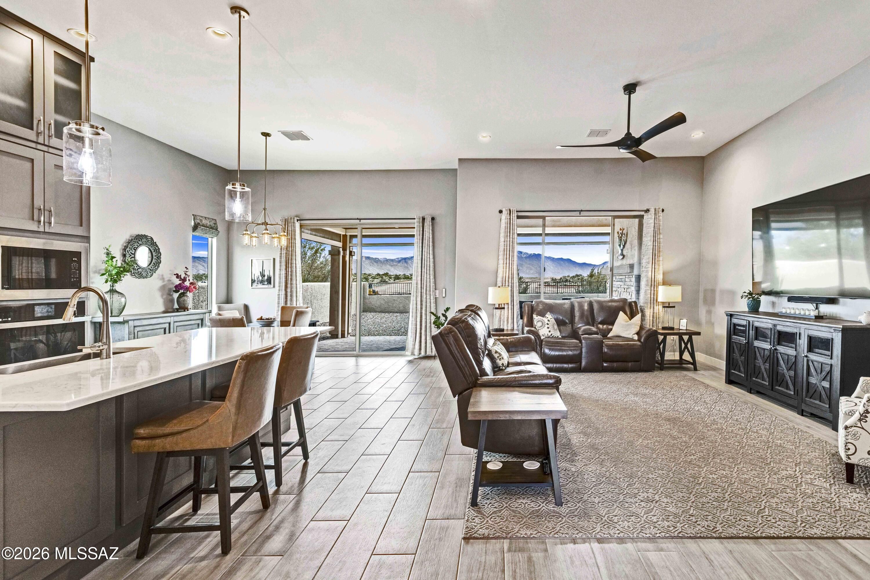 Immaculate one-owner Alora model with stunning mountain views! 2BR/2.5BA features open-concept living with upgraded trim. The gourmet kitchen showcases ceiling-height soft-close cabinets, quartz countertops, an island & walk-in pantry. Primary suite boasts upgraded tile shower, dual vanities & custom built-ins in walk-in closet. Office/den with barn door & Murphy bed, perfect guest space! Fenced yard, Resort-style patio features brick pavers, gas fireplace & electric shades for entertaining. Ext 3-car garage offers epoxy floors, custom cabinets, wall organization, and a tankless water heater. Premium lot with stunning mountain Views! Home is next to community green space in SaddleBrooke Ranch. Call to schedule a showing!