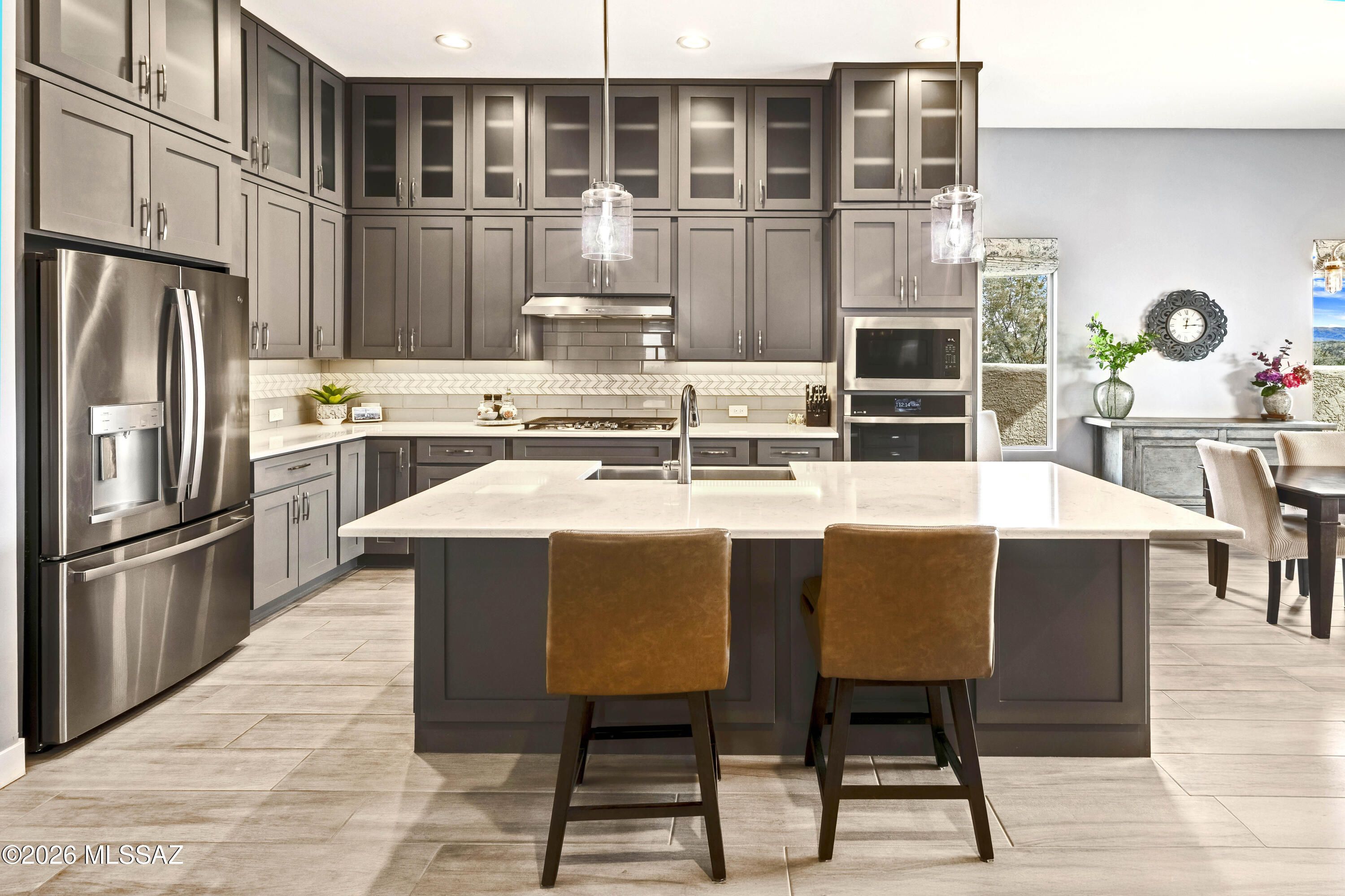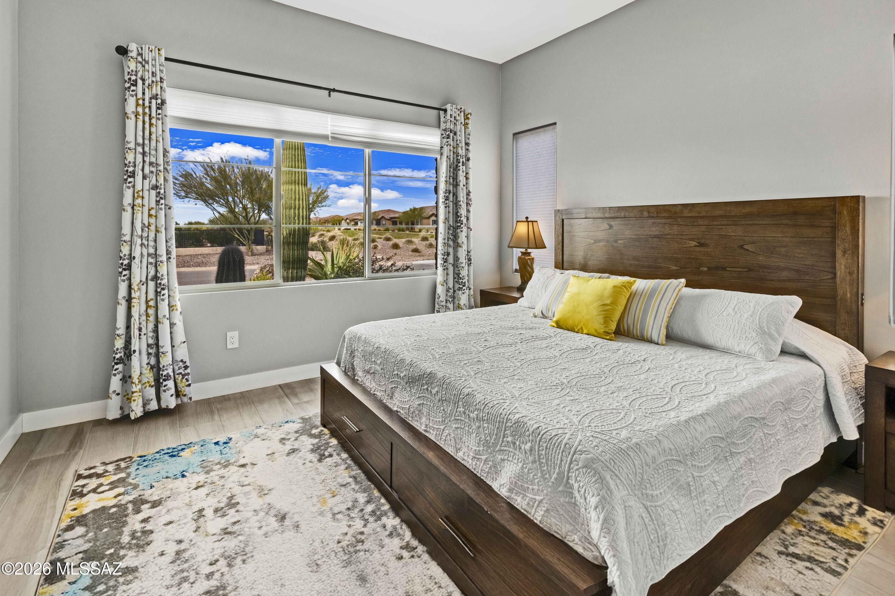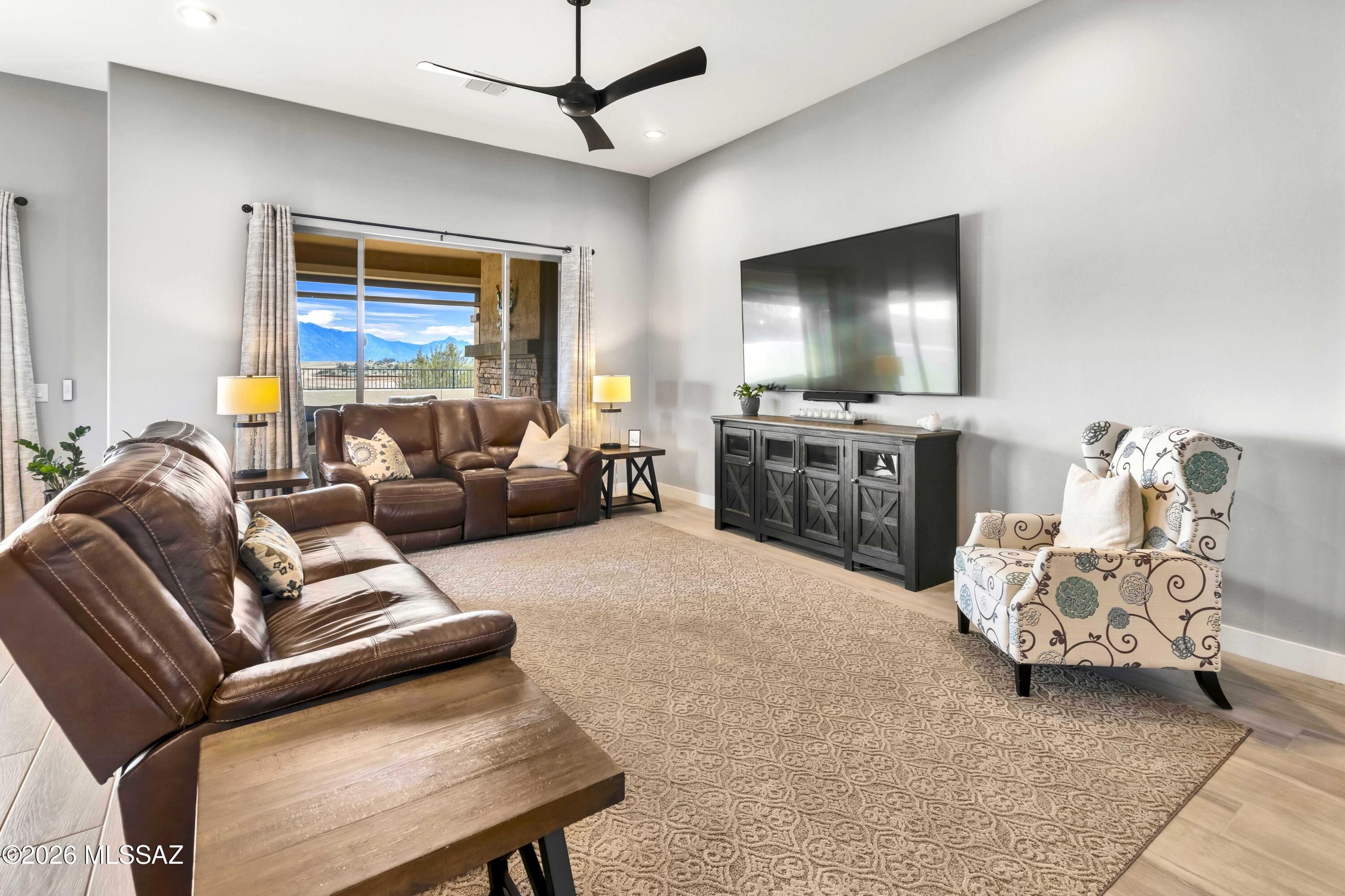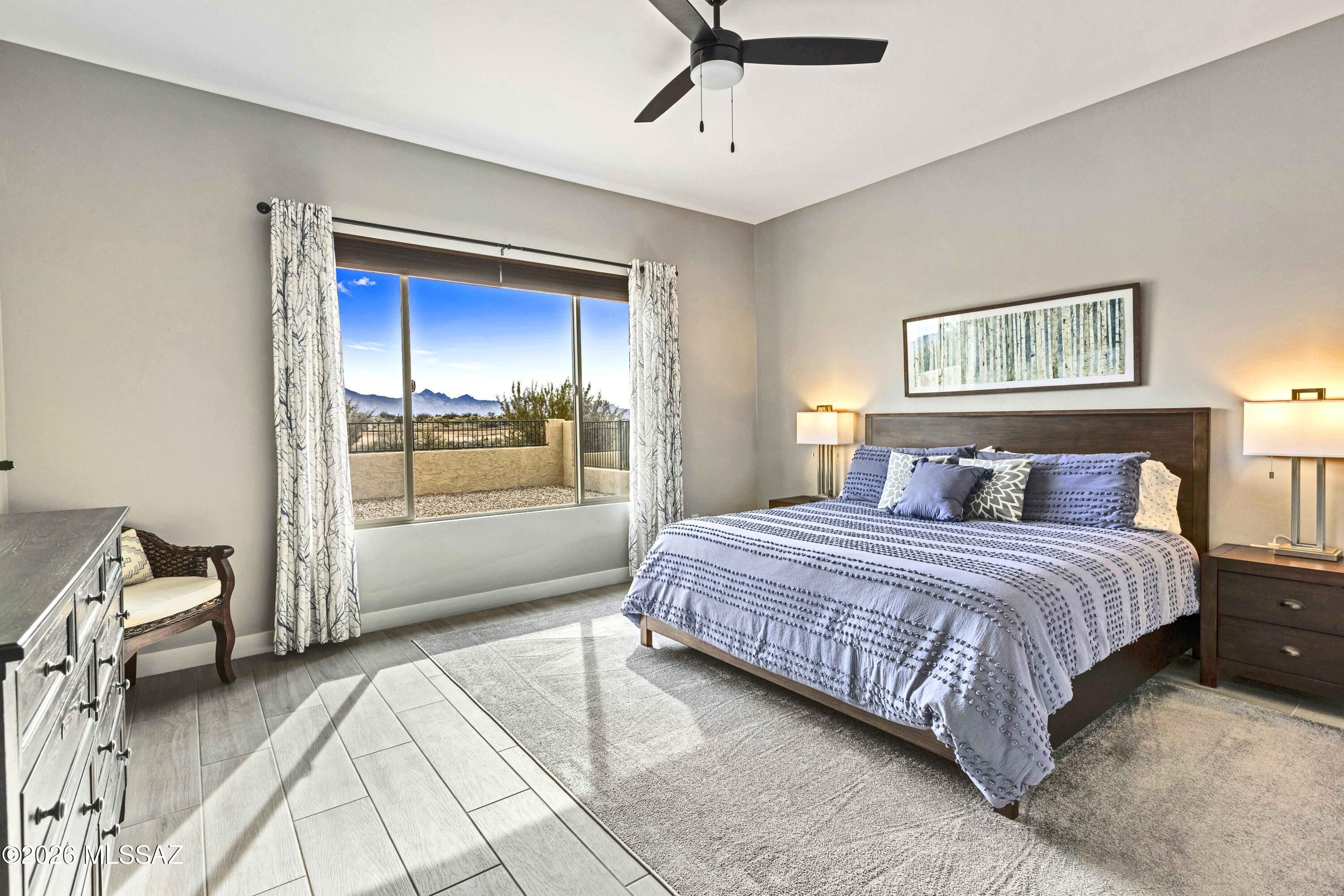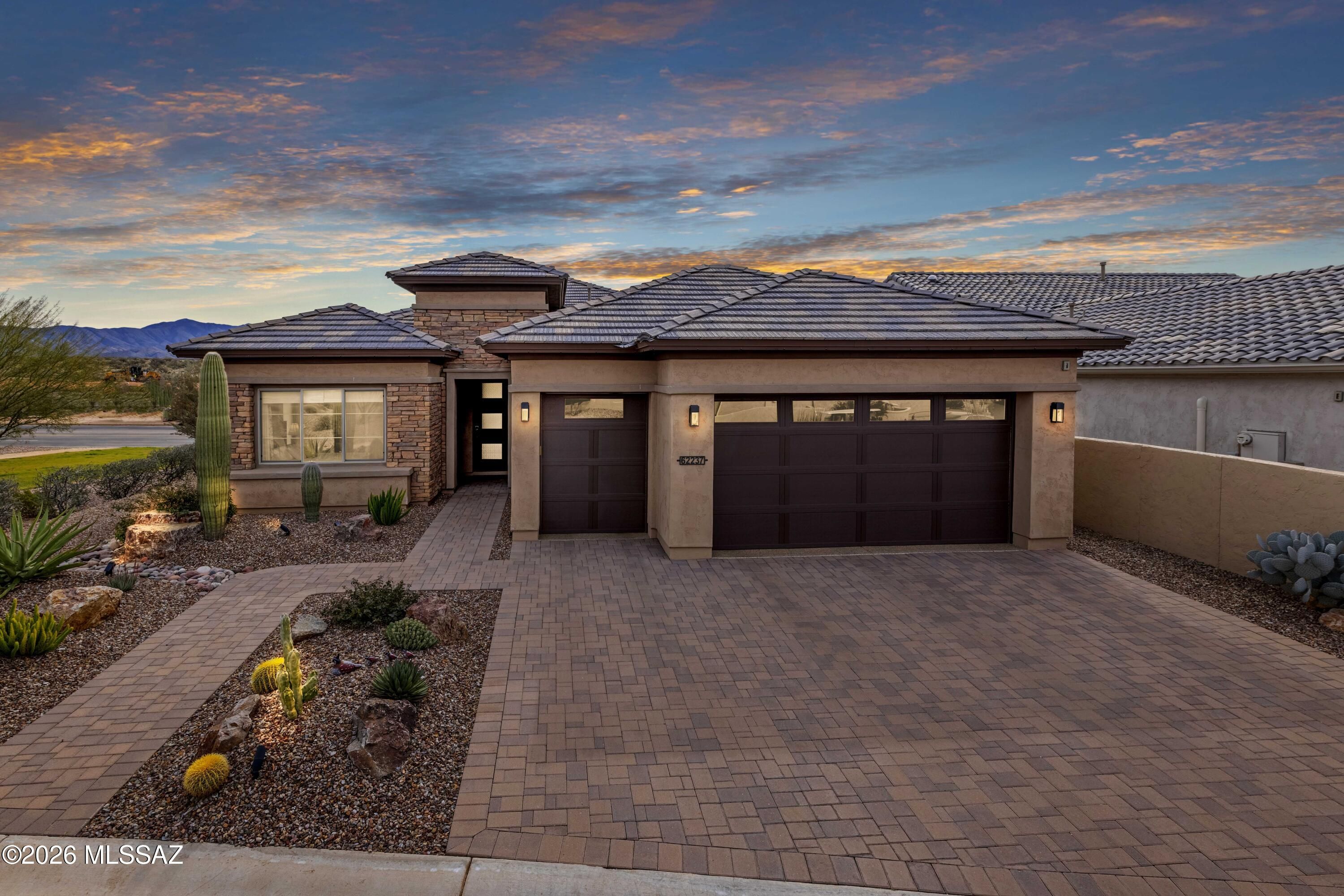 Immaculate one-owner Alora model with stunning mountain views! 2BR/2.5BA features open-concept living with upgraded trim. The gourmet kitchen showcases ceiling-height soft-close cabinets, quartz countertops, an island & walk-in pantry. Primary suite boasts upgraded tile shower, dual vanities & custom built-ins in walk-in closet. Office/den with barn door & Murphy bed, perfect guest space! Fenced yard, Resort-style patio features brick pavers, gas fireplace & electric shades for entertaining. Ext 3-car garage offers epoxy floors, custom cabinets, wall organization, and a tankless water heater. Premium lot with stunning mountain Views! Home is next to community green space in SaddleBrooke Ranch. Call to schedule a showing!