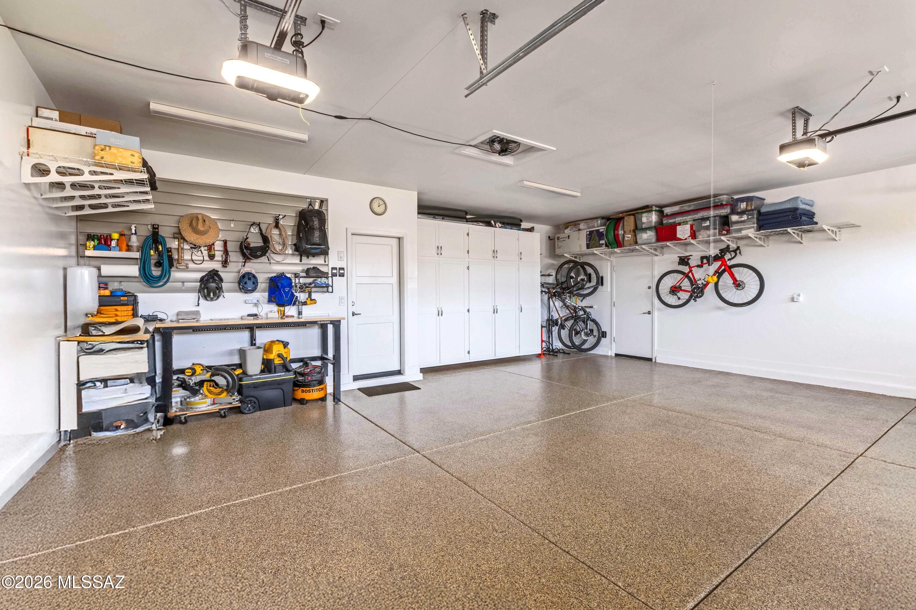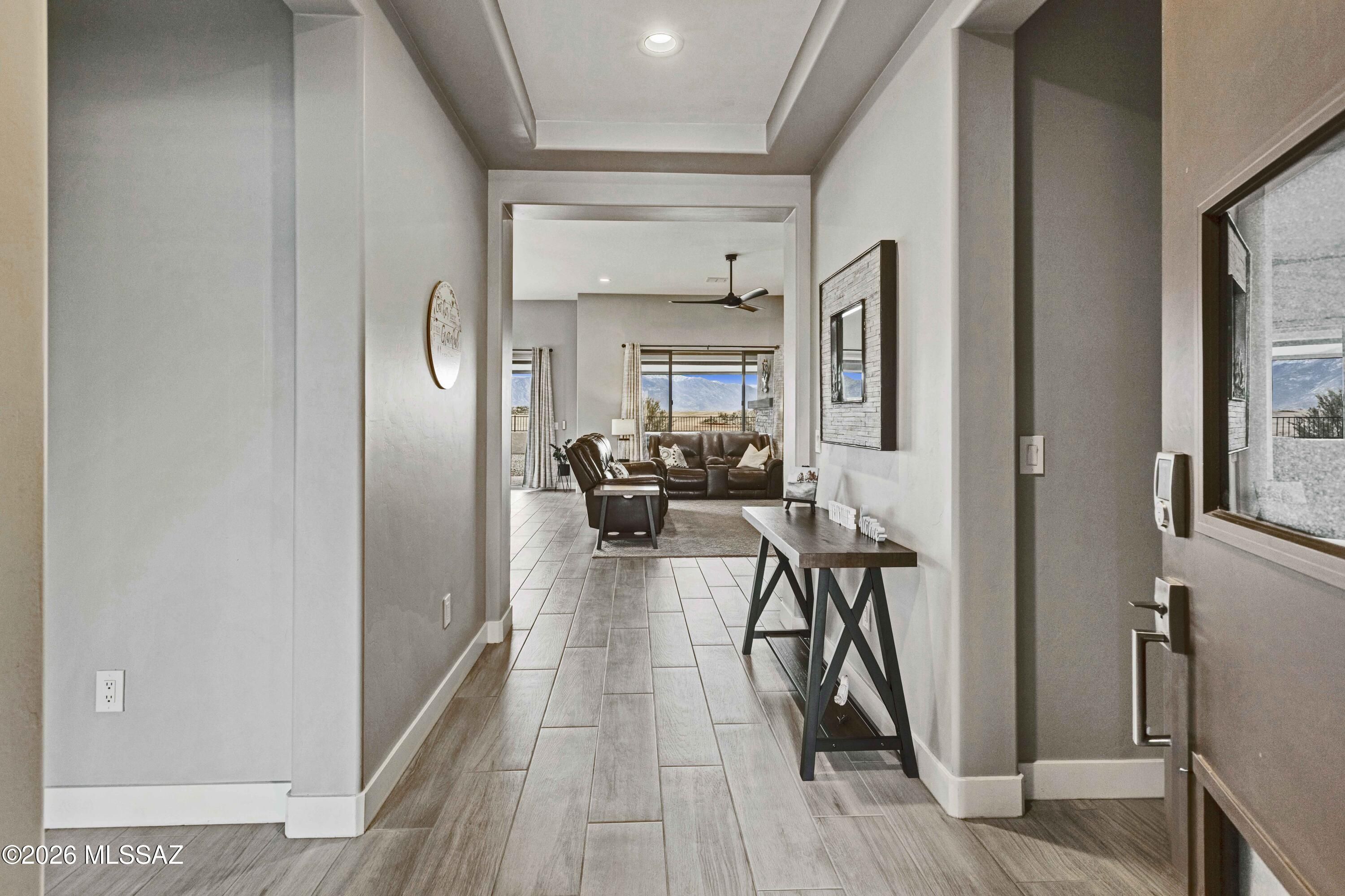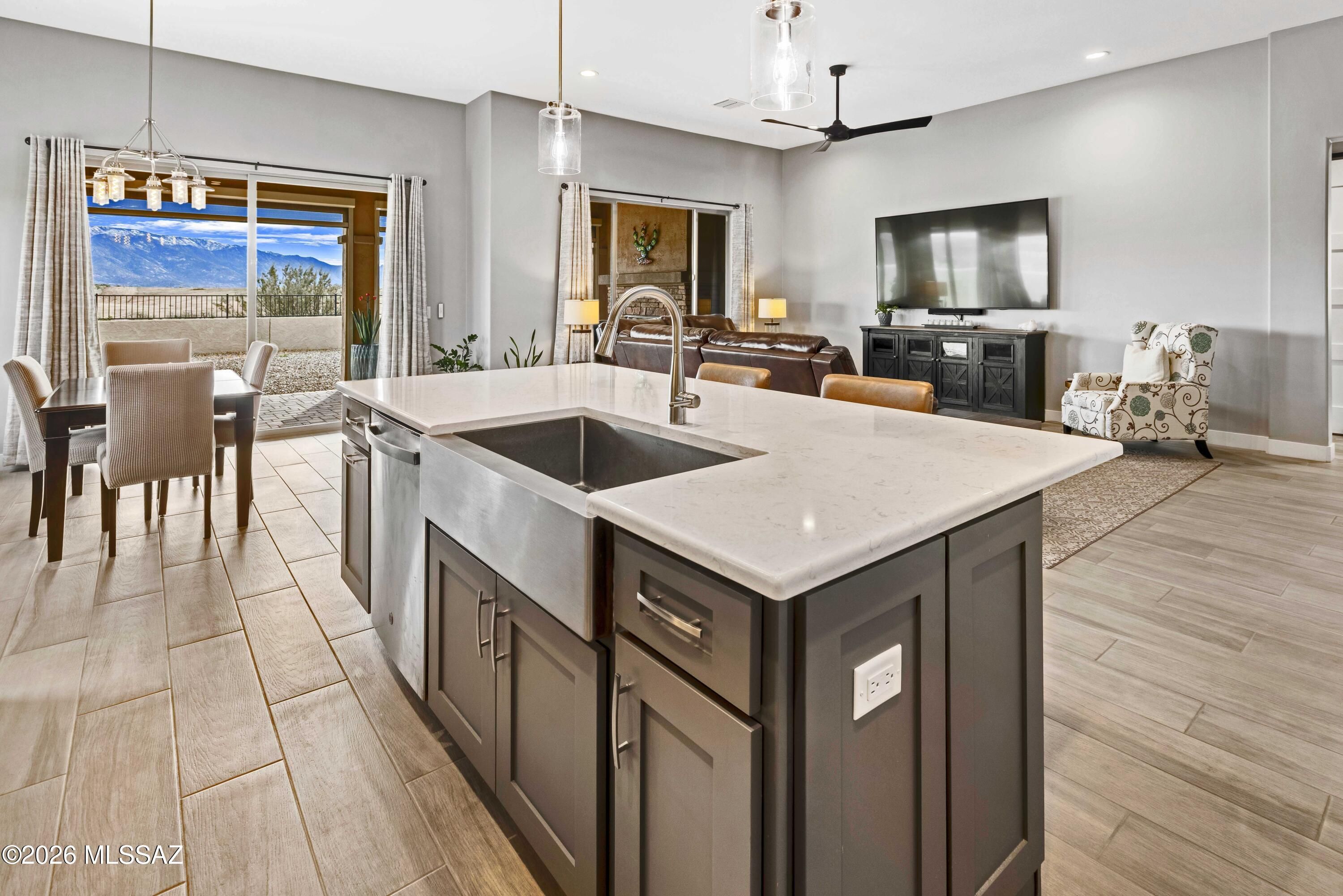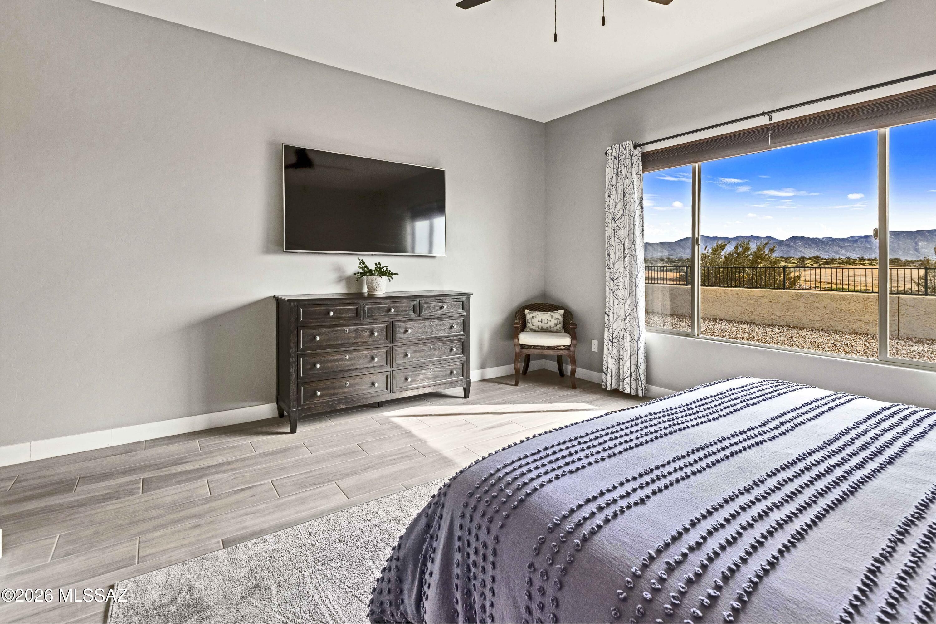 Immaculate one-owner Alora model with stunning mountain views! 2BR/2.5BA features open-concept living with upgraded trim. The gourmet kitchen showcases ceiling-height soft-close cabinets, quartz countertops, an island & walk-in pantry. Primary suite boasts upgraded tile shower, dual vanities & custom built-ins in walk-in closet. Office/den with barn door & Murphy bed, perfect guest space! Fenced yard, Resort-style patio features brick pavers, gas fireplace & electric shades for entertaining. Ext 3-car garage offers epoxy floors, custom cabinets, wall organization, and a tankless water heater. Premium lot with stunning mountain Views! Home is next to community green space in SaddleBrooke Ranch. Call to schedule a showing!