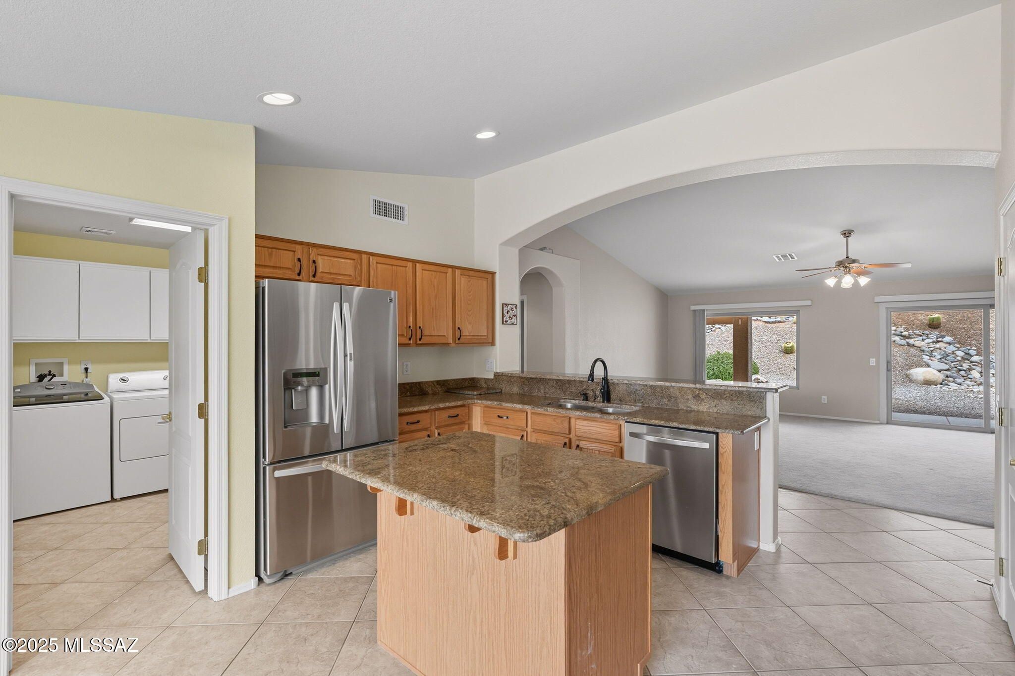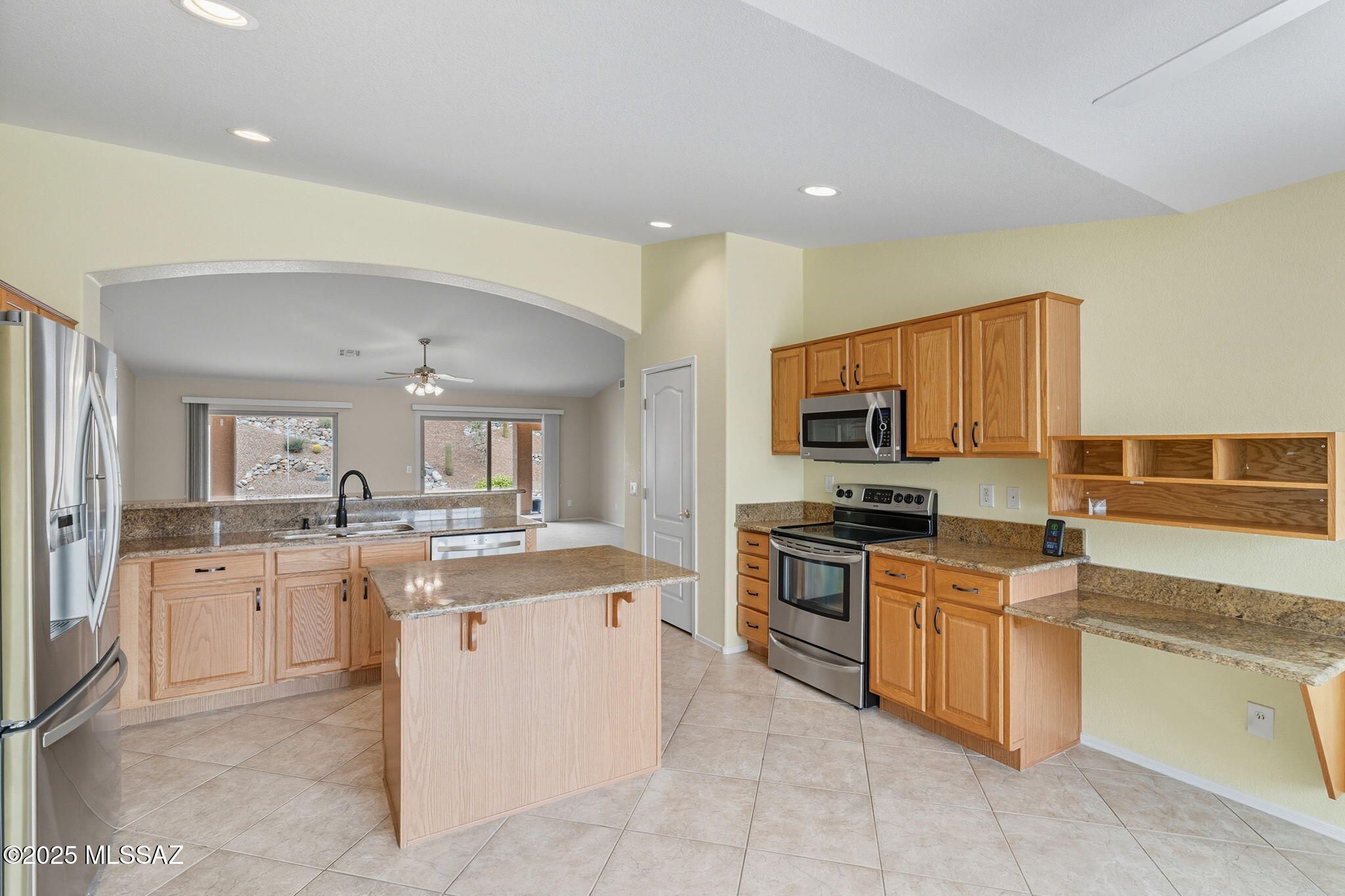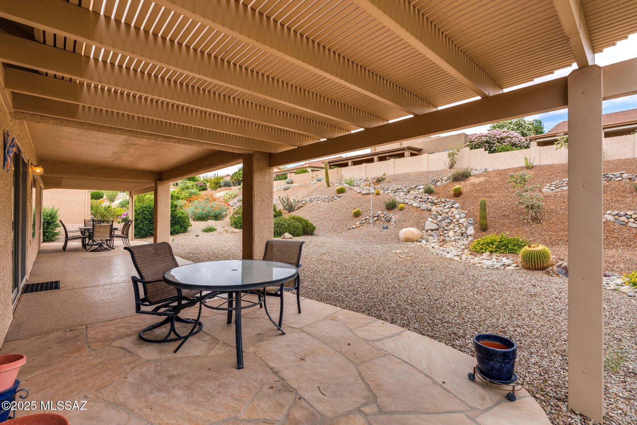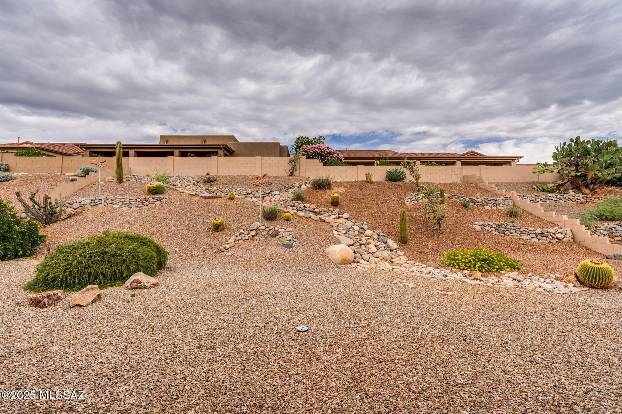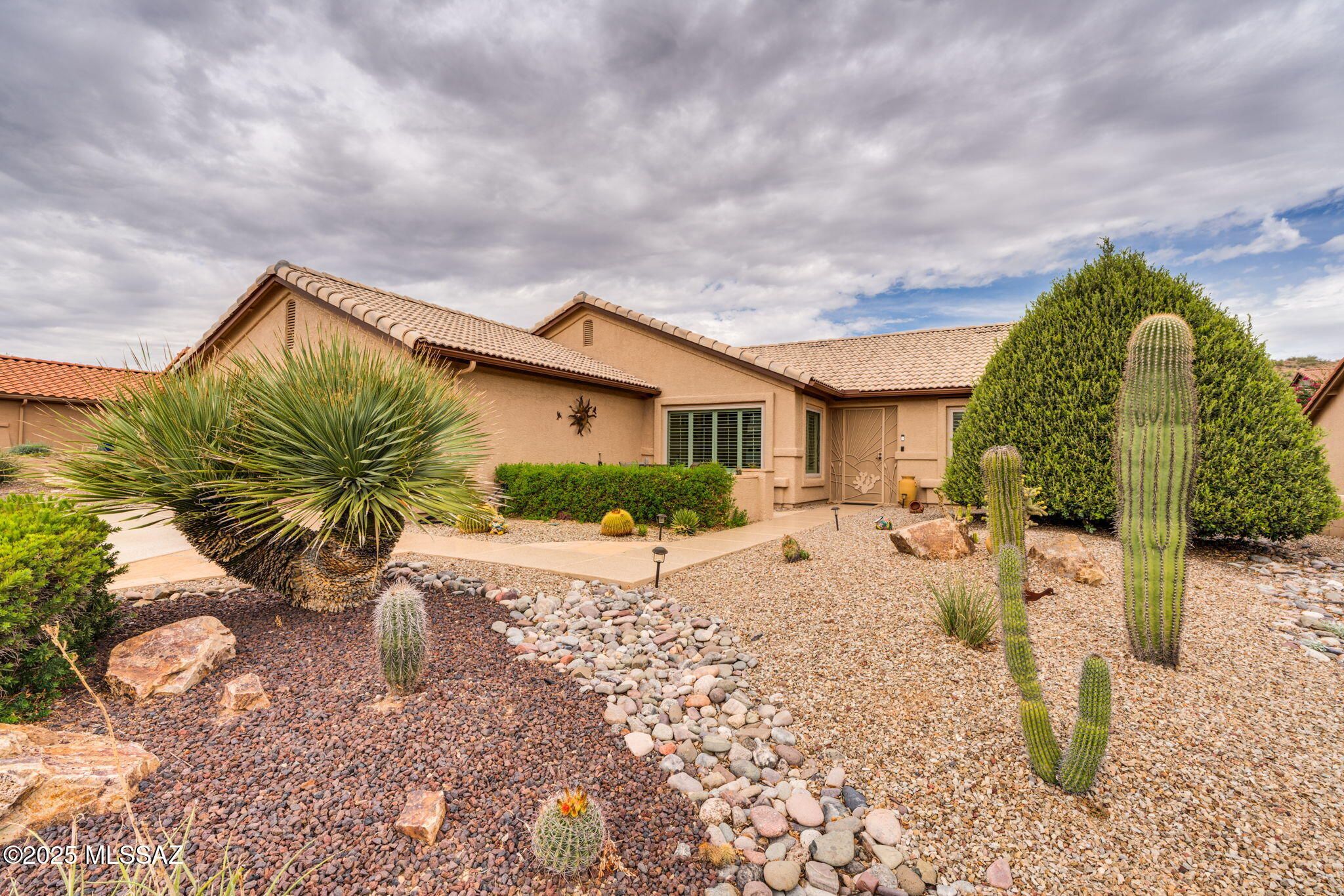 Charming Laredo plan resides on a spacious lot offering front Catalina views. New Roof Underlayment (2024), Windows (2019), HVAC/Water Heater (2015). Epoxy drive/walkway flows to Courtyard with Stone Cactus Water Feature. Enter to find an open concept plan with soaring vaulted ceilings, rear patio slider, plantation shutters and solar tubes. Kitchen hosts Granite counters, Stainless appliances, Island & Dining Nook. Primary suite offers Granite dual sink vanity, custom walk-in shower & closet. Built-in workstation in Den with Views. Guest Room with Views accesses hall bath. Laundry Room with cabinets and Extended 2-Car Garage with Utility Sink/Cabinets. Rear covered patio has Pergolas at each end for added shade. Pristine Landscape with 2 Orange Trees. SaddleBrooke Active Adult Community.