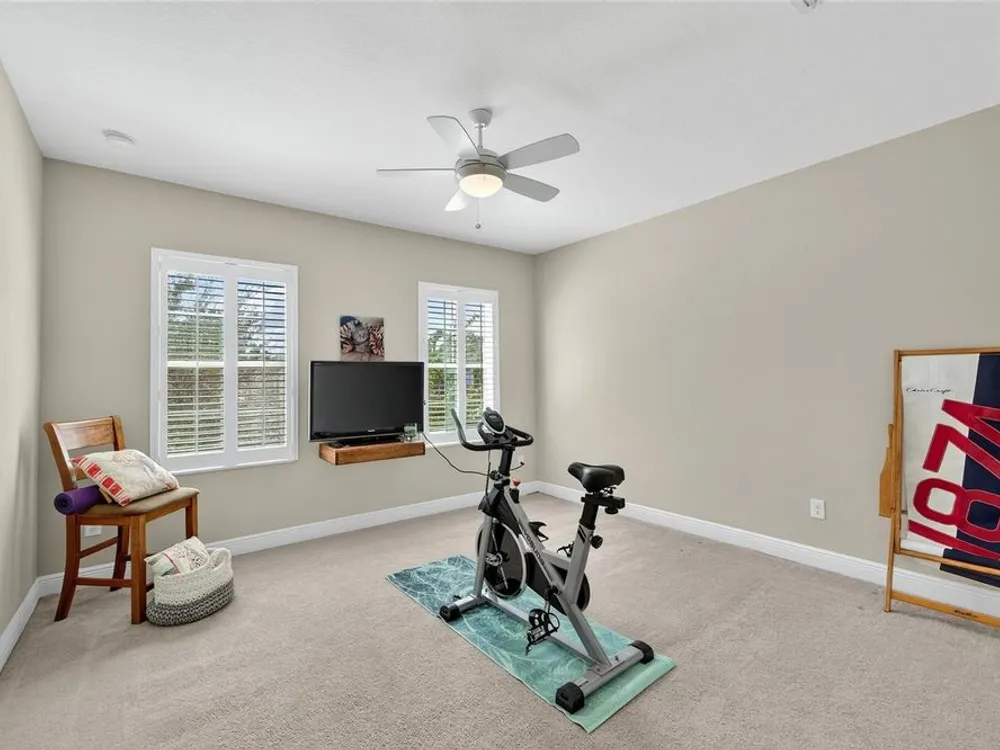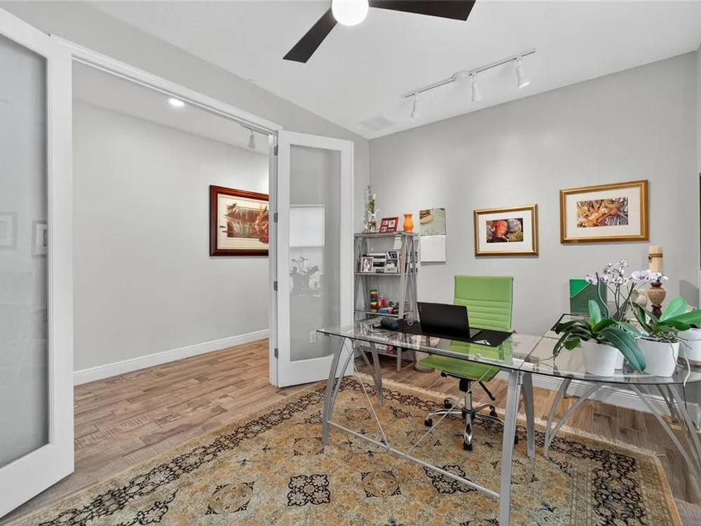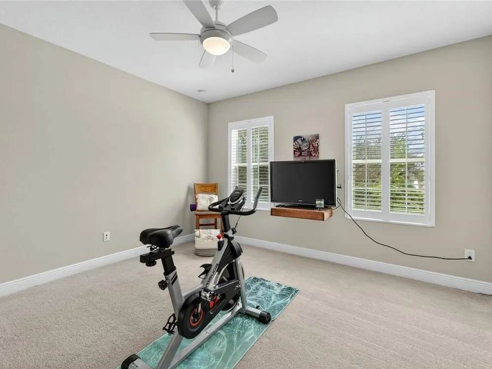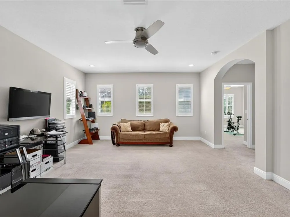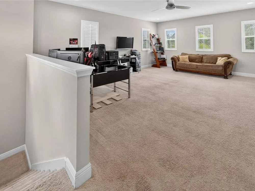 - Ceiling Fan(s), High Ceilings, Kitchen/Family Room Combo, Open Floorplan, Main Level Primary, Split Bedrooms, Stone Counters, Walk-In Closet(s), Window Treatments