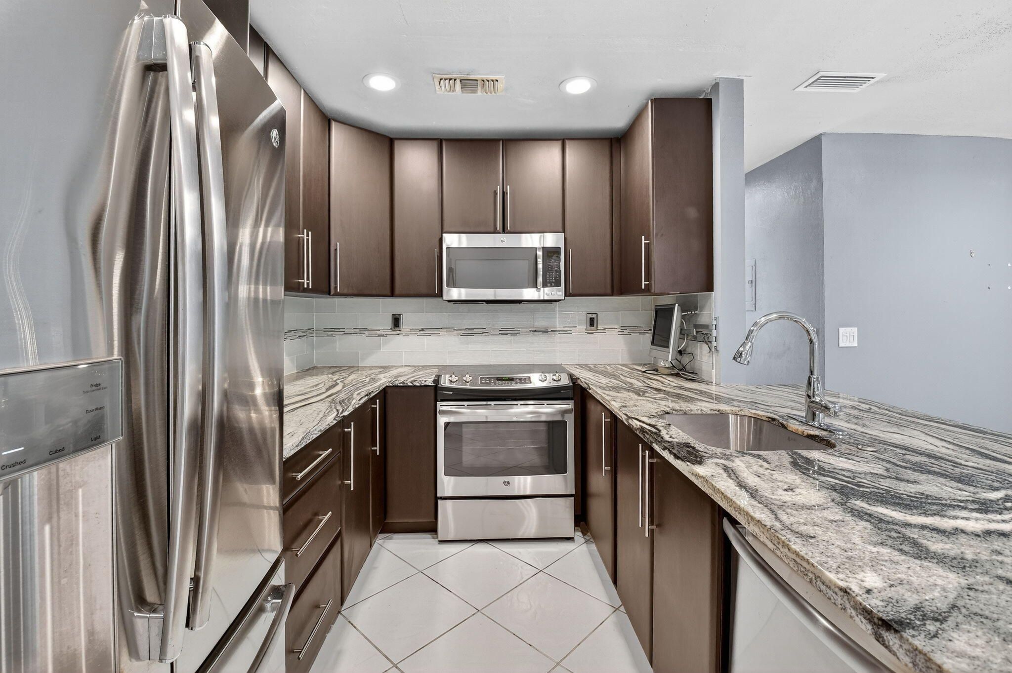 Discover the largest one-bedroom condo in Kings Point, originally a two-bedroom thoughtfully converted into a spacious one-bedroom retreat. This unique layout boasts an expansive 5' x 13' walk-in closet plus an additional 8' x 3.5' closet, providing exceptional storage rarely found in a condo. The kitchen has been beautifully opened up and upgraded with custom cabinetry, quartz countertops, and a stylish glass tile backsplash, creating a modern and inviting space. Both full bathrooms have been recently updated with elegant tile finishes and sleek glass shower doors. The bedroom opens directly to a stunning golf course view down the fairway, offering a serene and picturesque backdrop. Kings Point is a vibrant 55+ active community featuring world-class amenities including golf, pools, clubhouses, entertainment, and social activities. Ideally located just minutes from Downtown Delray Beach and Delray Marketplace, this condo offers both luxury and convenience. Don't miss this rare opportunity to own one of the most spacious and upgraded residences in Kings Point!