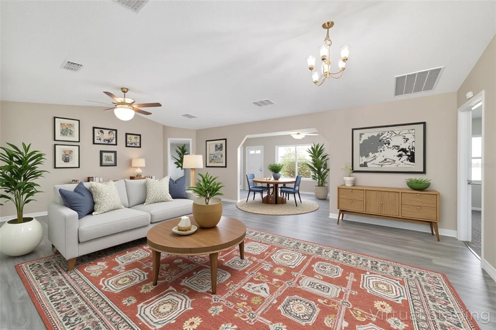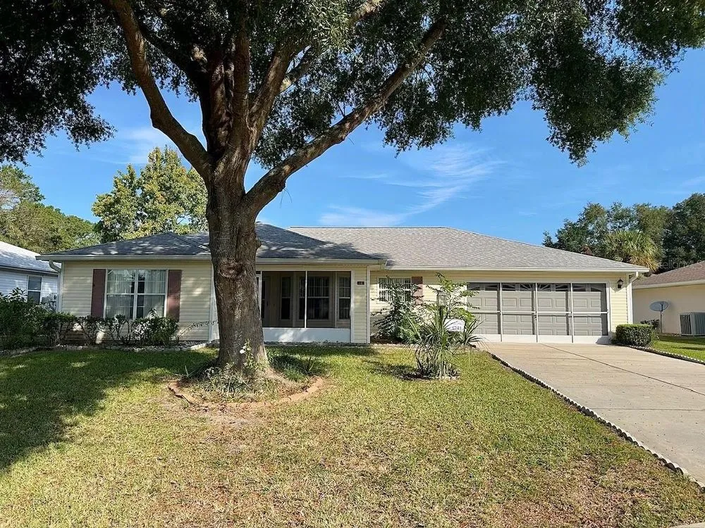 One or more photo(s) has been virtually staged. 55+ community • 2021 roof • Bonus/flex room • Screened front entry • Screened garage door enclosure • Vinyl siding with shutter accents • Updated flooring • Granite counters • Pantry • All bedrooms carpeted • Oversized 2-car garage • Low $175 monthly HOA • RV/boat parking • Heated pool & spa • Bowling alley • Fitness room • Tennis & shuffleboard • Near shopping, dining & medical facilities This single-story home offers 1,808 sq ft of heated living space (2,228 sq ft total) on a 0.17-acre lot in Marion Landing, a 55+ community with extensive amenities in SW Ocala. The exterior includes vinyl siding with shutter accents, a screened front entry, concrete walkway to the front door, shrub and palm landscaping, a mature shade tree, and an extended driveway. A screened garage door enclosure provides ventilation and shade while maintaining visibility and privacy. The 2021 roof contributes to long-term durability. Inside, the open layout features a vaulted ceiling, neutral interior paint, and wide-plank waterproof vinyl flooring throughout the main living areas. An arched passthrough leads to a spacious bonus/flex room that can support office needs, hobby use, entertainment, or additional seating. Natural light enhances the overall interior function and design. The kitchen includes granite countertops, mosaic tile backsplash, matching stainless appliances (refrigerator, range, microwave), tile flooring, and pantry storage. A split bedroom layout supports privacy. All bedrooms feature carpeted flooring, and the primary suite includes a tray ceiling, walk-in closet, granite vanity, and a step-in shower with grab bars. The guest bath also includes a grab bar at the shower. The oversized 2-car garage includes the laundry closet with shelving and additional room for storage. The screened garage door enclosure allows airflow and functional shade while maintaining the ability to fully secure the space. Marion Landing amenities include a Lifestyle Center clubhouse, heated swimming pool, spa patio, fitness room, craft rooms, billiards, an eight-lane bowling alley, tennis courts, shuffleboard, bocce, basketball, and a stocked fishing pond. RV/boat parking is available within the community. The low $175 monthly HOA fee includes water, sewer, trash service, and full access to all amenities. Nearby destinations include Paddock Mall (2.2 mi), Market Street at Heath Brook (2.4 mi), and HCA Florida West Marion Hospital (3.1 mi). Quick access to I-75 provides direct routes to Orlando International Airport (MCO) and Tampa International Airport (TPA). Virtual tour available.