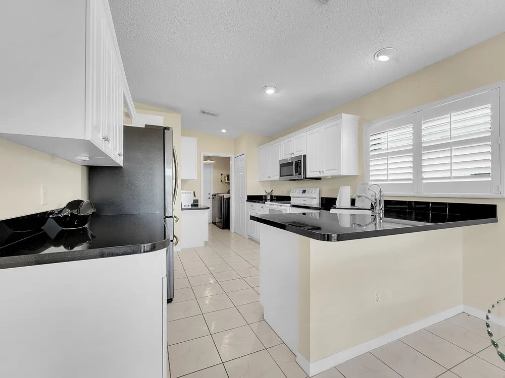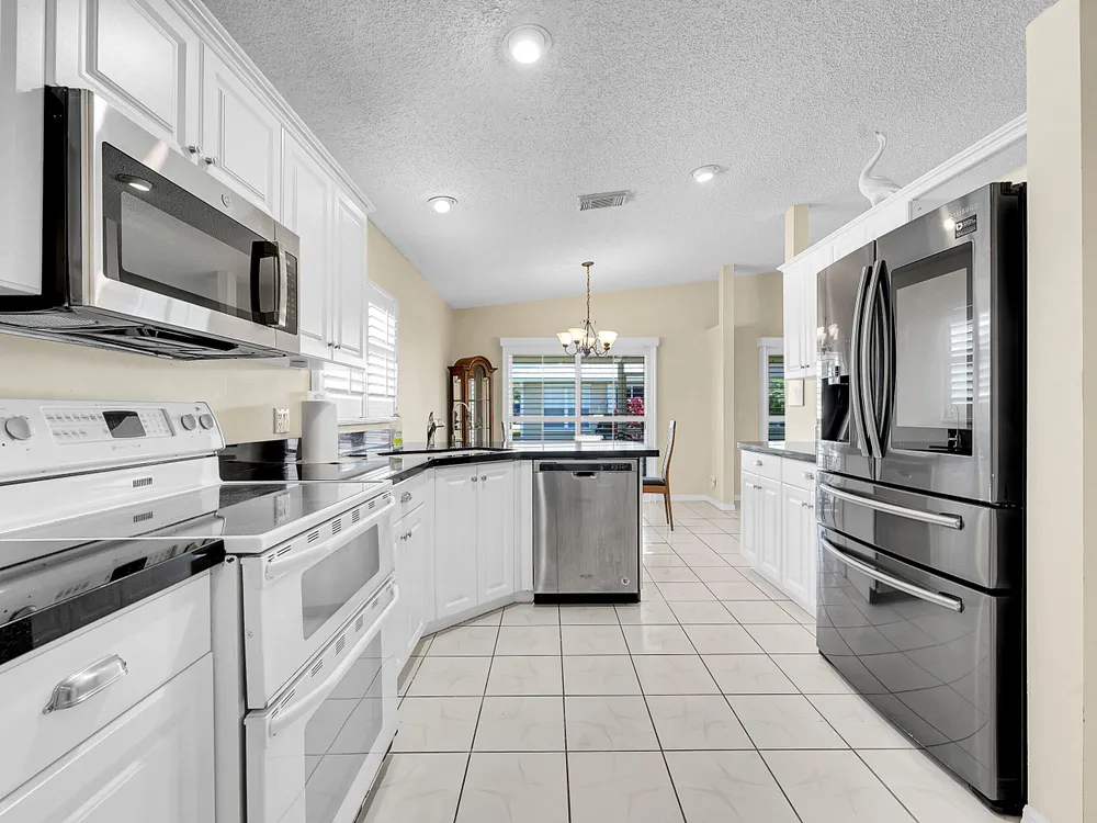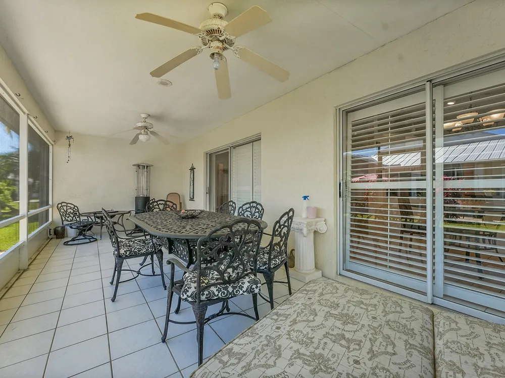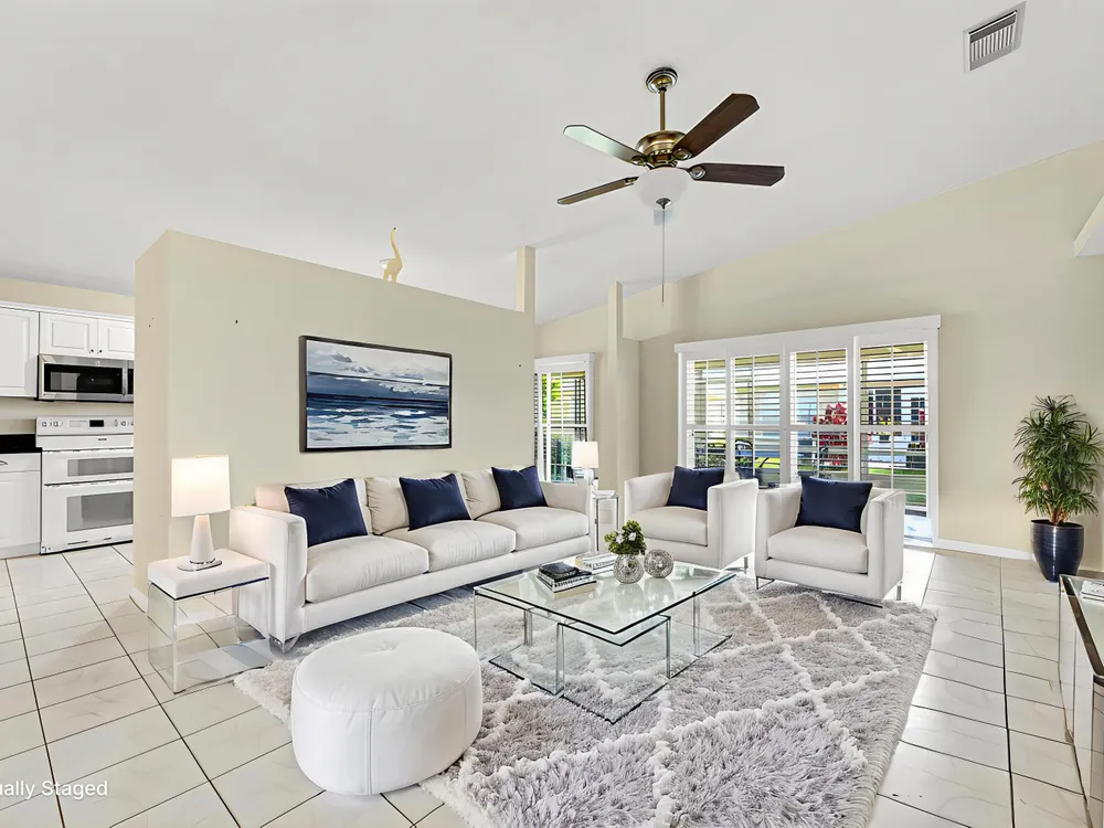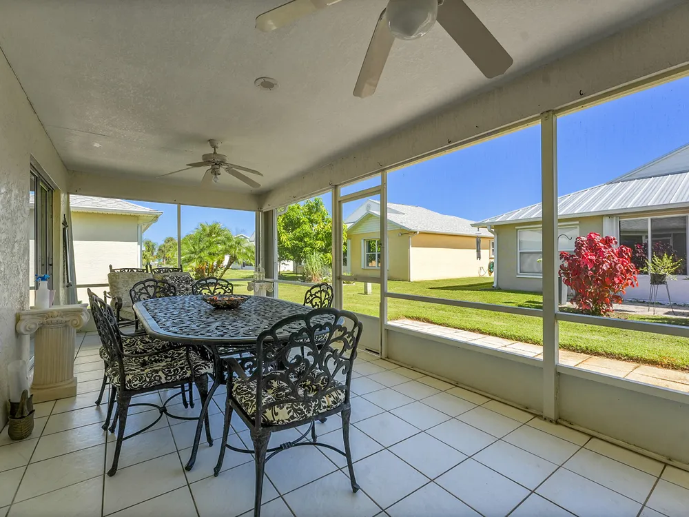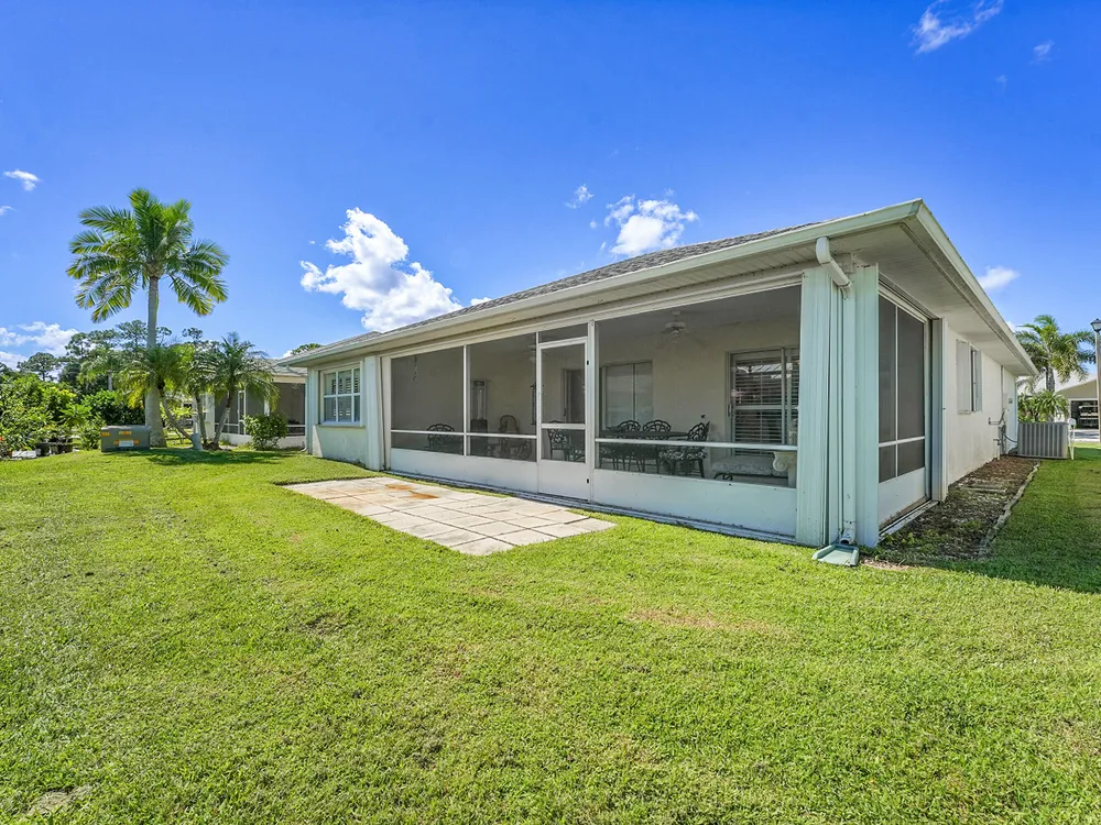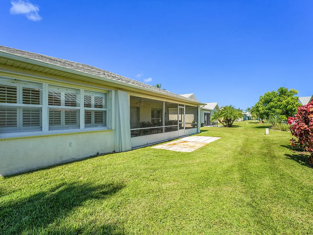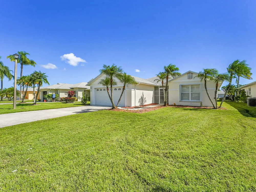 Don't miss this beautifully updated 3BR/2BA CBS home in the sought-after 55+ gated community of Palm Grove. Featuring a bright, open floor plan with tiled floors throughout, this single-level home offers a spacious kitchen with granite countertops, lots of storage & SS smart fridge. The primary suite includes a walk-in closet and ensuite bath. Enjoy outdoor living on the large screened patio. Complete with a 2-car garage and indoor laundry room with sink. Accordion shutters all around including the entire exterior of the screened patio for added peace of mind. Enjoy 24/7 security, pool, tennis, pickleball, bocce, fitness center, clubhouse, social events, and more. Only minutes from shopping, dining, and beaches.