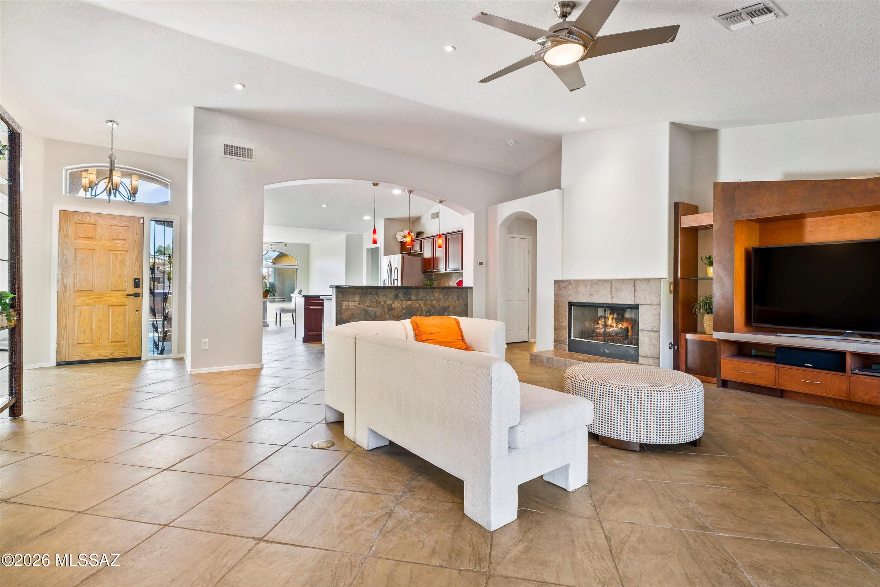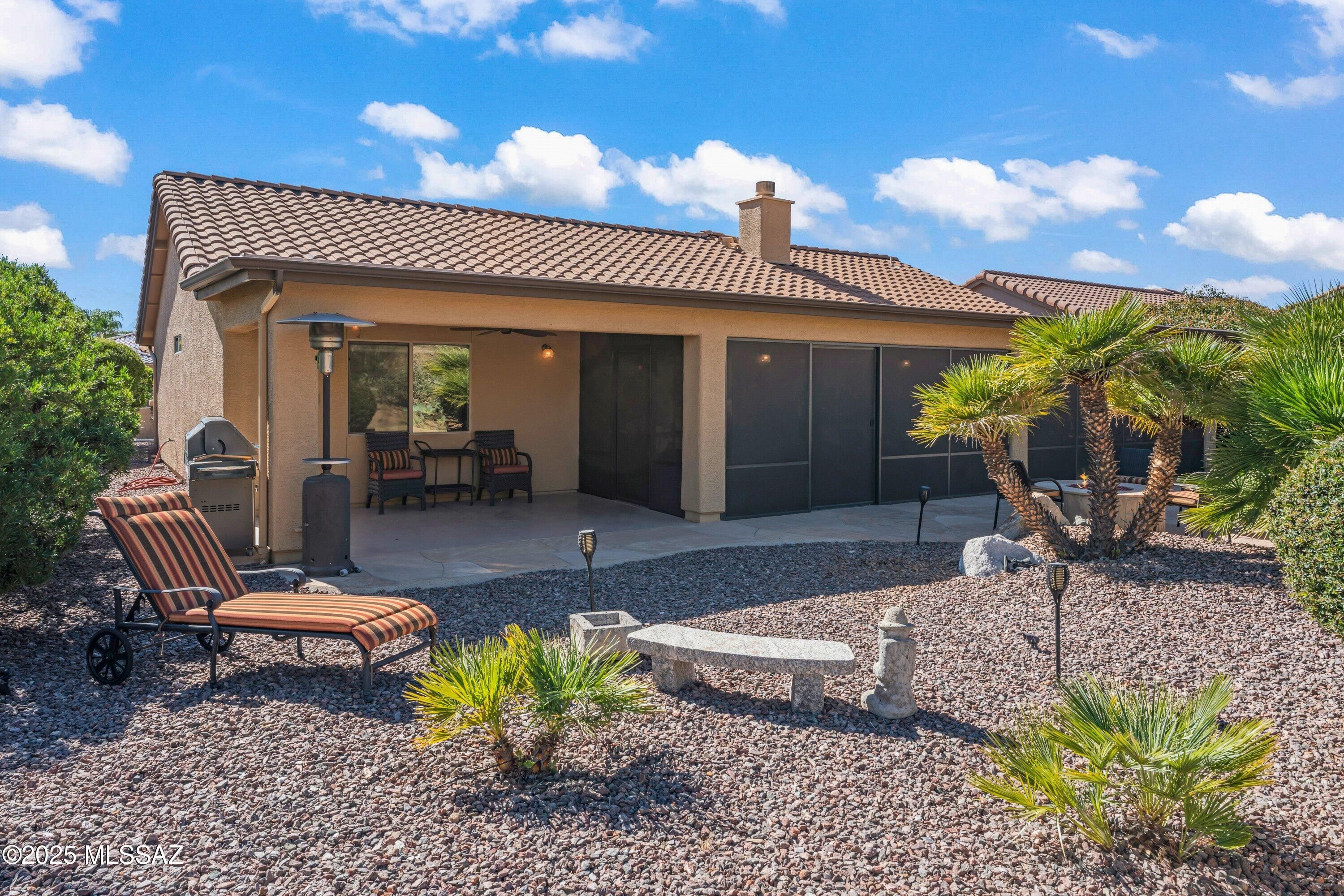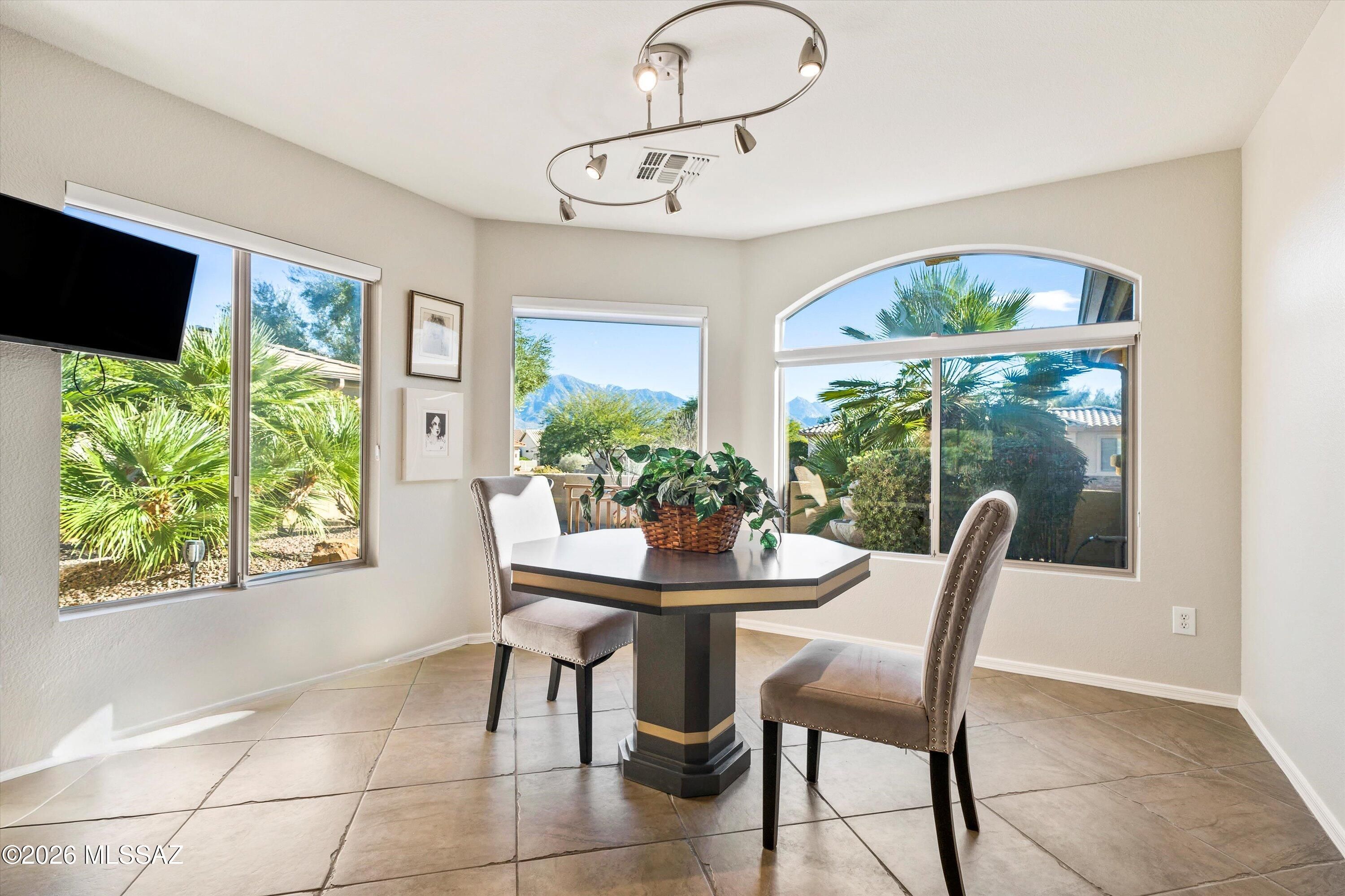Experience the SaddleBrooke lifestyle in this sought-after Laredo model. The split bedroom layout offers two bedrooms, two bathrooms, and a conveniently situated den. The island kitchen features plenty of cabinetry, granite countertops, a pantry, stainless steel appliances, and opens to a dining area with beautiful bay windows overlooking the mountain views. The primary suite boasts an en-suite bathroom with a double vanity and an upgraded shower plus a walk-in closet. Additional highlights include a guest bedroom and bath, a den with a built-in desk, and an inviting Arizona room. Step outside to a private yard with gas firepit designed for expanded entertaining, or enjoying the best of the SaddleBrooke lifestyle rounding out this exceptional home.