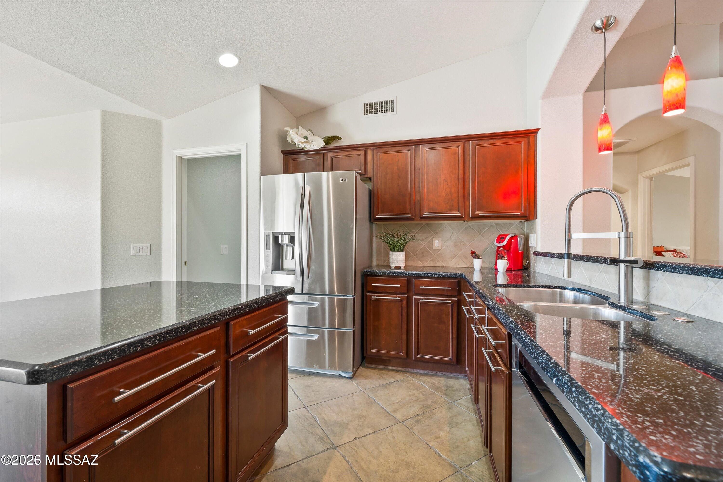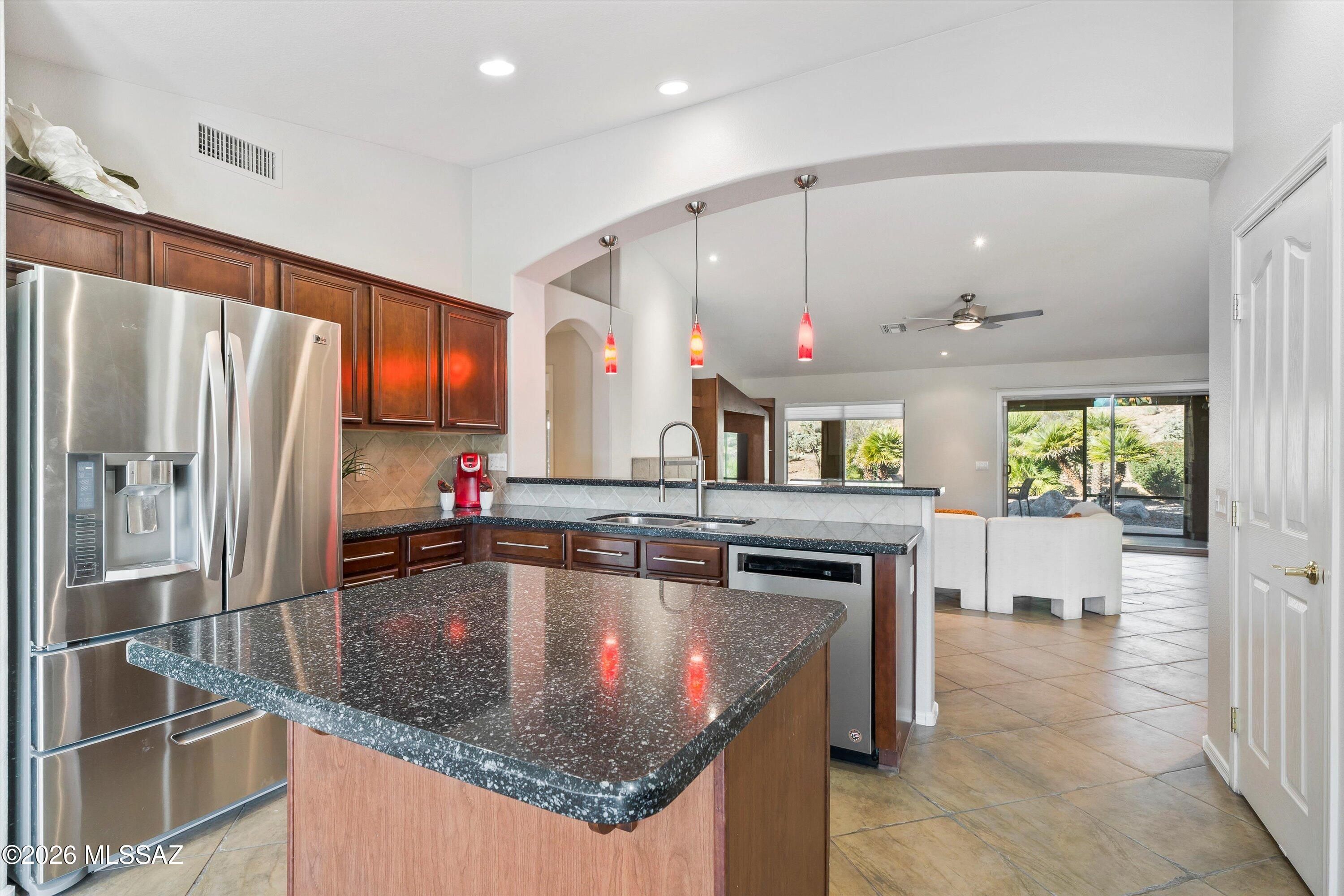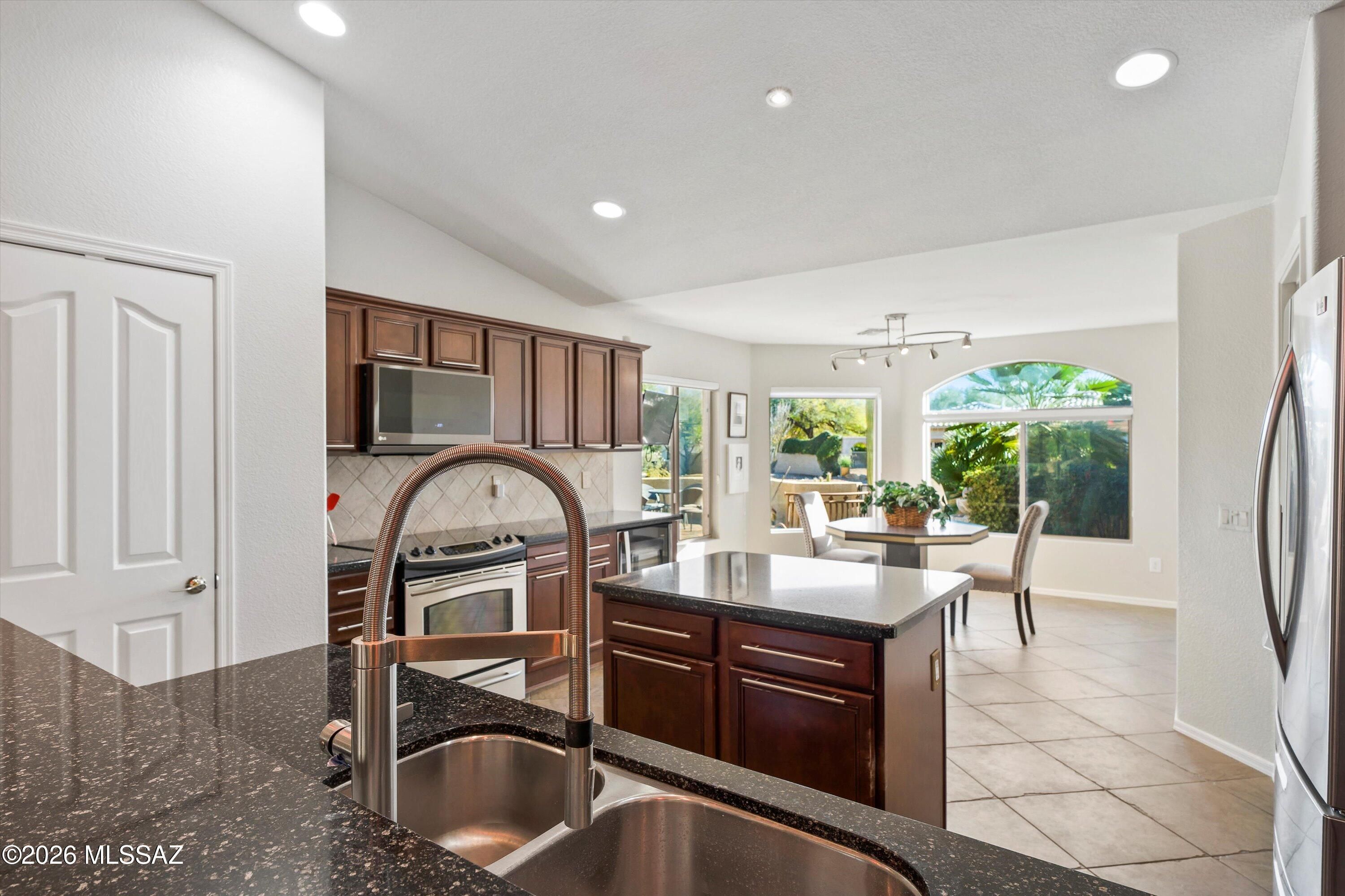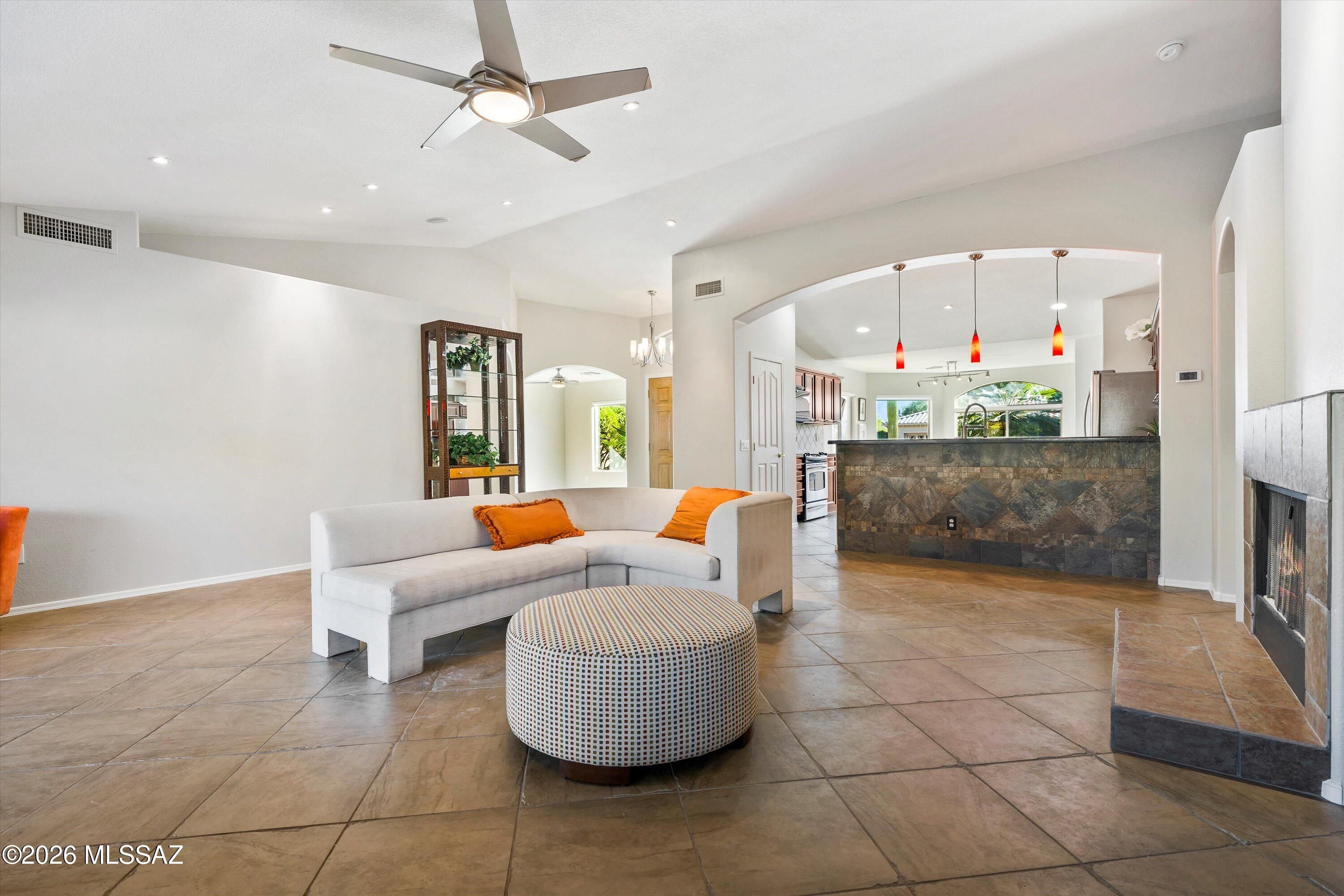 Experience the SaddleBrooke lifestyle in this sought-after Laredo model. The split bedroom layout offers two bedrooms, two bathrooms, and a conveniently situated den. The island kitchen features plenty of cabinetry, granite countertops, a pantry, stainless steel appliances, and opens to a dining area with beautiful bay windows overlooking the mountain views. The primary suite boasts an en-suite bathroom with a double vanity and an upgraded shower plus a walk-in closet. Additional highlights include a guest bedroom and bath, a den with a built-in desk, and an inviting Arizona room. Step outside to a private yard with gas firepit designed for expanded entertaining, or enjoying the best of the SaddleBrooke lifestyle rounding out this exceptional home.