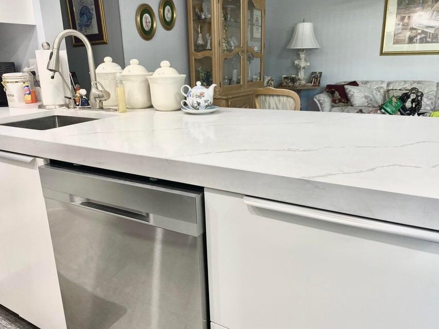 Re-done Beautiful true corner first floor condo. Hurricane impact windows incl. sliding door in 2nd bedroom, Spacious lawn area and canal view from side. Remodeled and new front & back doors.. Encl. porch for that bonus room. washer/dryer closet off porch. Stainless steel appliances, ceiling and lighting redone. quartz counters. Beautiful Porcelin tile. Kings Point is a resort style community with a Bistro andcafe, 3 mult-million dollar clubhouses, 6 tennis courts, pickleball court, Bocce, indoor /outdoor heated pools, billards, theatre with live entertainment, courtesy buses daily to shopping and more...just 6 miles from Historic Delray Beach and the ocean. Welcome home...
