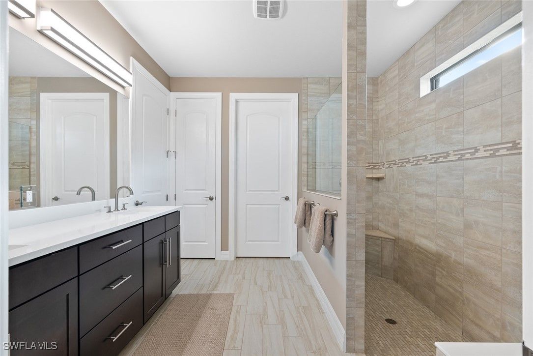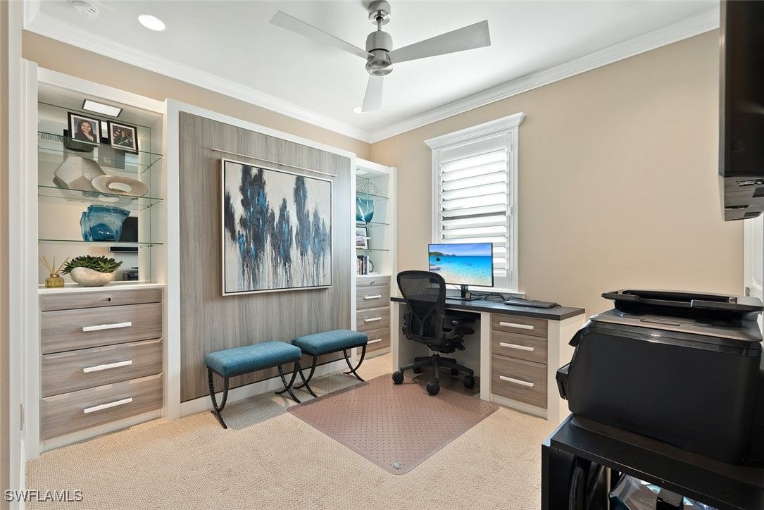 This home HAS IT ALL - GOLF MEMBERSHIP, BREATHTAKING WATER & GOLF COURSE VIEWS, and a LUXURIOUS SALTWATER HEATED POOL - all located within the 55+ Del Webb Naples community. Better than new construction and truly MODEL-HOME PERFECT, this upgraded PINNACLE floor plan (similar to the STELLAR) delivers the LUXURY LIFESTYLE today’s buyers desire. Step inside and immediately notice the exceptional finishes and meticulous care throughout. This 3-bedroom, 3-bath plus den residence features REMODELED KITCHEN AND BATHROOMS, PLANTATION SHUTTERS, electric roller shades, upgraded bedroom carpet, DESIGNER LIGHTING and ceiling fans, and fresh interior and exterior paint for a clean, modern feel. The PRIMARY SUITE is a luxurious retreat with a large walk-in shower, CUSTOM CLOSET, and dual sinks. The KITCHEN is a chef’s dream with quartz countertops, upgraded appliances, a new sink and faucet, a custom pantry, and a beverage center - perfect for effortless entertaining. Additional highlights include ZERO-CORNER SLIDERS, IMPACT GLASS WINDOWS, a new AC system (2020), new refrigerator (2024), new washing machine (2025), floor to ceiling tile in the bathrooms, and upgraded PLANK TILE. Enhanced LANDSCAPING WITH EXTERIOR LIGHTING elevates the home's curb appeal. The outdoor living space is pure Florida luxury - your screened-in saltwater pool with super screens and a PANORAMIC PICTURE-FRAME VIEW creates an unforgettable setting for relaxation or hosting guests. A Storm Smart ELECTRIC HURRICANE SCREEN adds both comfort and confidence. The oversized GARAGE - complete with a 4’ extension, epoxy floors, attic fan, insulated doors, and smart openers - offers impressive storage and functionality. In Del Webb Naples, you’ll enjoy WORLD-CLASS AMENITIES that rival luxury resorts: dine at the Rusty Putter Restaurant, soak in the RESORT-STYLE or LAP POOLS, break a sweat in the state-of-the-art FITNESS CENTER, and play your way through PICKLEBALL, TENNIS, bocce, billiards - even a top-tier GOLF SIMULATOR! Need groceries, church, or a bite to eat? Just hop in your golf cart and cruise into town - Publix and the heart of Ave Maria are just minutes away. This isn’t just a home - it’s a LIFESTYLE UPGRADE in one of Southwest Florida’s most vibrant 55+ communities. Don’t miss your chance to live where fun, fitness, and friendships flourish year-round!