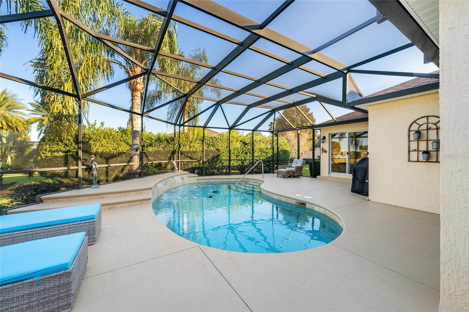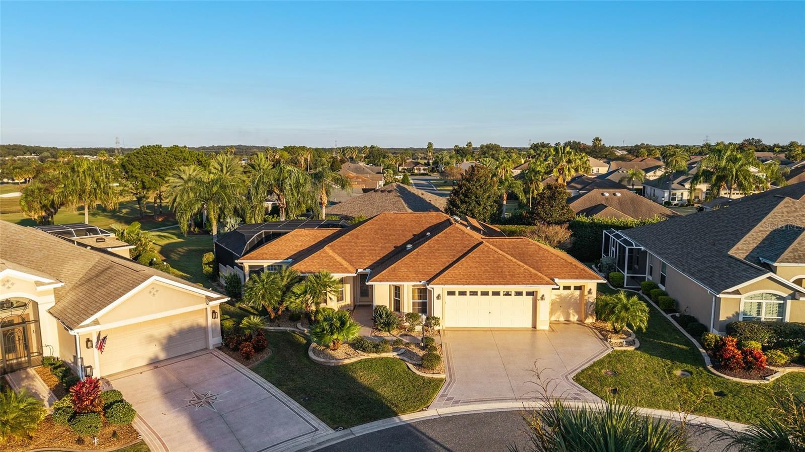LOCATION, LOCATION! This EXPANDED BLOCK & STUCCO Jasmine Designer is located in the highly desirable Village of Hadley, offers over 2,000 sq ft of beautifully upgraded living space with a combination of golf & water views, and situated on a quiet cul-de-sac location. A NEW 2025 architectural shingle roof and an enhanced leaded glass front door will elevate the home's curb appeal and long-term value. Enjoy premier Florida living with a T&D saltwater, solar-heated POOL with a NEW (2025) pool pump. The outdoor bar features a GRANITE bar with a seating area, a refrigerator, and an enlarged screened lanai, perfect for relaxing or entertaining. Step inside to the OPEN floor plan, upgrades throughout, including crown molding, tubular skylights, tile flooring in main living areas, and engineered wood flooring in the bedrooms and hallways. The primary suite features a dedicated office/den addition and an enlarged custom WALK-IN closet. The primary bath includes a TILED walk-in shower, while the guest bath showcases a walk-in jetted tub. The kitchen is beautifully updated with new Quartz countertops & backsplash, upgraded stainless steel appliances, a microwave space-saver, and an EAT-IN area. Additional improvements include a new HVAC (2024), HWH (2025), custom blinds, ceiling fans, and a dedicated INSIDE laundry room. Other features include: Gutters, mature landscaping, an irrigation system, and a newly finished walkway & driveway. The spacious 2-car garage PLUS golf cart garage consists of an ELECTRIC screen and attic stairs. BOND $10,599. Ideally located, situated between Sumter Landing and Brownwood, and minutes by golf cart to Colony Plaza, which has many restaurants and shopping! Golf cart and furniture available separately. MUST SEE!