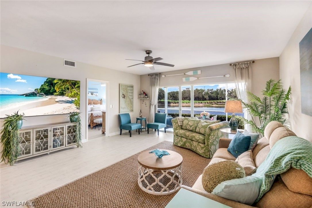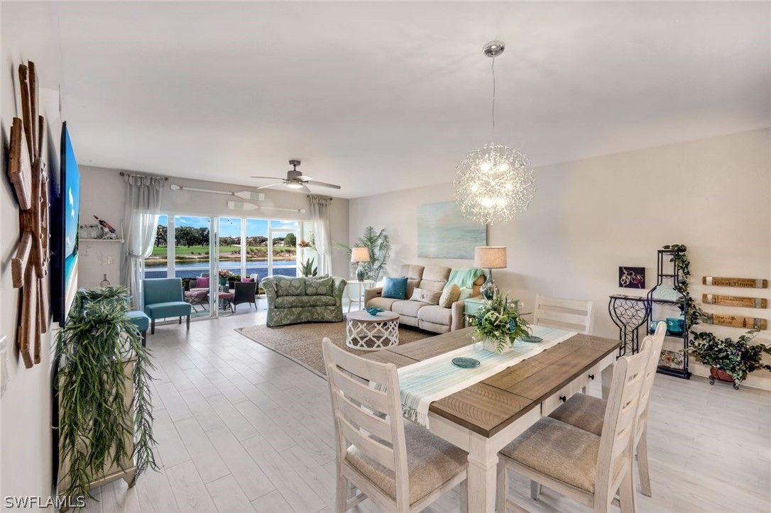 The Wow Factor View! Breathtaking water and golf course views. Sought after 1st Floor location.Enjoy spectacular morning sunrises! Exquisitely and totally renovated residence with high-end finishes,quality and attention to detail! Porcelain tiled lightwood look plank flooring throughout including generous sized lanai. Reimagined floorplan and open cook's kitchen w/gorgeous cabinetry,quartz countertops/backsplash, stainless steel appliances.Slide-in range with built-in air-fryer Custom desk w/matching quartz top. All brand new mouldings,doors and hardware. Both bathrooms totally renovated and have spa-like showers with primary bath having a walk-in shower. Custom designed lighting and fans. Lanai with electric shutters too! Large storage unit,designated covered carport and abundant guest parking for friends and family!Just steps to renovated community pool. Vineyards Country Club offers optional memberships for golf,social, tennis and their Wellness Center. Onsite Crossroads Shopping Center and Physicians Regional Medical Center.Miles of beautfully landscaped walking paths and two gated entrances. No CDD! A true gem of a property.