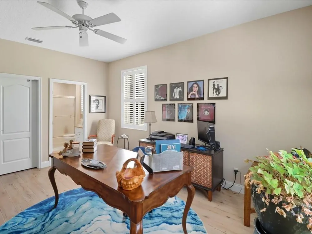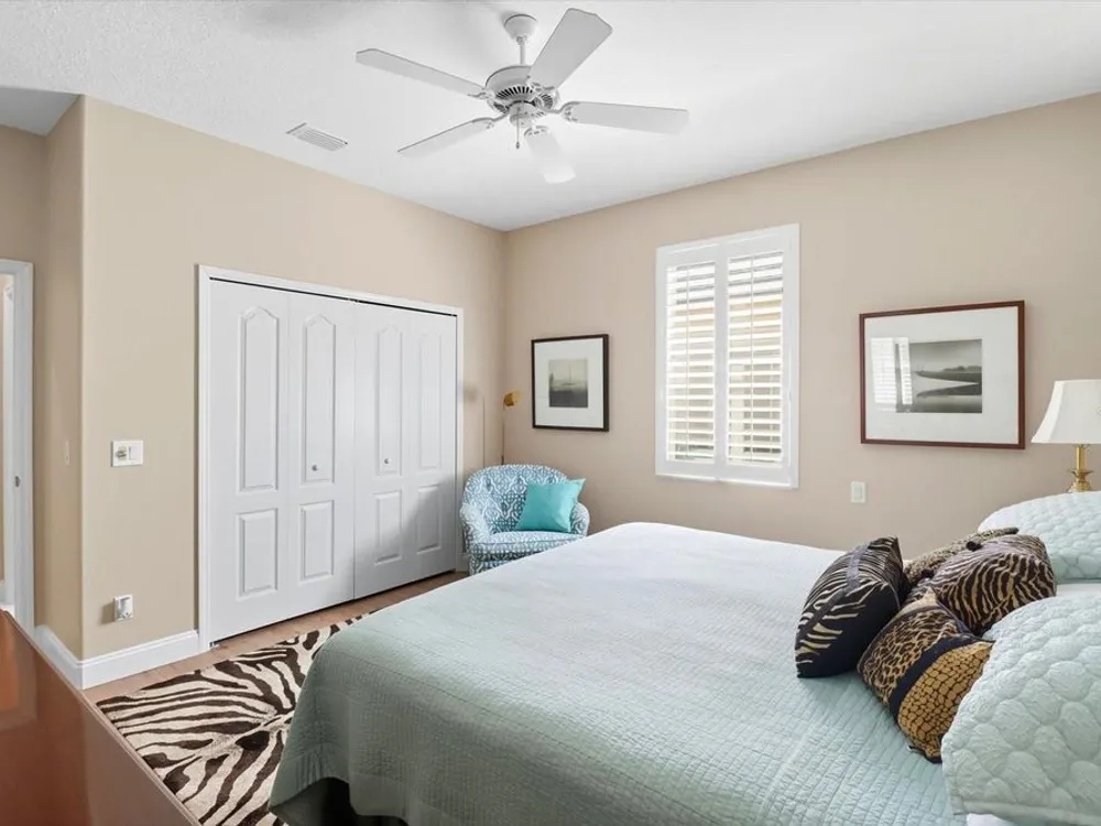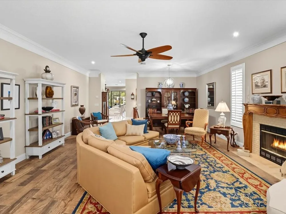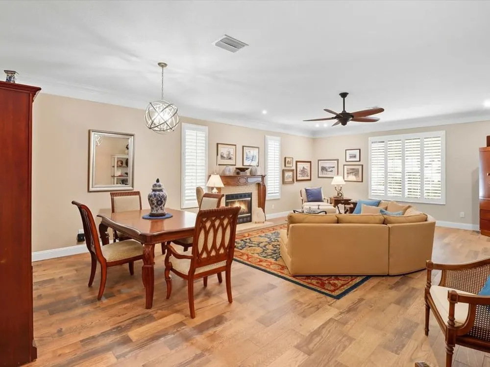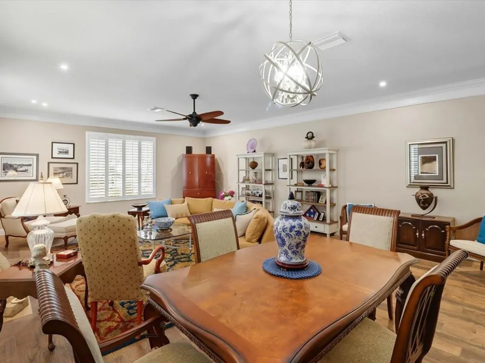 - Ceiling Fan(s), Crown Molding, Eat-in Kitchen, High Ceilings, Kitchen/Family Room Combo, Living/Dining Room, Main Level Primary, Solid-Wood Cabinets, Split Bedrooms, Stone Counters, Walk-In Closet(s)