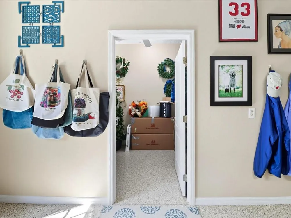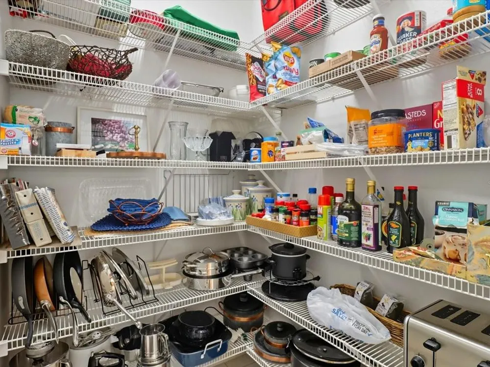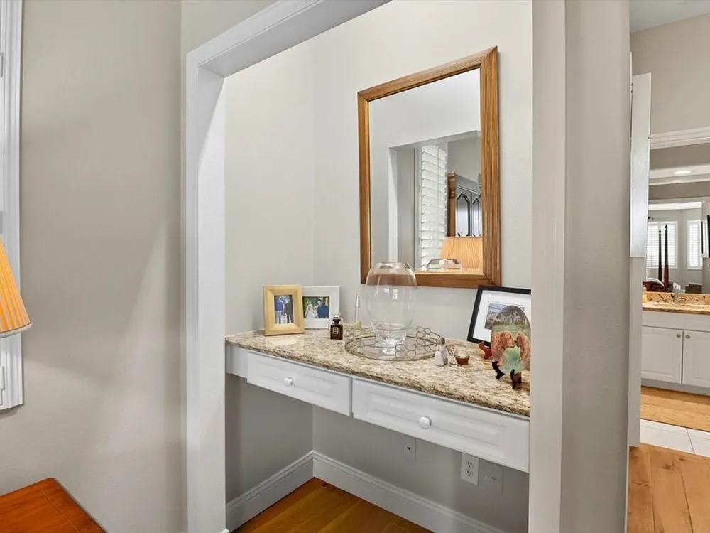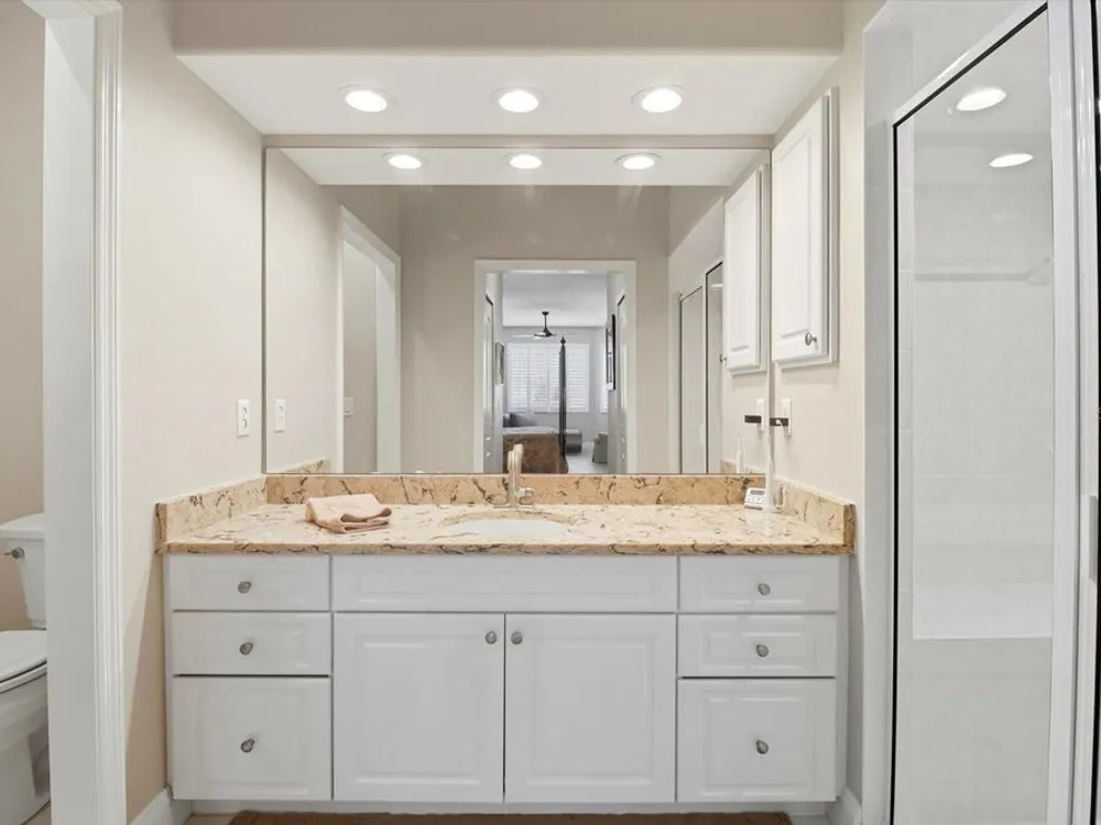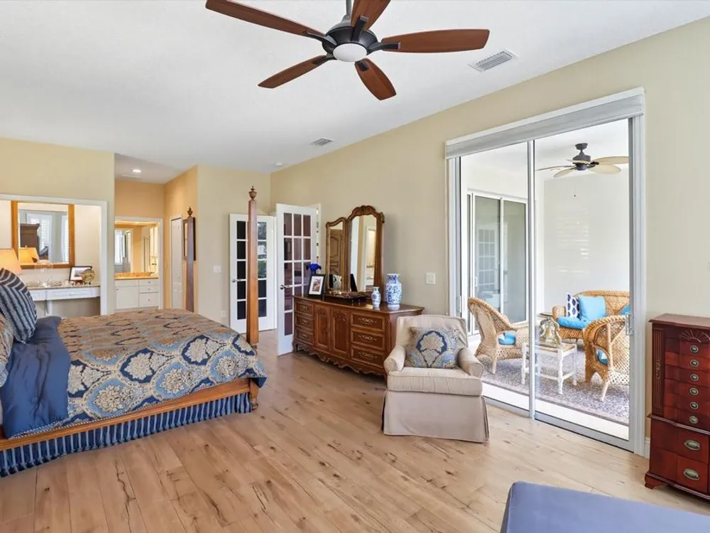 - Ceiling Fan(s), Crown Molding, Eat-in Kitchen, High Ceilings, Kitchen/Family Room Combo, Living/Dining Room, Main Level Primary, Solid-Wood Cabinets, Split Bedrooms, Stone Counters, Walk-In Closet(s)