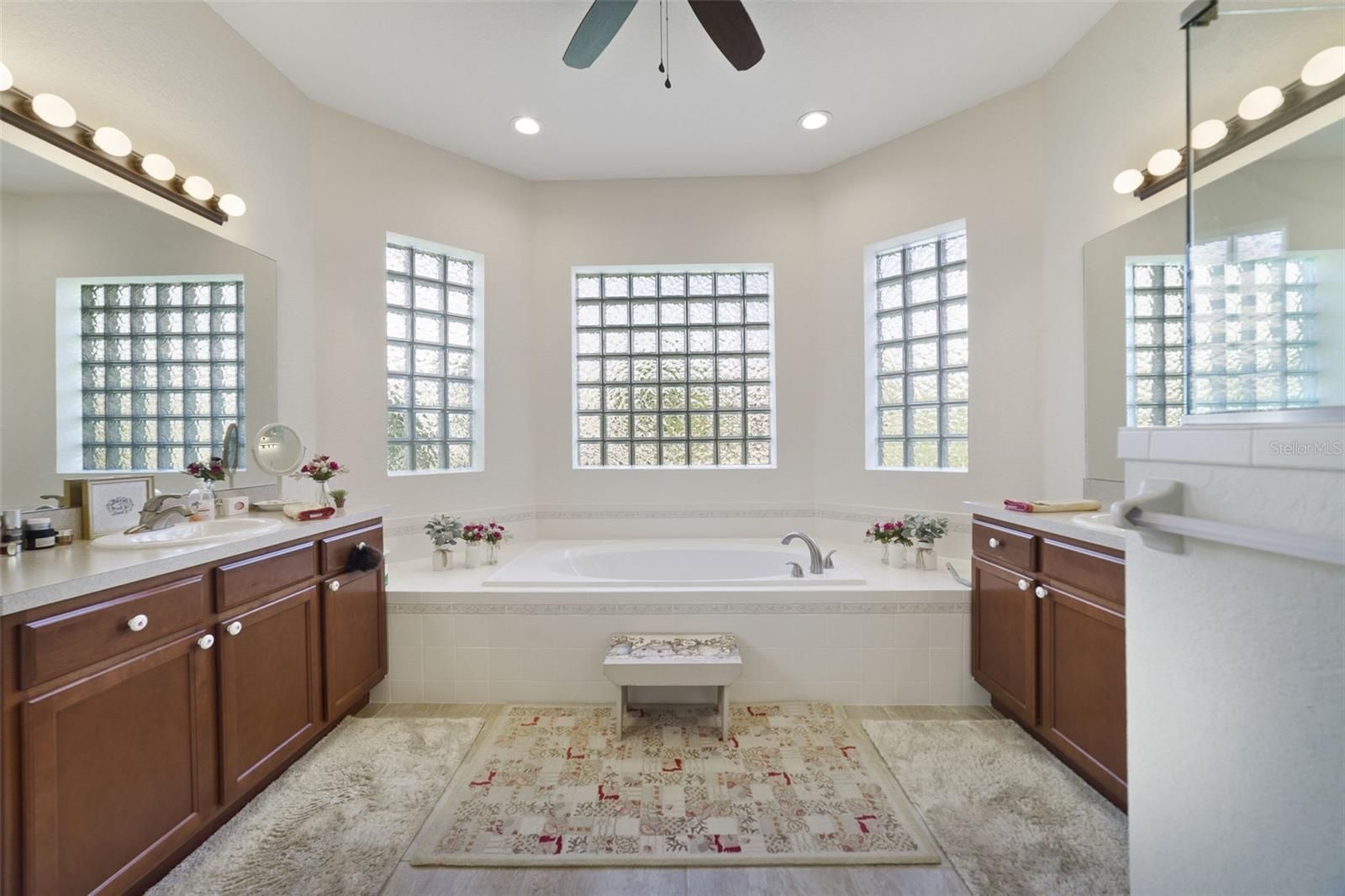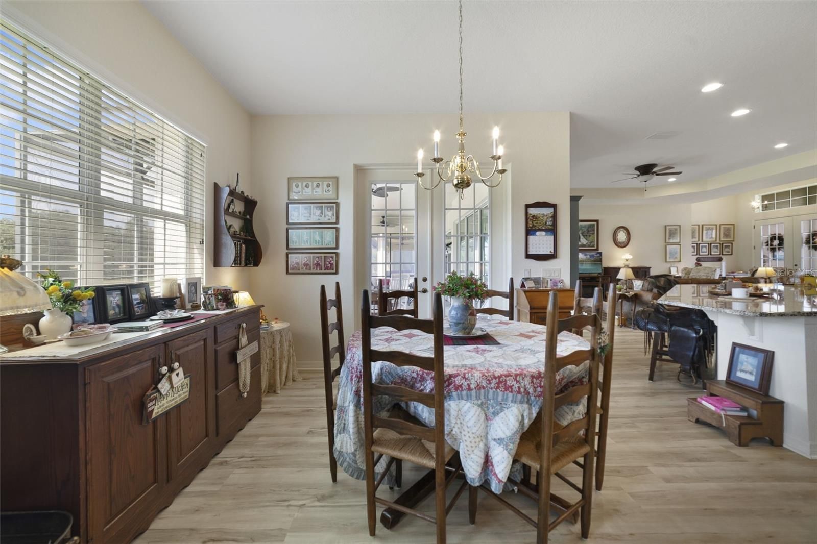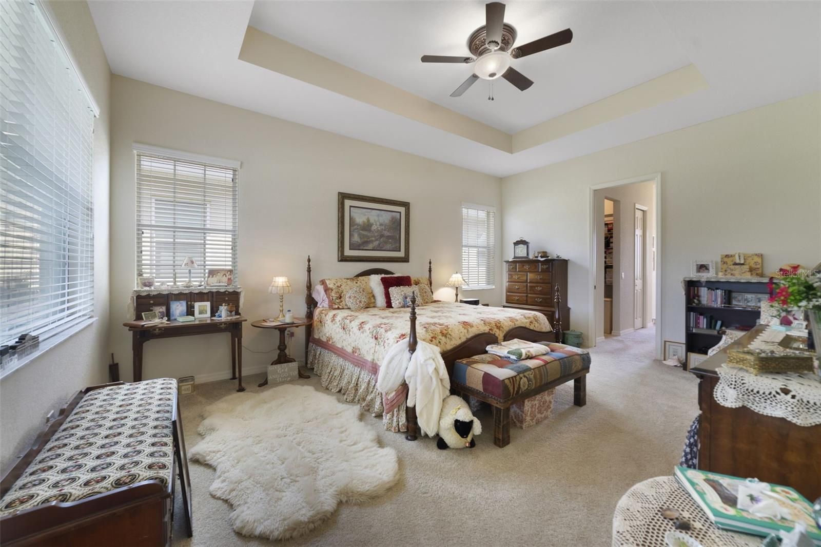 - Attic Ventilator, Ceiling Fan(s), Eat-in Kitchen, High Ceilings, Living/Dining Room, Open Floorplan, Main Level Primary, Solid-Wood Cabinets, Split Bedrooms, Stone Counters, Thermostat, Tray Ceiling(s), Vaulted Ceiling(s), Walk-In Closet(s), Window Treatments