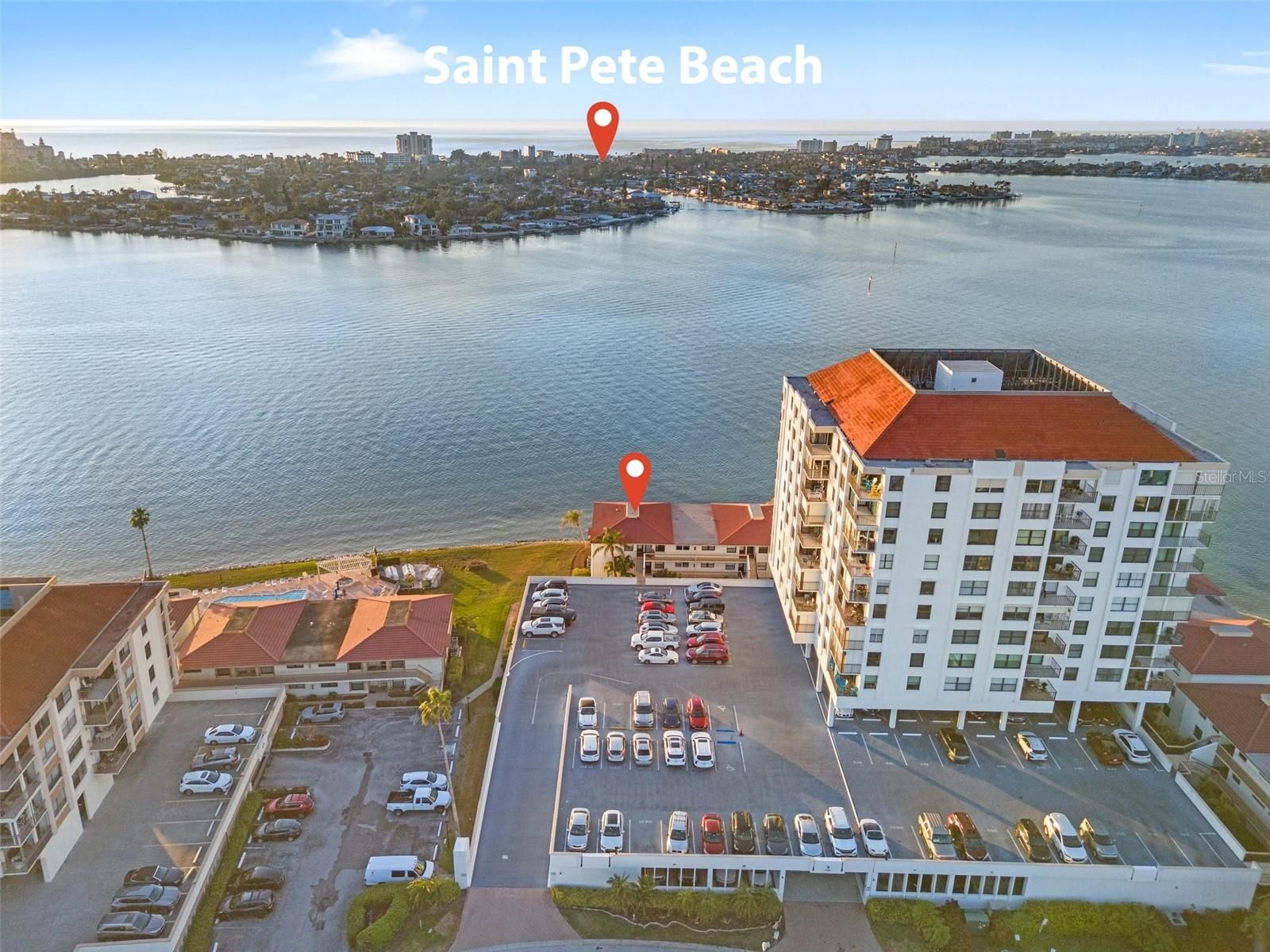 Nestled on the serene waterfront, this beautifully remodeled first-floor condo offers the perfect blend of modern elegance and coastal charm. Fully renovated in 2022, every detail has been thoughtfully upgraded, from the sleek new tile flooring throughout to the smooth, modern ceilings that replaced outdated popcorn textures. The kitchen has been completely transformed with raised ceilings, an open entryway, and all-new GE appliances, countertops, cabinets, sink, and fixtures. A newly installed pocket door creates a private guest bedroom with an en suite bath, while both full bathrooms feature brand-new vanities, fixtures, glass showers, and stylish tilework. Designed for comfort and security, the condo boasts hurricane-impact rear windows and sliders, plus electric hurricane shutters on every door and window—proven protection with no damage or water intake from the 2024 storms. This home features a keyless entry system and custom blackout and solar shades for the oversized sliding doors and windows which adds both privacy and energy efficiency. The end-unit location offers additional windows, enhanced privacy, and a peaceful atmosphere, with no stairs to navigate. Step outside to your private waterfront patio and enjoy breathtaking, ever-changing views—sip wine as the sun sets over the Don Cesar and the nearby beaches. The complex is quiet yet social, with friendly neighbors and amenities just steps away, including a heated and cooled pool, hot tub, and easy access to beaches, parks, dining, and services. With lower-than-average HOA fees and a truly unbeatable location, this condo is the perfect blend of luxury, convenience, and coastal living. HOA fees include exterior building maintenance, water, trash, sewer, cable, internet, building insurance and pool/ground maintenance. **Milestone and reserve study completed and passed. Assessments paid in full. No flooding or hurricane damage from 2024 storms**