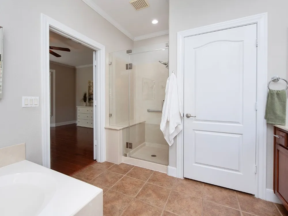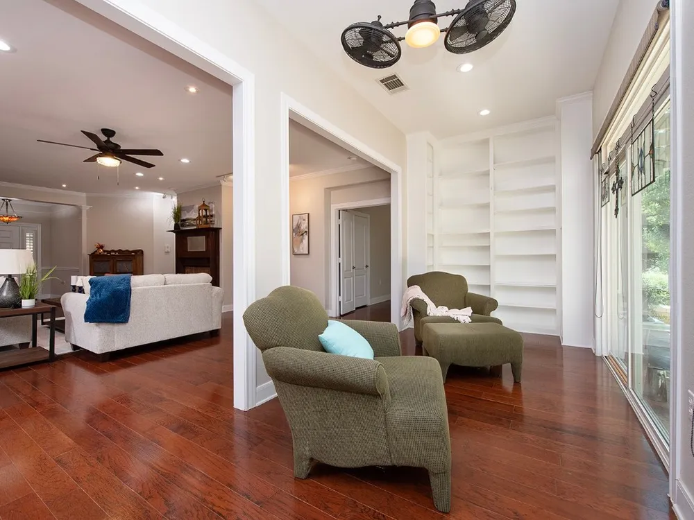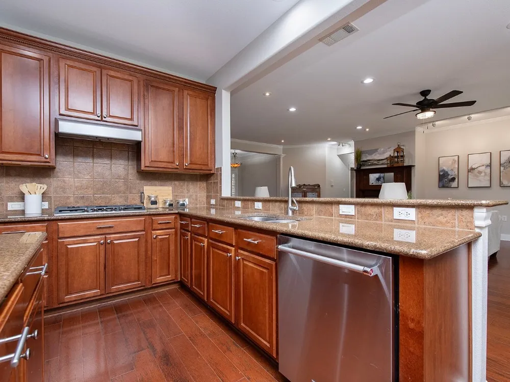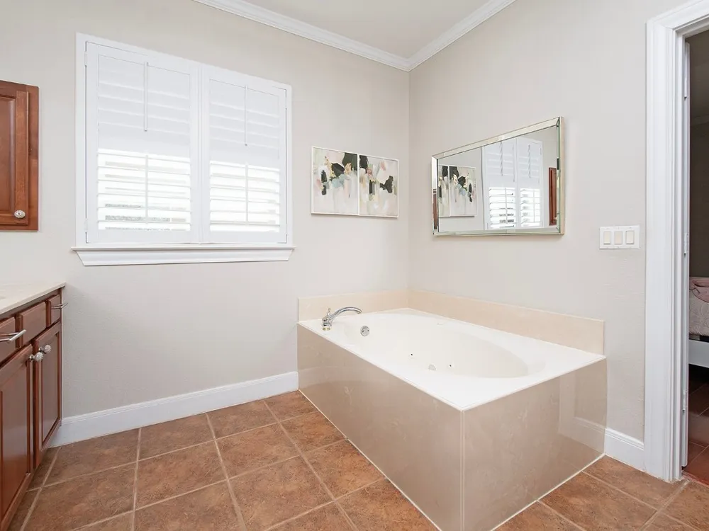 - Built-in Features, Ceiling Fan(s), Granite Counters, High Ceilings, Kitchen Island, Main Level Primary, Open Floorplan, Recessed Lighting, Soaking Tub