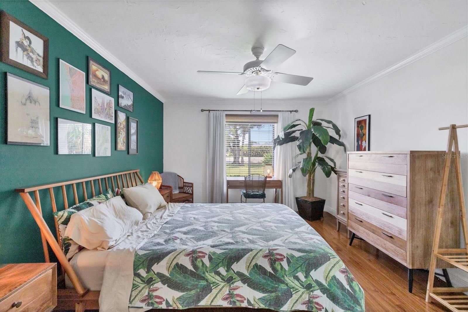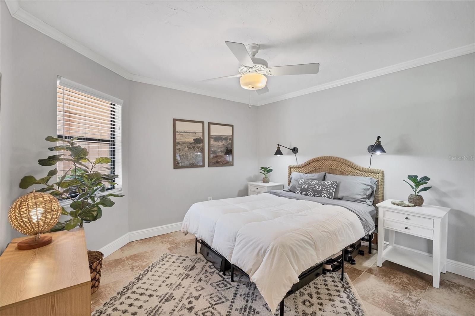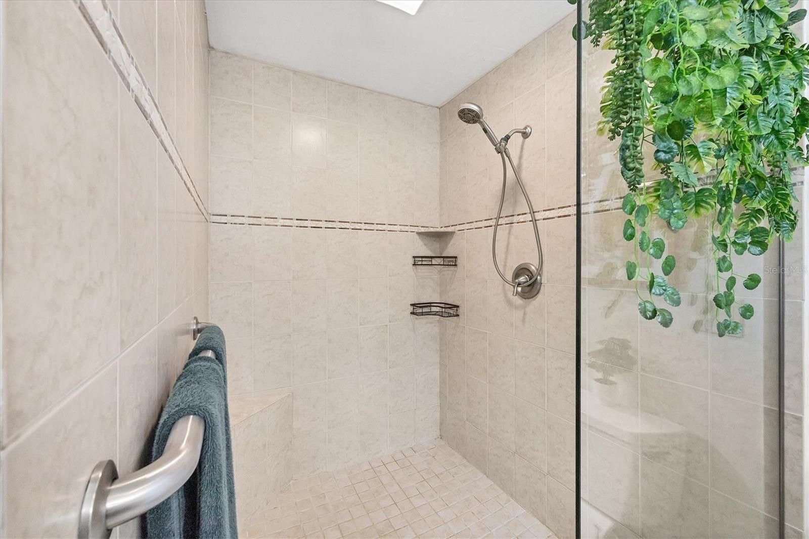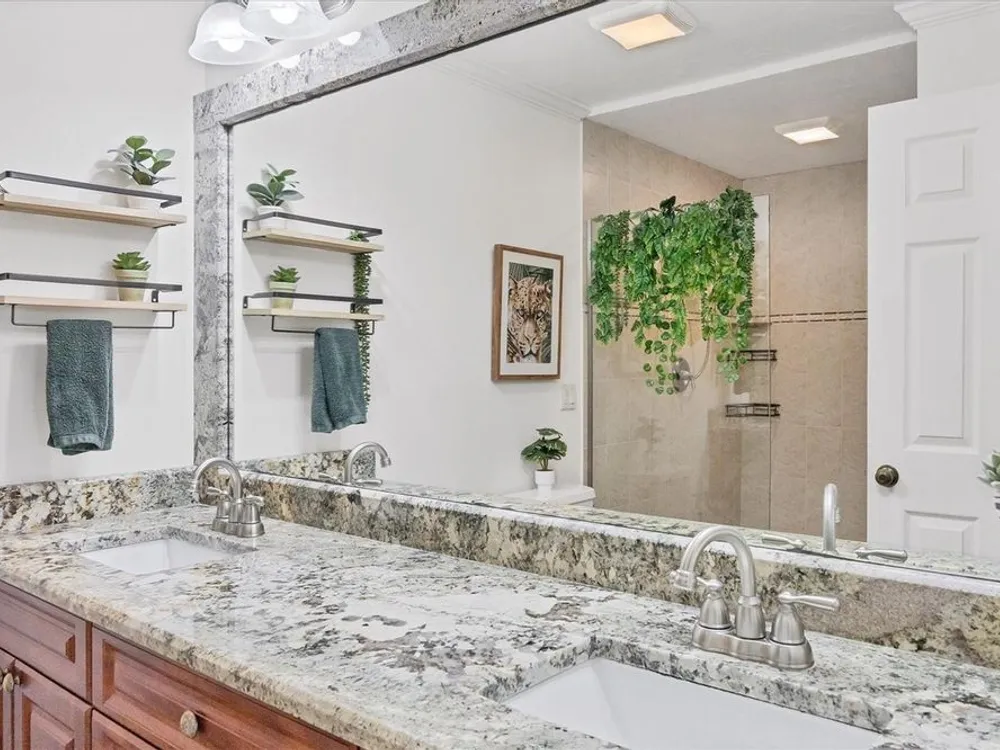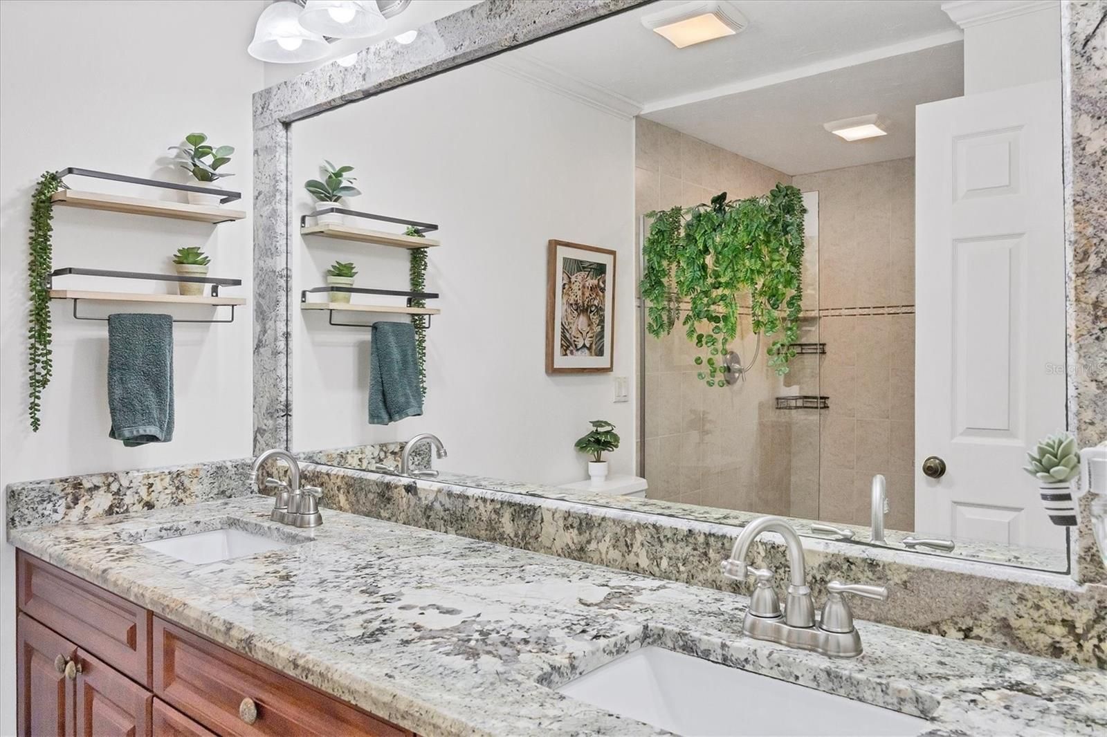 - Built-in Features, Ceiling Fan(s), Eat-in Kitchen, High Ceilings, Living/Dining Room, Main Level Primary, Solid Surface Counters, Split Bedrooms, Stone Counters, Thermostat, Vaulted Ceiling(s), Walk-In Closet(s), Window Treatments