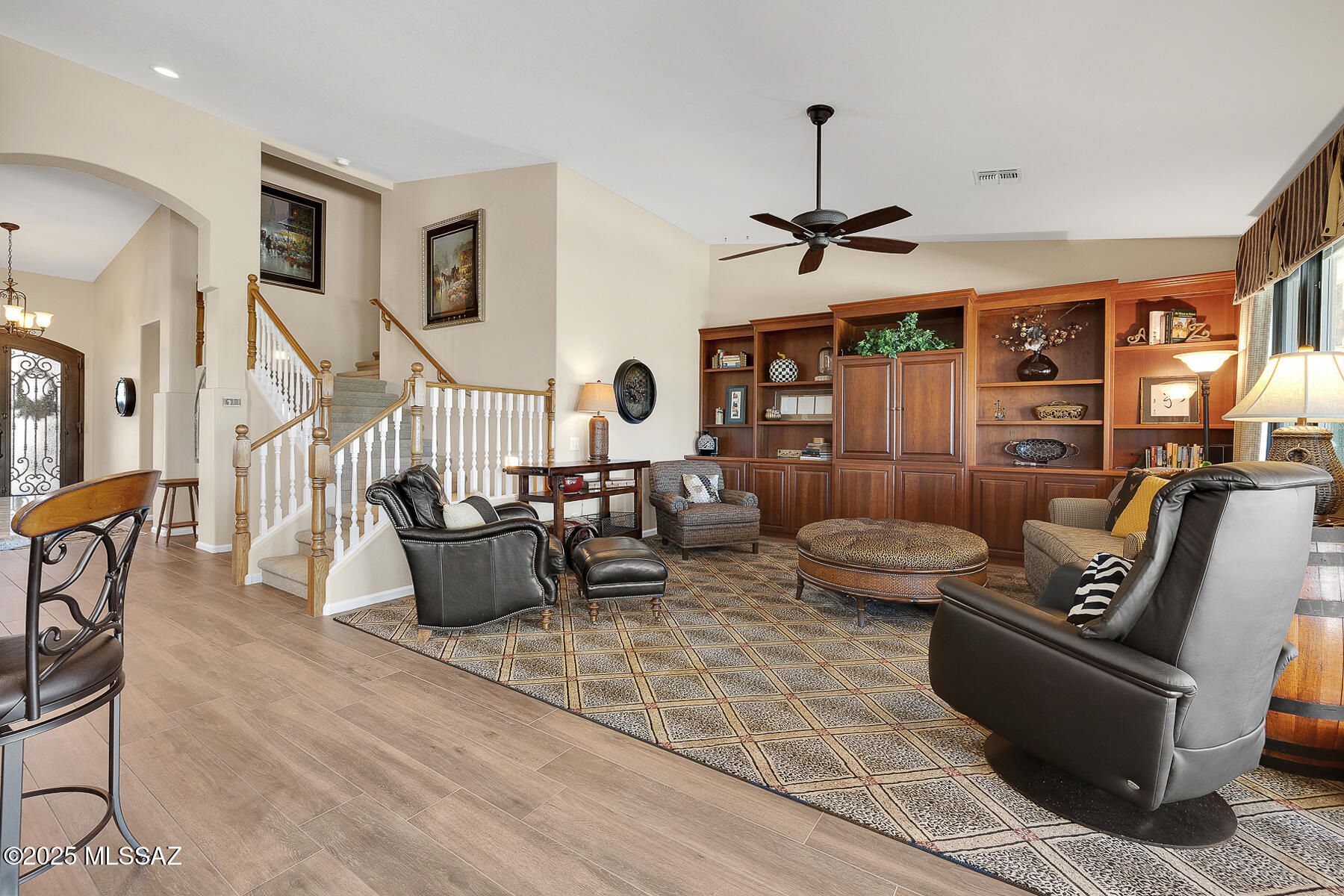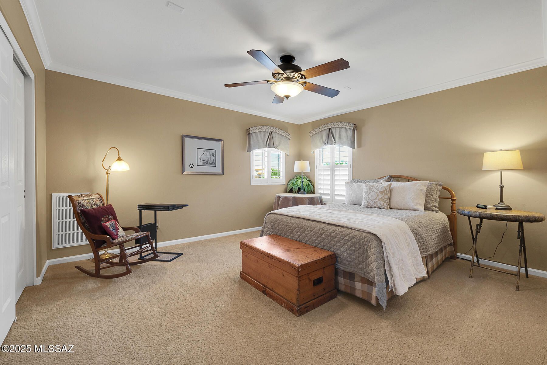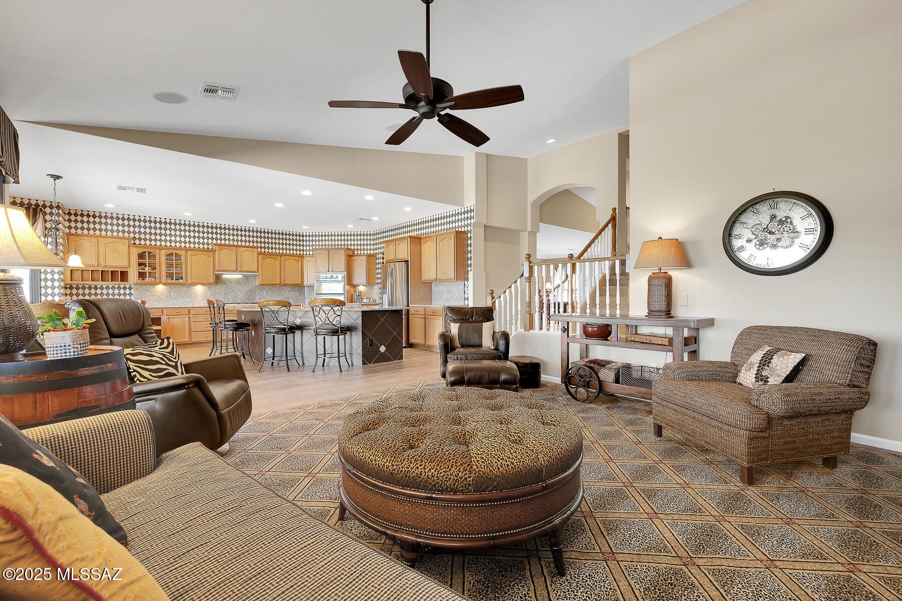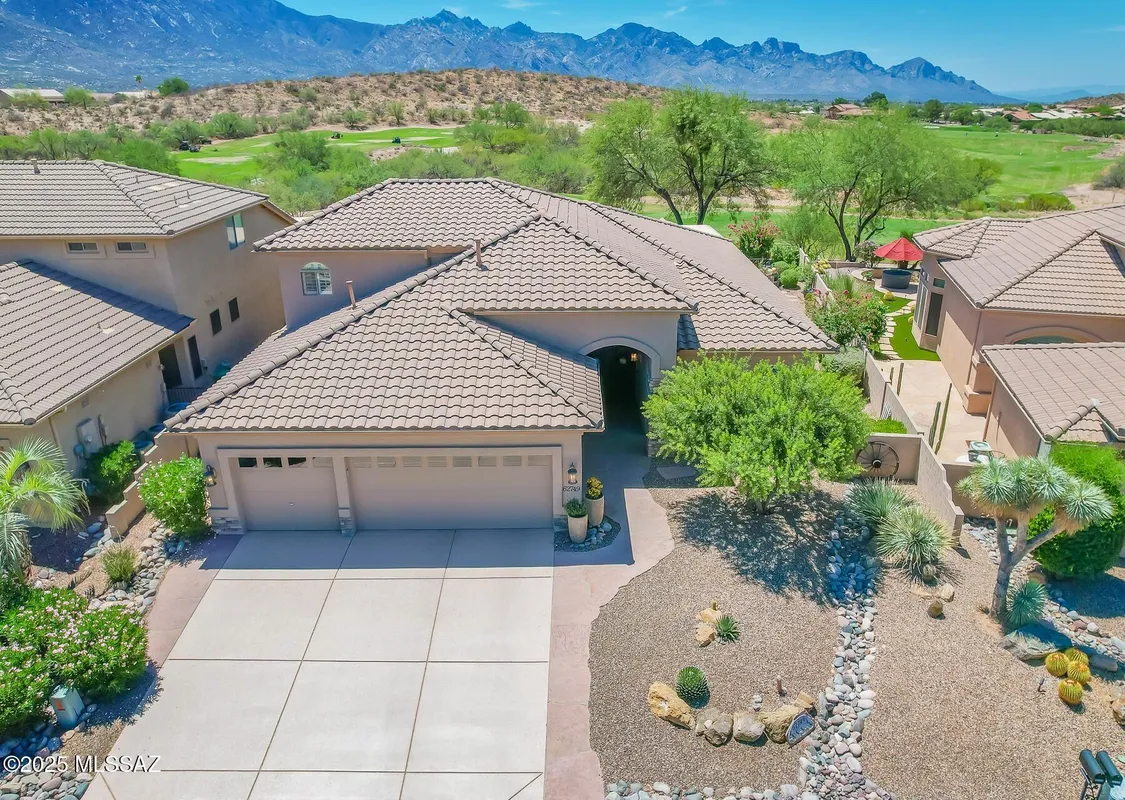 SPECTACULAR DESERT LIVING at this stunning, well cared for and highly updated Durango plan in SaddleBrooke's 55+ Active Adult Community. Boasting panoramic golf course and mountain views, you'll enjoy 3,157 sq ft of formal & informal living space. Elegant Owner's suite, office/2nd bedroom and full hall bath on main level plus two additional guest rooms and full bath on upper level. Plantation shutters and granite countertops throughout plus woodgrain ceramic plank tile with plush carpet interspersed. Entertain in the formal living space off foyer or relax in the open concept gathering room at rear of home highlighted by wall-to-wall entertainment center, ceiling speakers, 8' wide patio slider and Pella view windows with built-in blinds. Gourmet kitchen hosts large, curved island with bar