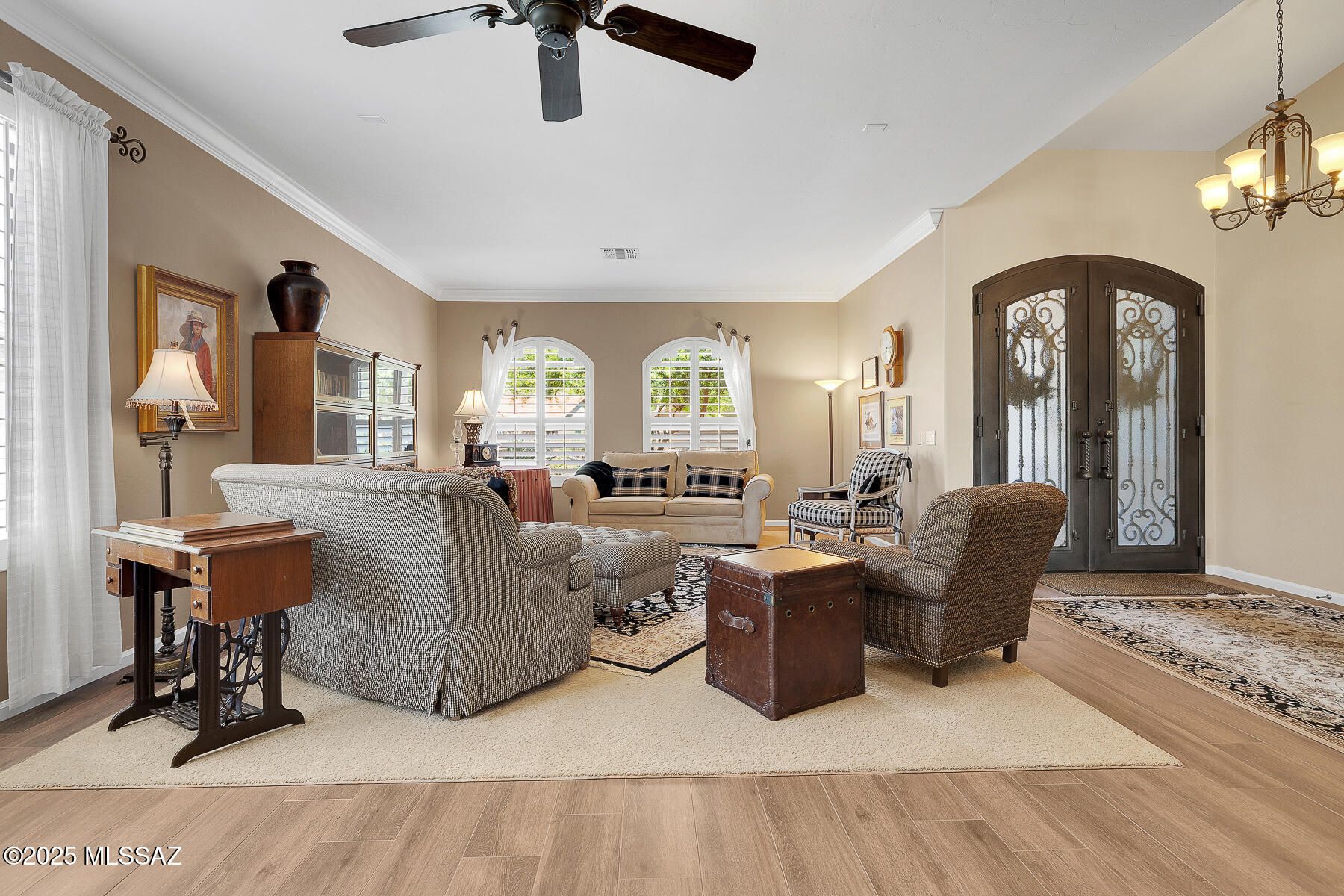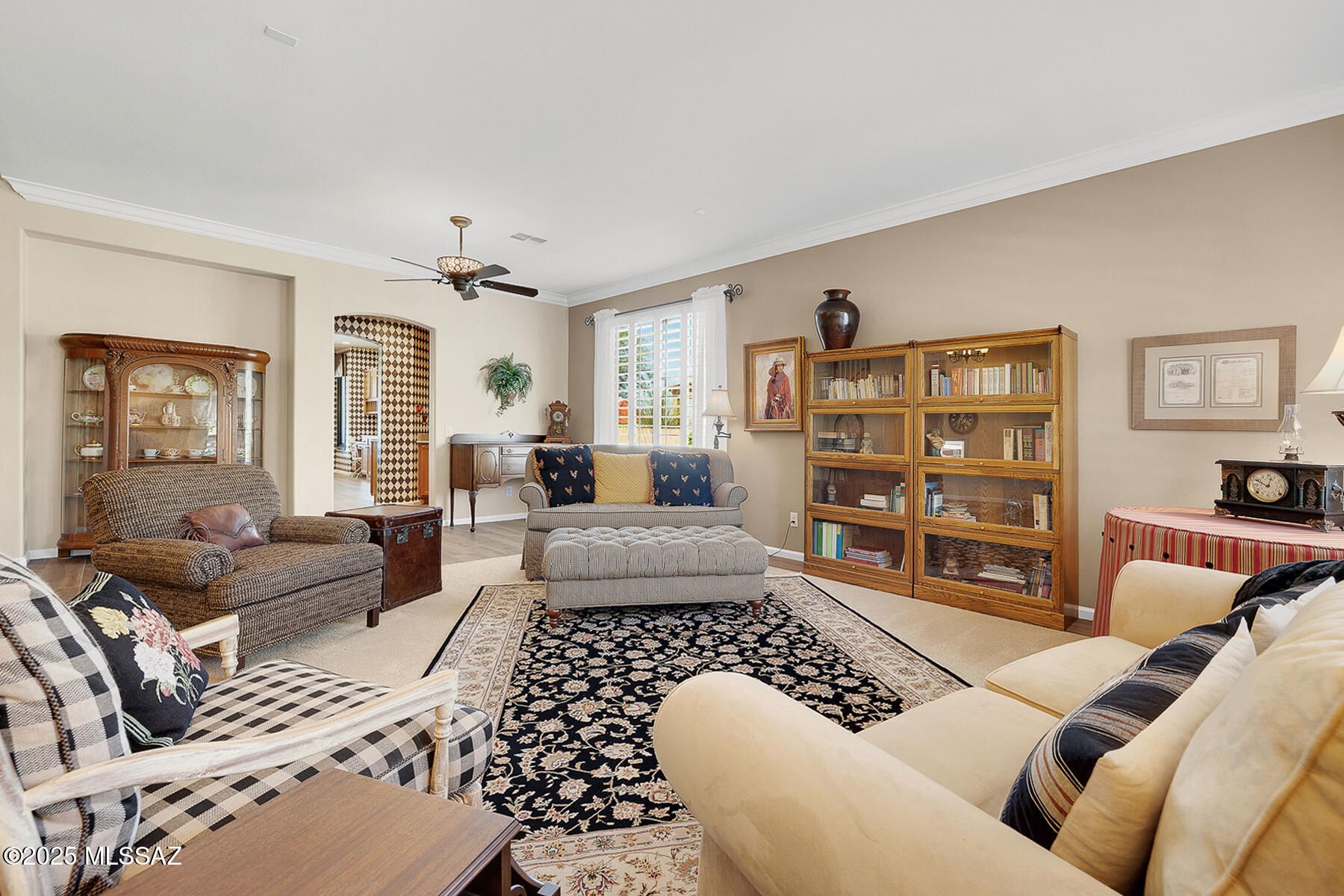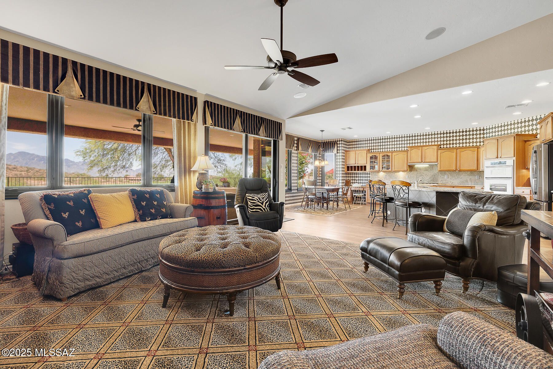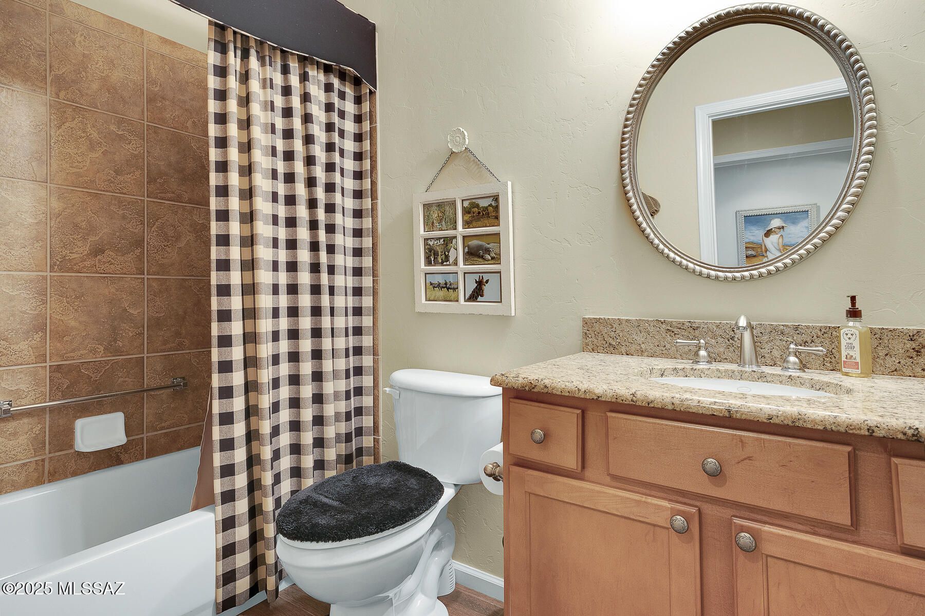 SPECTACULAR DESERT LIVING at this stunning, well cared for and highly updated Durango plan in SaddleBrooke's 55+ Active Adult Community. Boasting panoramic golf course and mountain views, you'll enjoy 3,157 sq ft of formal & informal living space. Elegant Owner's suite, office/2nd bedroom and full hall bath on main level plus two additional guest rooms and full bath on upper level. Plantation shutters and granite countertops throughout plus woodgrain ceramic plank tile with plush carpet interspersed. Entertain in the formal living space off foyer or relax in the open concept gathering room at rear of home highlighted by wall-to-wall entertainment center, ceiling speakers, 8' wide patio slider and Pella view windows with built-in blinds. Gourmet kitchen hosts large, curved island with bar