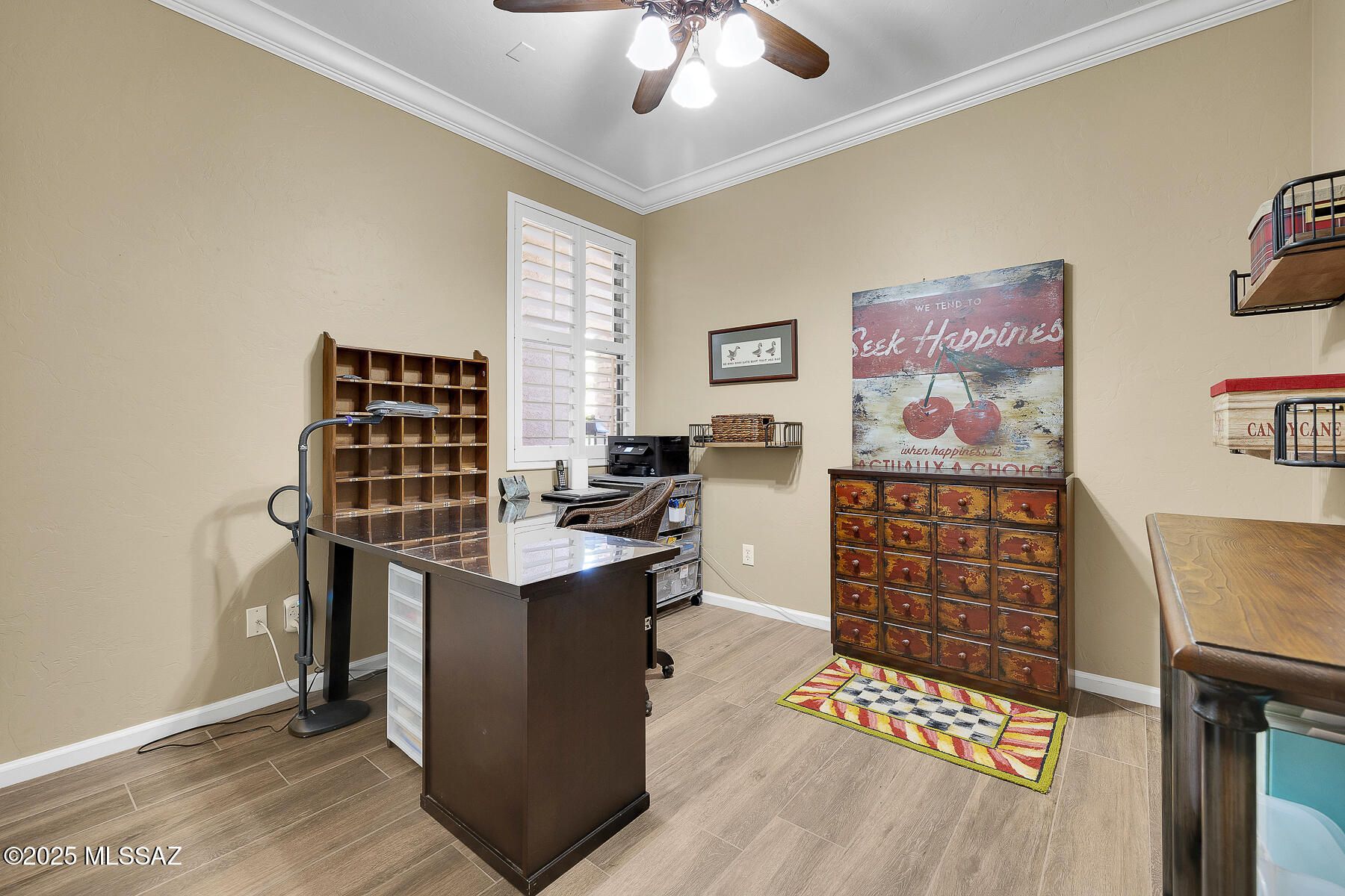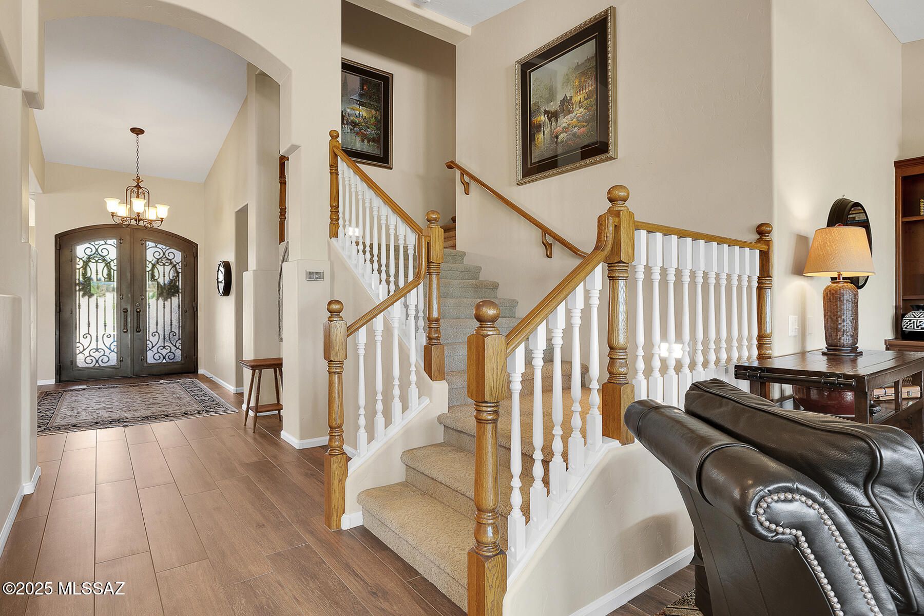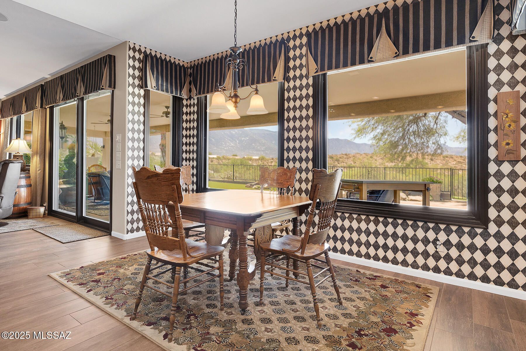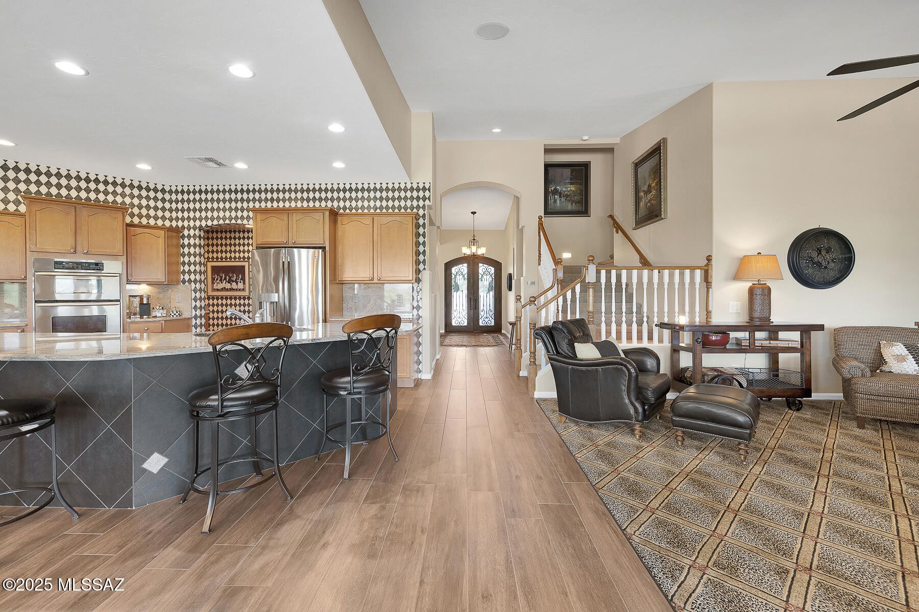 SPECTACULAR DESERT LIVING at this stunning, well cared for and highly updated Durango plan in SaddleBrooke's 55+ Active Adult Community. Boasting panoramic golf course and mountain views, you'll enjoy 3,157 sq ft of formal & informal living space. Elegant Owner's suite, office/2nd bedroom and full hall bath on main level plus two additional guest rooms and full bath on upper level. Plantation shutters and granite countertops throughout plus woodgrain ceramic plank tile with plush carpet interspersed. Entertain in the formal living space off foyer or relax in the open concept gathering room at rear of home highlighted by wall-to-wall entertainment center, ceiling speakers, 8' wide patio slider and Pella view windows with built-in blinds. Gourmet kitchen hosts large, curved island with bar