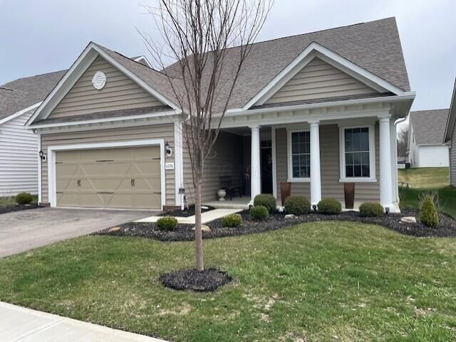 Welcome to this beautifully upgraded, move-in-ready model home--better than new--located in the highly desirable 55+ Nottingham Trace community. Step inside to a bright, airy open-concept layout designed for both comfort and entertaining. At the front of the home, a private den with elegant French doors provides the perfect space for a home office or quiet retreat. The gourmet kitchen is a standout feature, boasting 42-inch cabinetry, quartz countertops, stainless steel appliances, a tiled backsplash, gas cooktop, walk-in pantry, and a large center island ideal for gatherings. Under-cabinet lighting adds a warm, inviting ambiance throughout the space. Gorgeous wood flooring flows seamlessly from the entry through the great room, dining area, and into the light-filled four-season room--perfect for year-round enjoyment. The spacious owner's suite offers a custom California closet and a luxurious en-suite bath complete with dual vanities and a tiled walk-in shower with built-in seating. A thoughtfully designed split floor plan places the second bedroom and full bath on the opposite side of the home, providing privacy for guests. Additional highlights include a built-in cubby for extra storage just off the two-car garage, as well as inviting outdoor spaces with both a front porch and rear patio--ideal for morning coffee or relaxing evenings. Residents enjoy access to exceptional community amenities including a clubhouse, fitness center, pickleball courts, and bocce courts. Conveniently located just minutes from freeway access, the airport, hospitals, shopping, grocery stores, and Easton.
