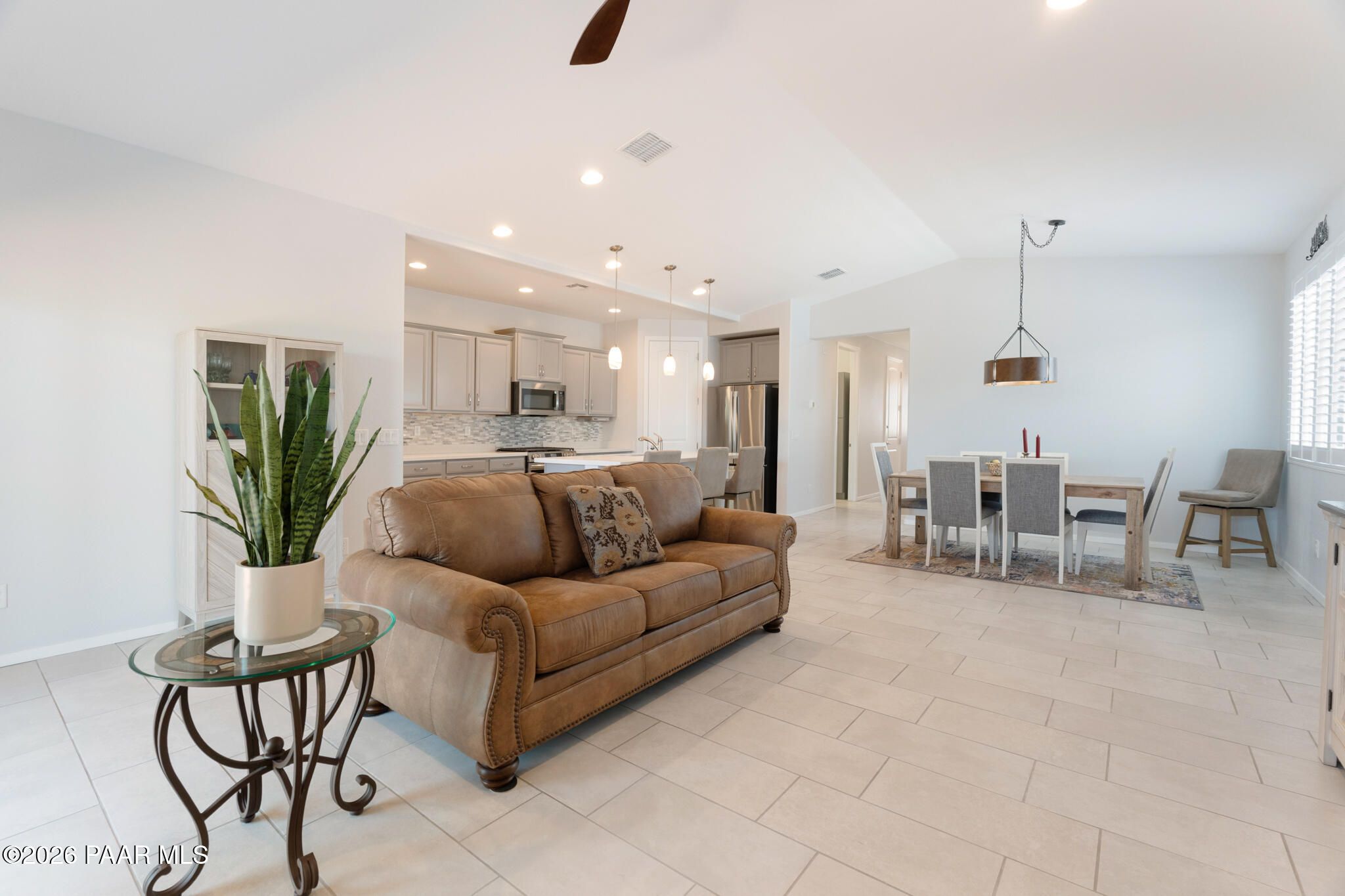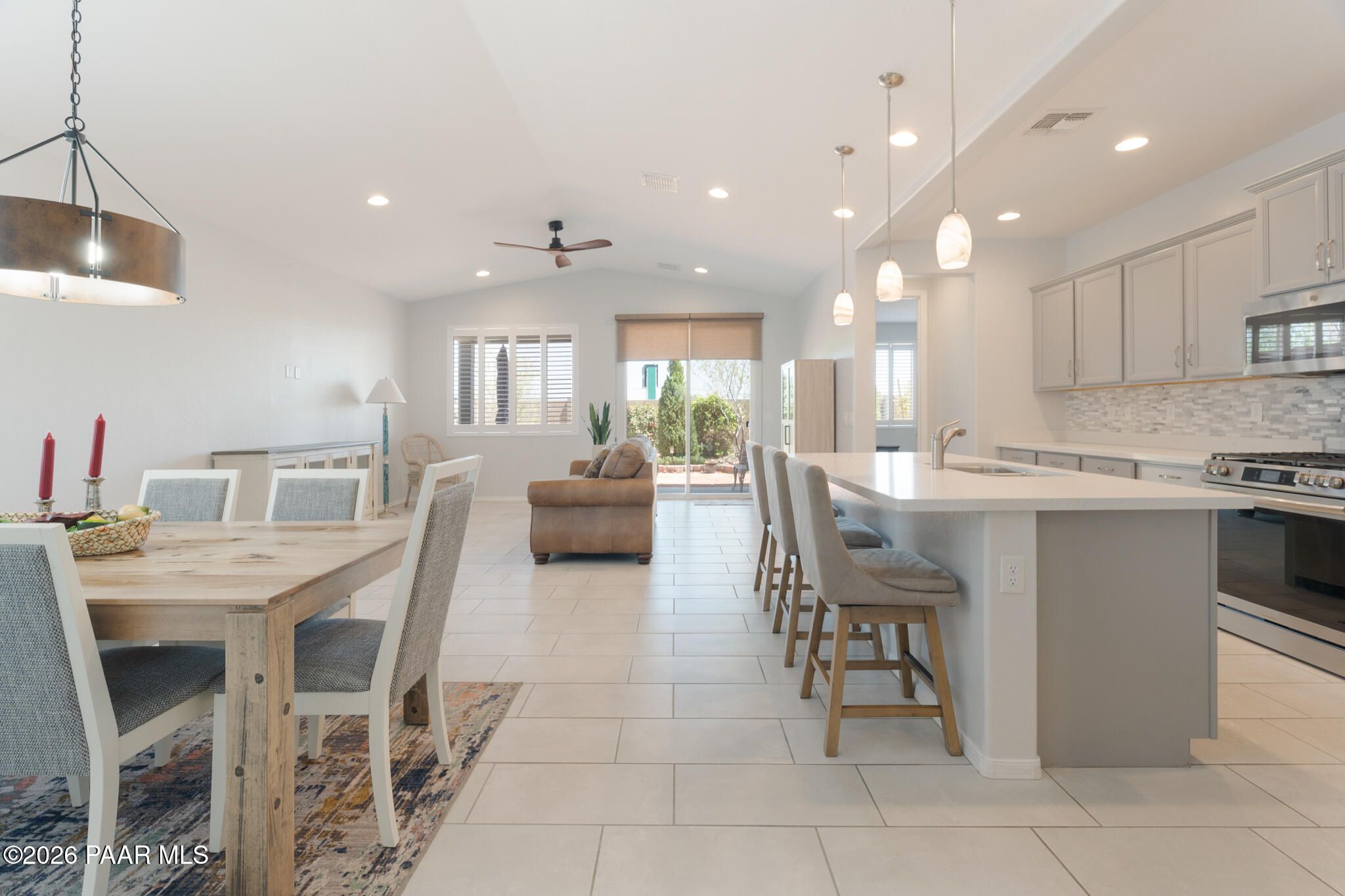 Nestled in the Saddlewood, this is a stunning single-story home that is loaded with upgrades and is truly move-in ready from day one. The stucco exterior with stone accents, 3-car tandem garage, and professionally landscaped front yard create exceptional curb appeal, especially set against the warm high desert landscape.Inside, the open-concept great room flows seamlessly into the dining area, making the space feel expansive and welcoming. Vaulted ceilings, recessed lighting, shutters throughout, and tile flooring give the living and dining areas a polished, model-home feel. A sliding glass door draws your eye straight through to the backyard, filling the space with natural light.The kitchen is a true centerpiece of this home, featuring gray shaker-style cabinetry, quartz countertops, a striking mosaic tile backsplash, a large center island with bar seating, pendant lighting, stainless steel appliances including a gas cooktop and built-in microwave, a deep undermount sink, and a pantry for added storage. The kitchen opens directly to both the dining and living areas, making it ideal for everyday living and entertaining alike.The primary bedroom is generously sized with plush carpet, shutters, a ceiling fan, and a walk-in closet with built-in shelving. The ensuite bathroom offers dual sinks with matching gray cabinetry, quartz counters, and a large walk-in shower with glass sliding doors, and dual showerheads.Two additional bedrooms, each with ceiling fans and carpet, offer flexibility as guest rooms, a home office, or a den. A well-appointed second full bathroom serves these rooms with a single vanity, tub/shower combo, and tile flooring.The dedicated indoor laundry room is finished with gray upper cabinetry for storage and includes a front-loading washer and dryer set on tile floors.Out back, the covered patio with overhead and ground level lighting provides the perfect spot for your morning coffee, and the flagstone hardscape extends throughout the private, fully fenced backyard. Lovingly landscaped planting beds are lined with trees, ornamental shrubs, and flowering plants. The combination of the covered patio and open flagstone courtyard makes this outdoor space as livable as the interior.