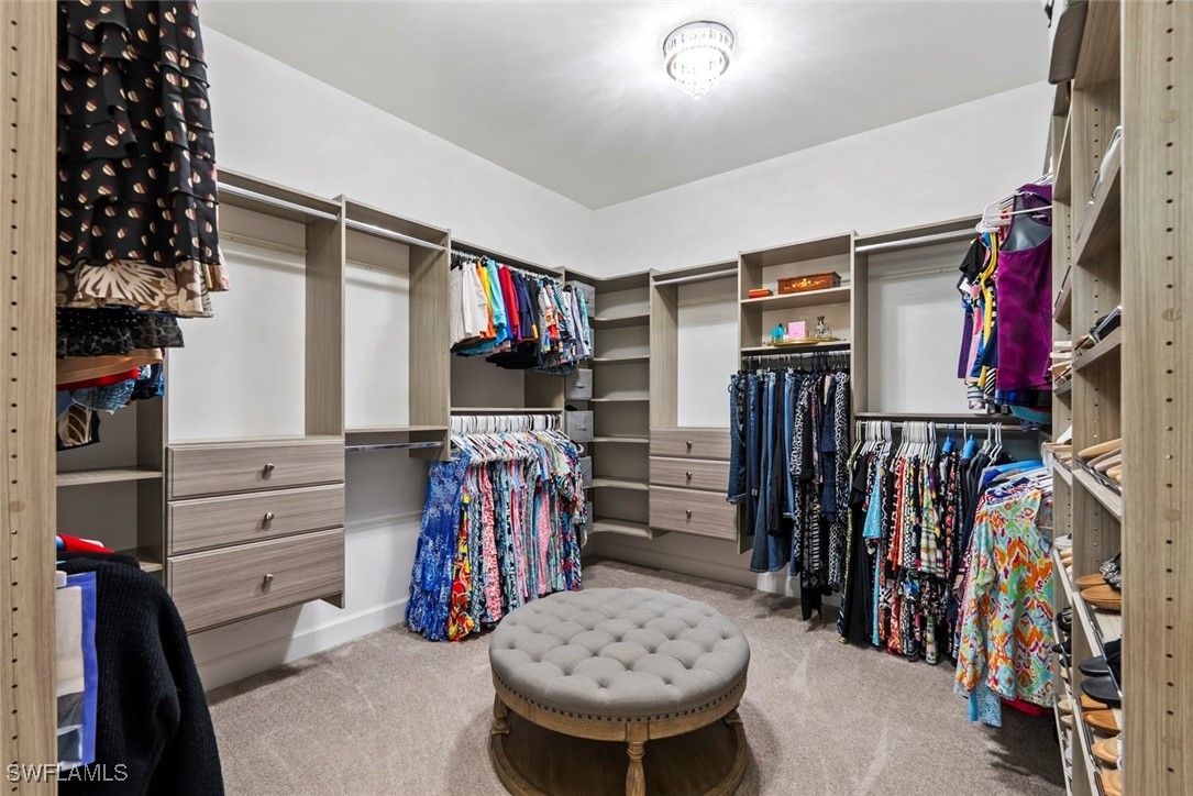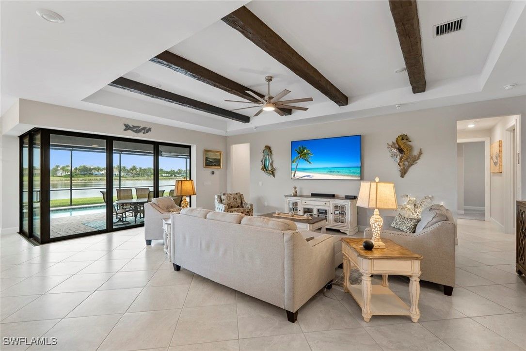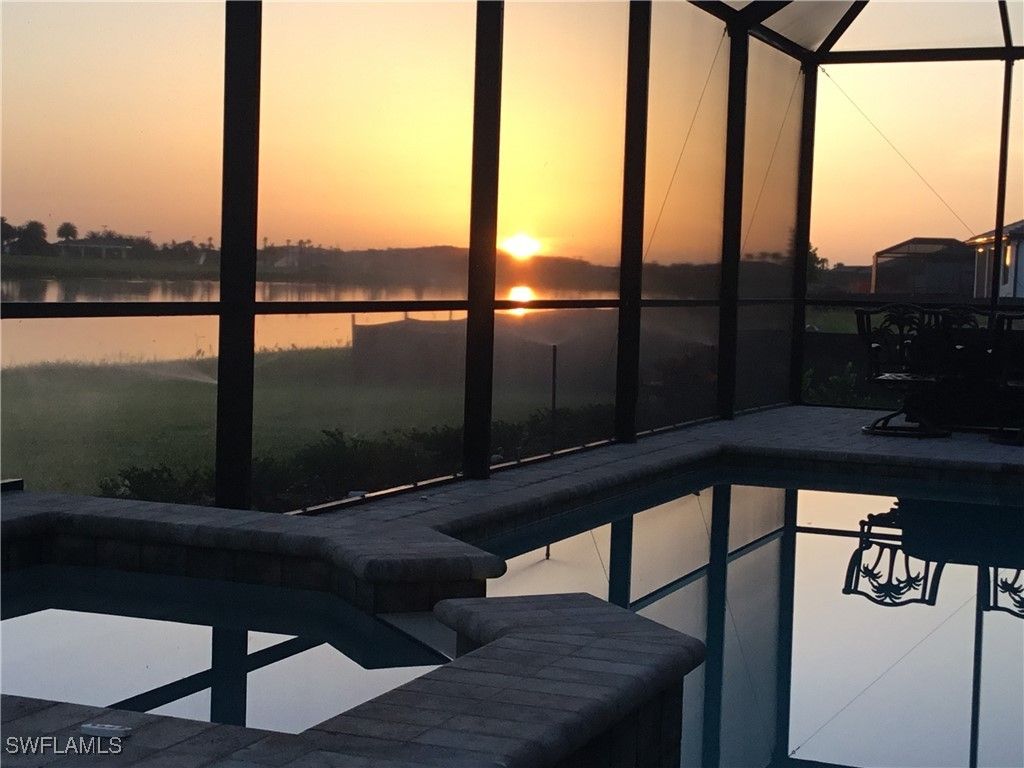 This one-of-a-kind LUXURY RESIDENCE offers a truly exceptional setting with serene WATER VIEWS ON THREE SIDES, sunrise and sunset vistas, and a POOL & SPA, all within the 55+ Del Webb Naples community and short distance to all amenities. Better than new construction, this stunning STELLAR floor plan, built in 2023, delivers the refined Florida lifestyle today’s luxury buyers are seeking. The home features three bedrooms, three full baths, and a den, showcasing elevated finishes and meticulous care throughout. The DESIGNER KITCHEN is both elegant and functional, offering soft-close cabinetry with pull-out drawers, UPGRADED APPLIANCES, a large entertaining island, SILGRANIT sink, BEVERAGE CENTER, CUSTOM PANTRY, and ZERO CORNER SLIDERS that create seamless indoor-outdoor living. Additional highlights include upgraded interior paint, DESIGNER LIGHTING, a Sonos sound system, custom WINDOW TREATMENTS, and upgraded bedroom carpeting. The luxurious PRIMARY SUITE features a spa-like bath with floor-to-ceiling tiled shower, upgraded shower head, dual sinks, upgraded lighting, and a CUSTOM CLOSET system. Step outside to your private retreat, where the screened-in SALTWATER HEATED POOL & SPA with remote access overlooking a WIDE LAKE VIEW, enhanced by "Florida glass" and lush landscaping for added privacy. The LANAI is fully equipped for year-round enjoyment with Sonos surround sound, the furniture, a fire pit, and TV, are INCLUDED making it ideal for relaxing or entertaining. Storm Smart ELECTRIC HURRICANE SCREENS and IMPACT WINDOWS provide added convenience and peace of mind. The Seller is also offering a one-year Platinum HOME WARRANTY. Completing the home is an OVERSIZED 3 CAR GARAGE with a 4' extension, featuring epoxy floors, shelving, an EV charger, and smart openers. Furniture and golf cart are negotiable, with lanai furniture, den, and guest en-suite furniture included. There are many more upgrades and features to see! This home comes with the SOCIAL MEMBERSHIP, but take note GOLF LOVERS, Panther Run Golf Club offers optional MEMBERSHIPS with premium golf experiences just steps from your backyard. In Del Webb Naples, you’ll enjoy WORLD-CLASS AMENITIES that rival luxury resorts: dine at the Rusty Putter Restaurant, soak in the RESORT-STYLE or LAP POOLS, break a sweat in the state-of-the-art FITNESS CENTER, and play your way through PICKLEBALL, TENNIS, bocce, billiards - even a top-tier GOLF SIMULATOR! Need groceries, church, or a bite to eat? Just hop in your golf cart and cruise into town - Publix and the heart of Ave Maria are just minutes away. This isn’t just a home - it’s a LIFESTYLE UPGRADE in one of Southwest Florida’s most vibrant 55+ communities. Don’t miss your chance to live where fun, fitness, and friendships flourish year-round!